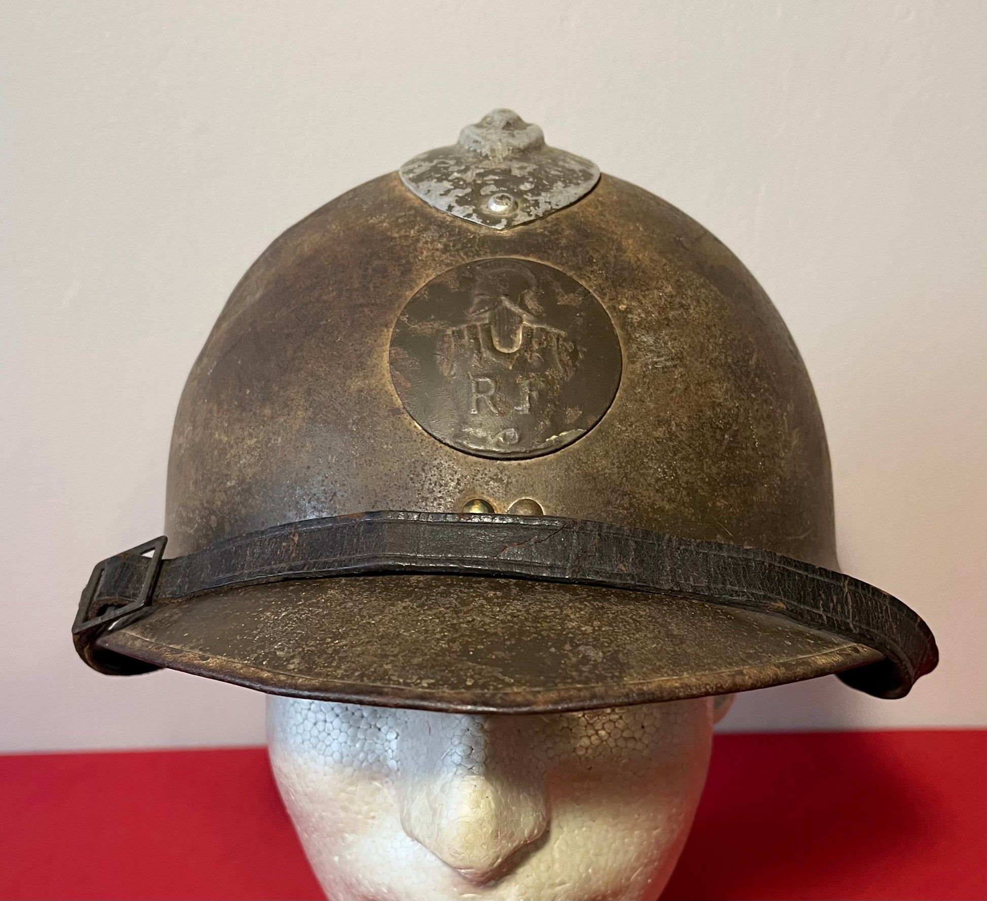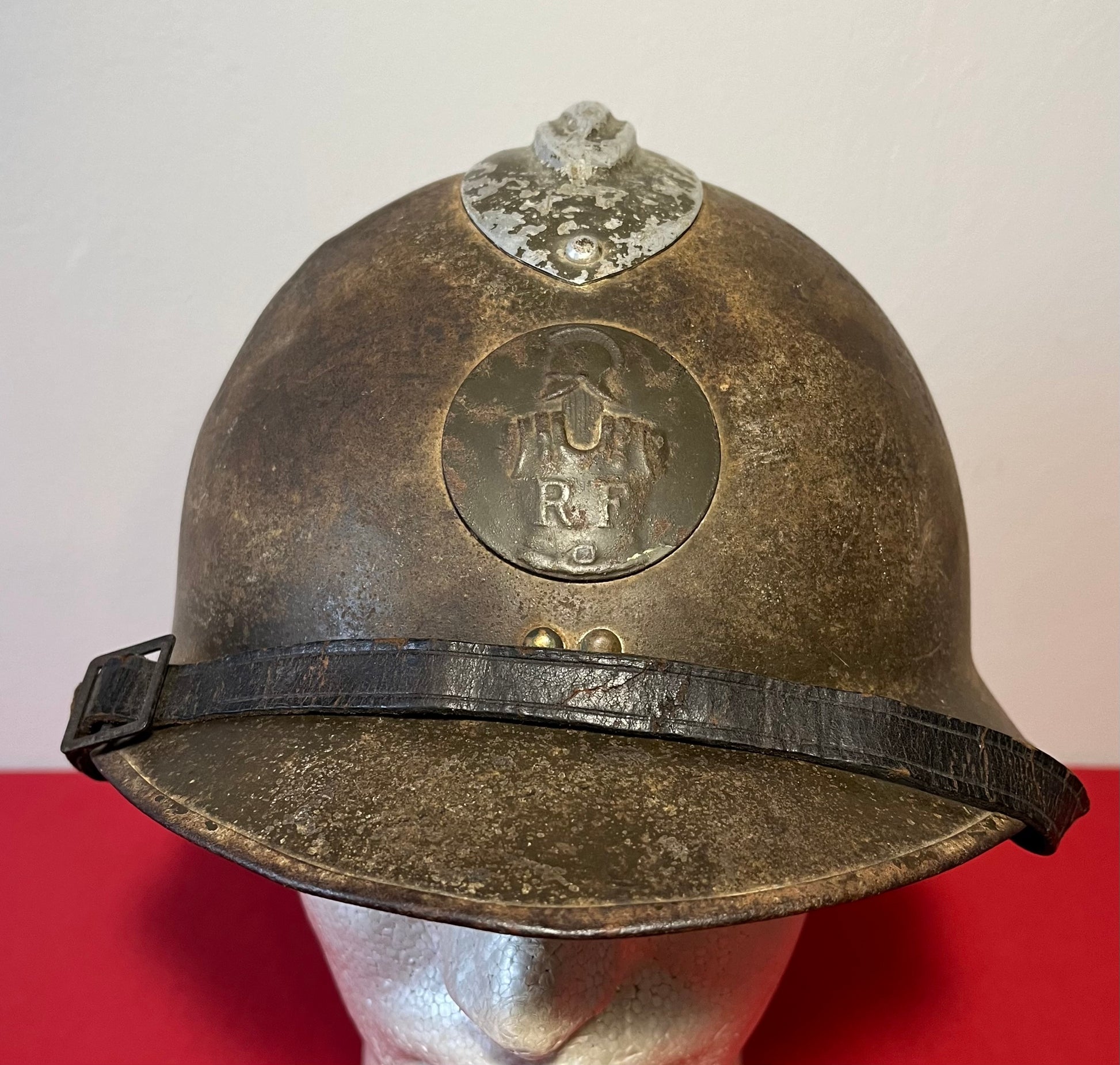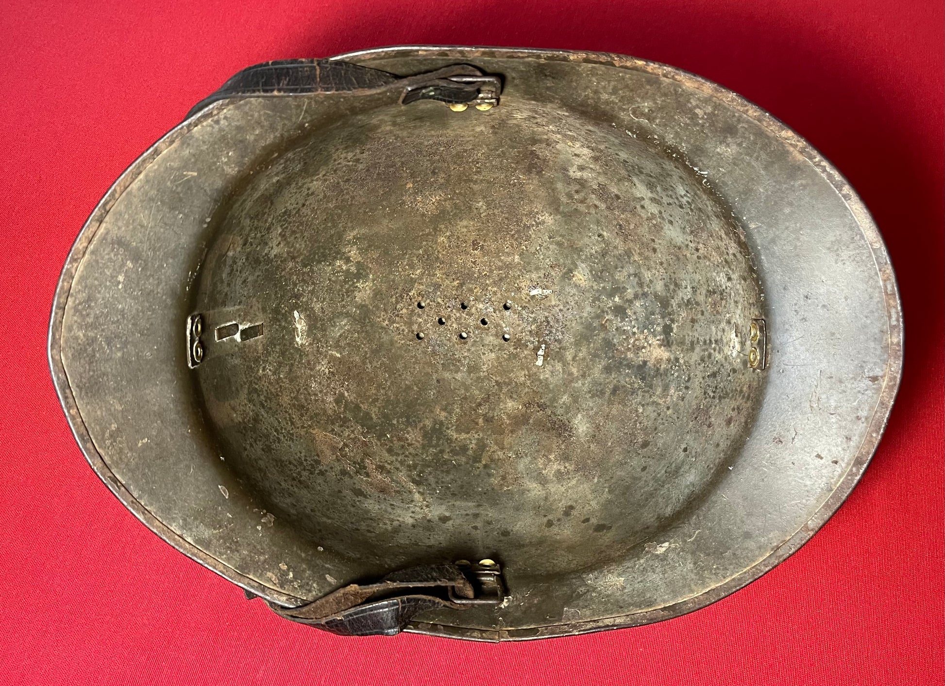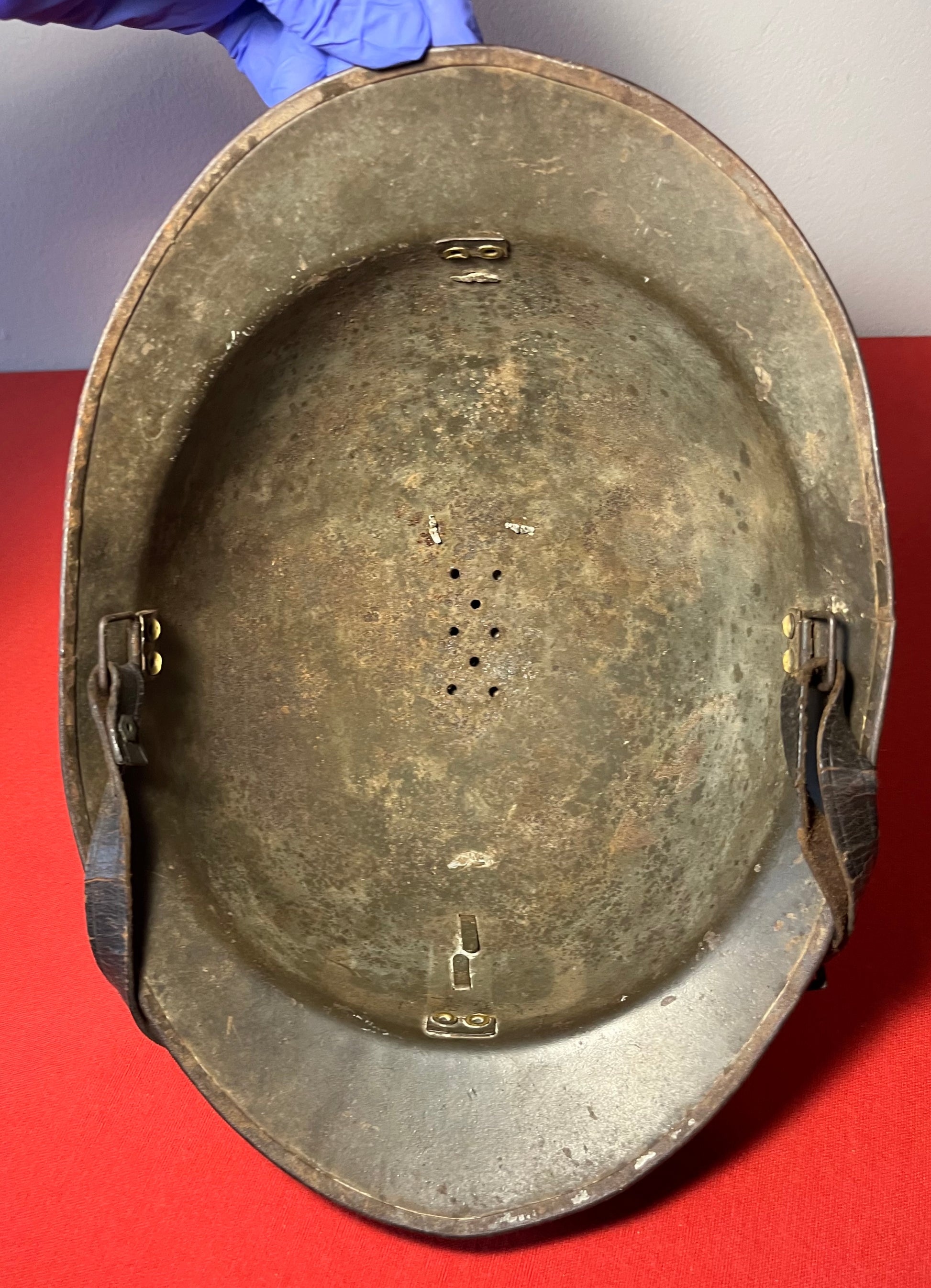 RF (République Française) marked Engineer's badge attached to the front / Leather chinstrap still in place / Model 1926 / Traces of original green paint / Authentic WW2 / No liner inside