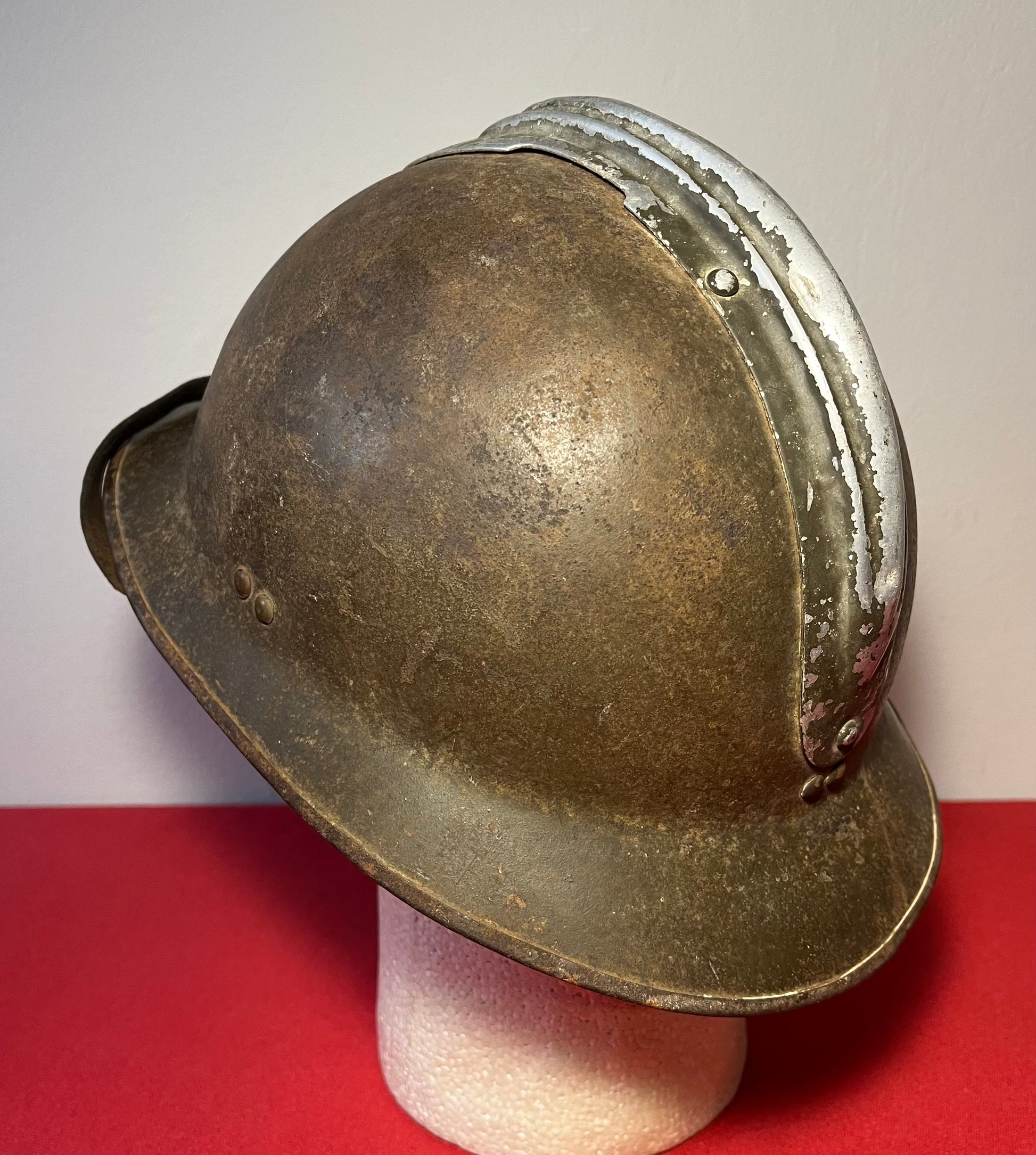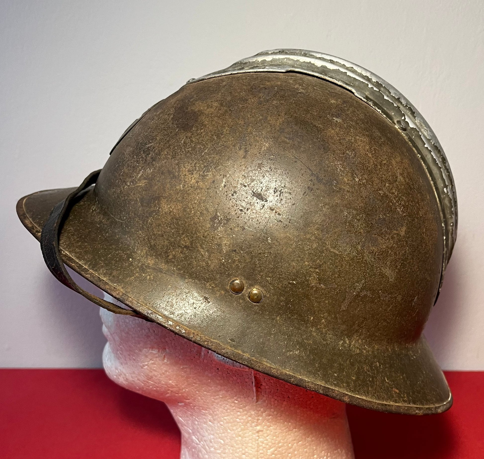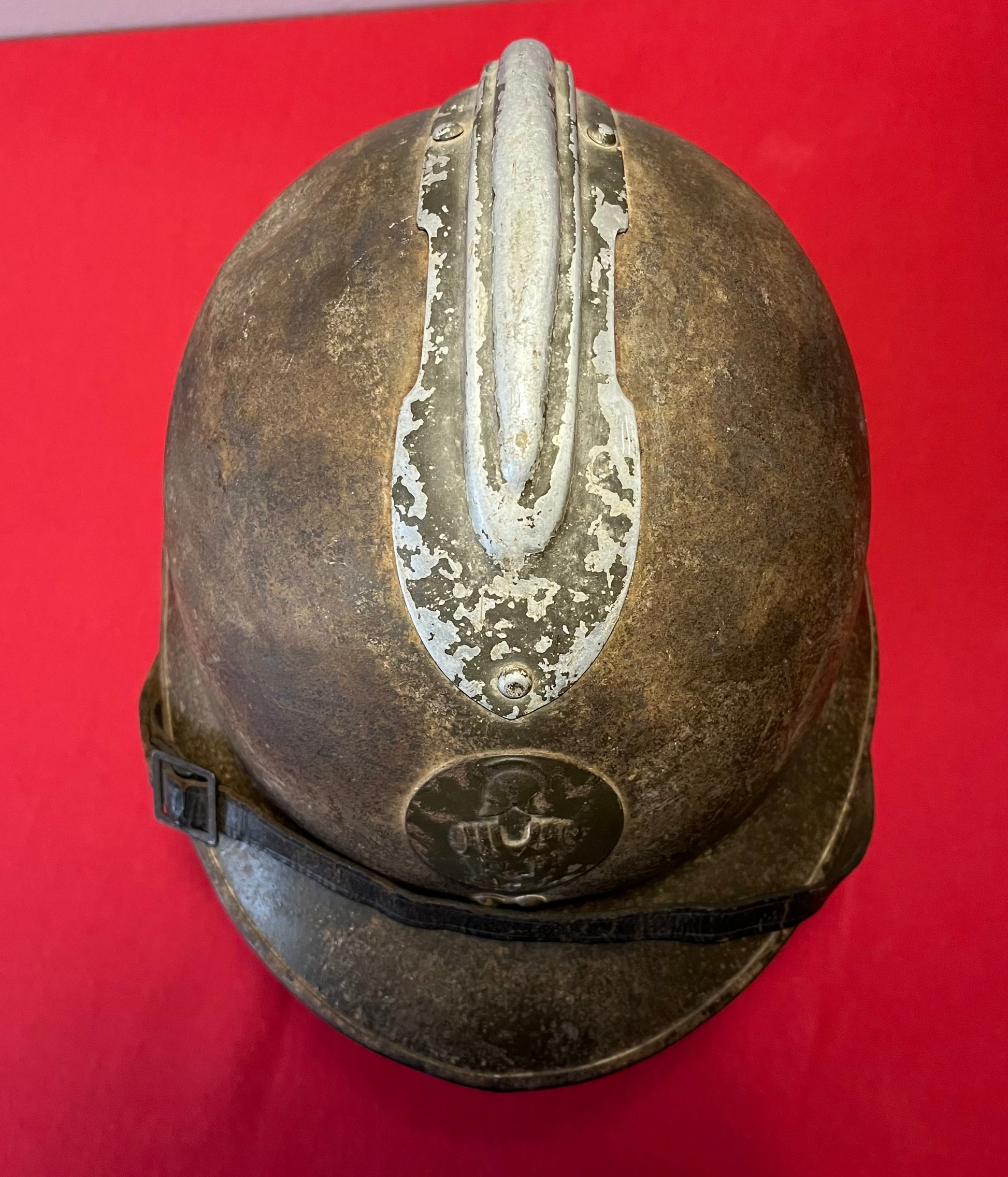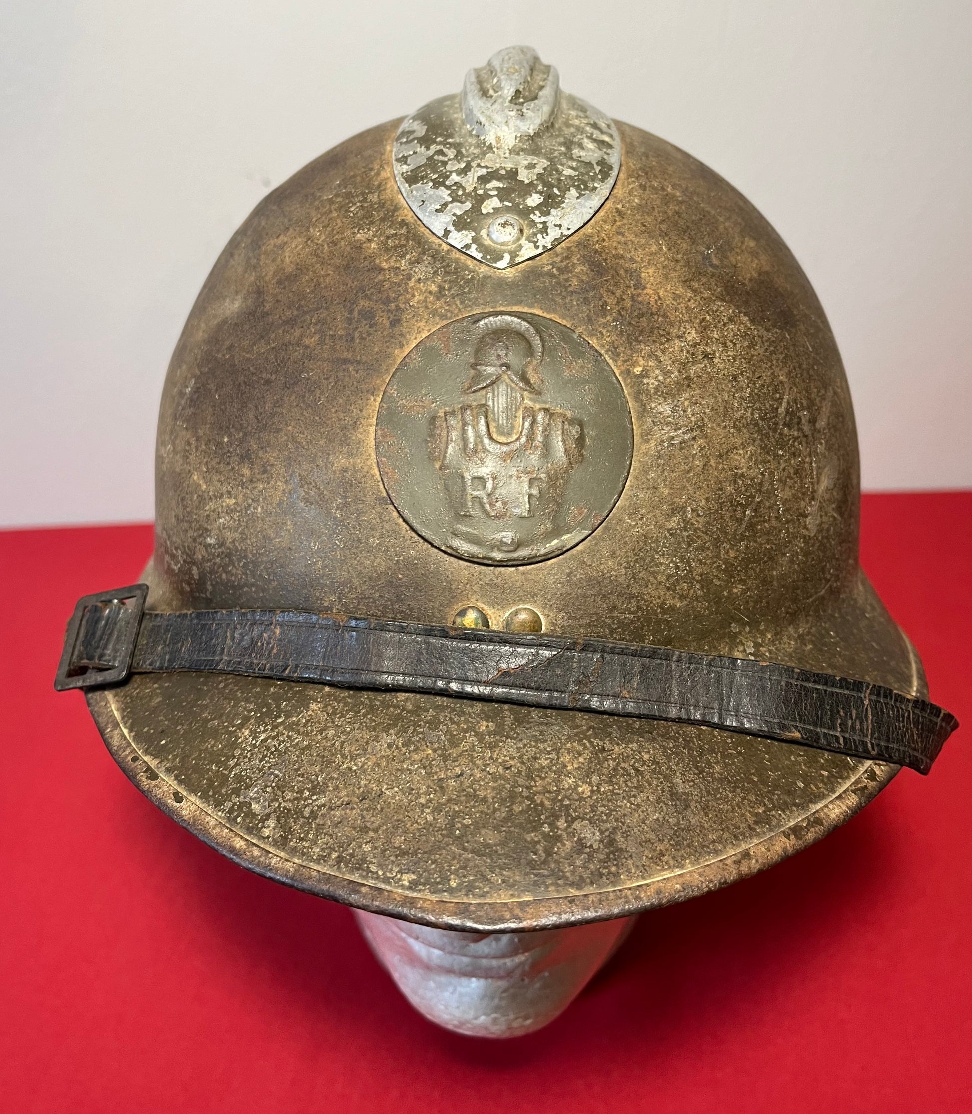 RF (République Française) marked Engineer's badge attached to the front / Leather chinstrap still in place / Model 1926 / Traces of original green paint / Authentic WW2 / No liner inside