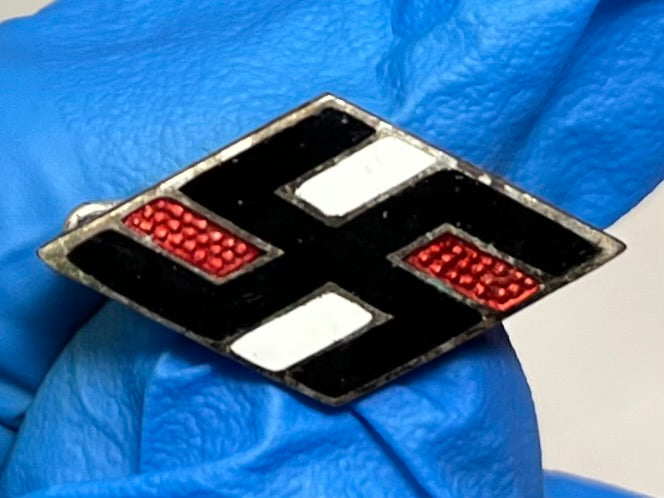 The NSDStB, “National Sozialistische Deutscher Studentenbund” (National Socialist German Students’-league) was originally formed as a semi-autonomous organization in 1926, infiltrating the majority of institutions by 1930, and was under full control of the Nazi Party by 1934. A cast lapel pin, in the form of an elongated diamond, 23mm tall and 15mm wide, within which is a mobile swastika. Red, black and white enamel work (some loss on the red area) . A vertical pin-back device is to its reverse.