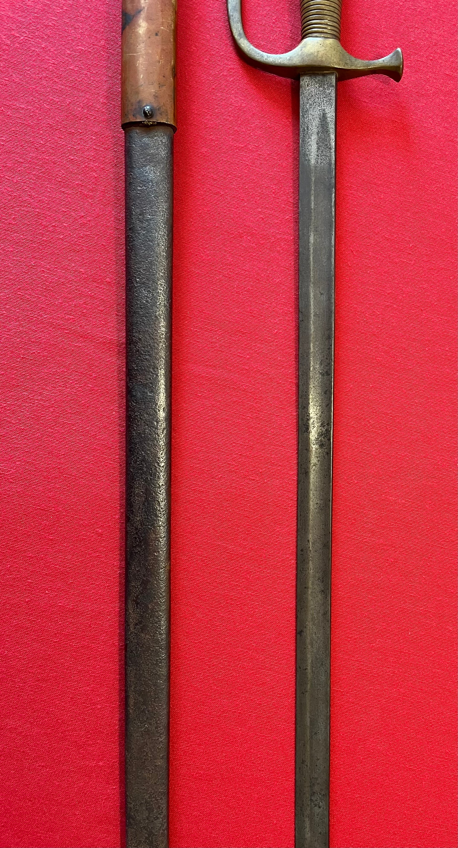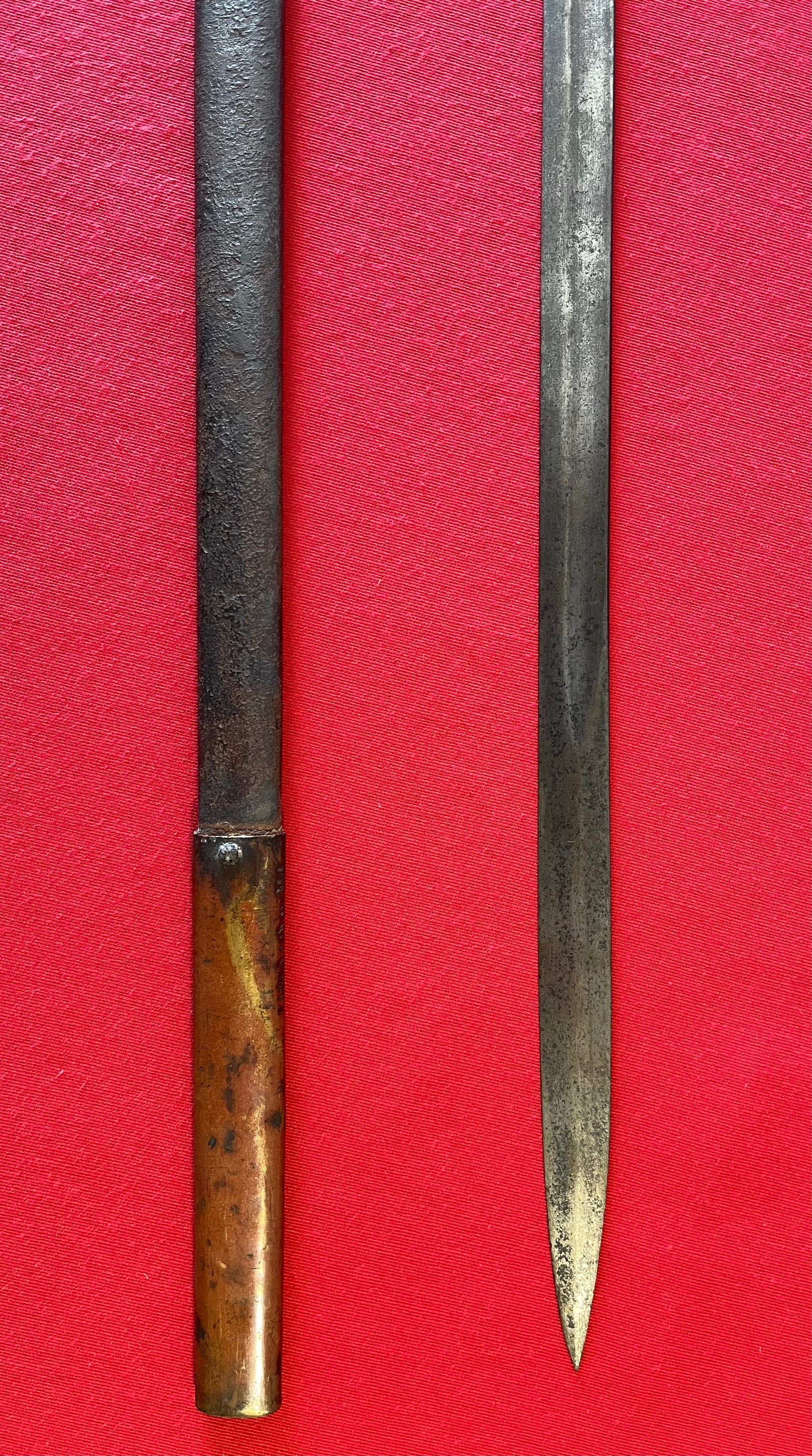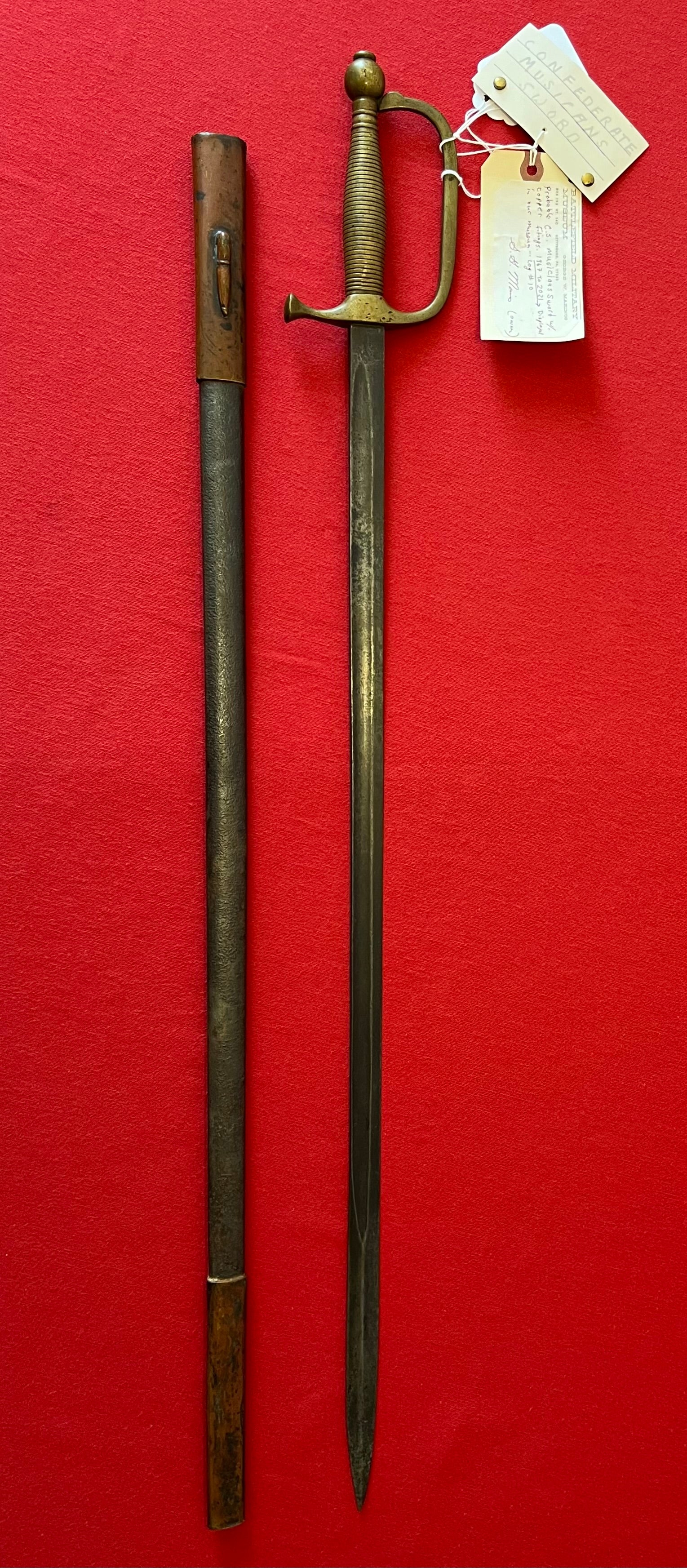 The sword has an overall length of 34 Inches / Blade length of 28 Inches / Scabbard length of 32 Inches / The scabbard has light traces of leather still present within its copper fittings which is customary for confederate swords to have / The sword blade has a wonderful dark patina with an unstopped fuller also corroborating its confederate production / Listed in the pictures is another online listing with no scabbard for an interested buyer's reference (Which ours has)