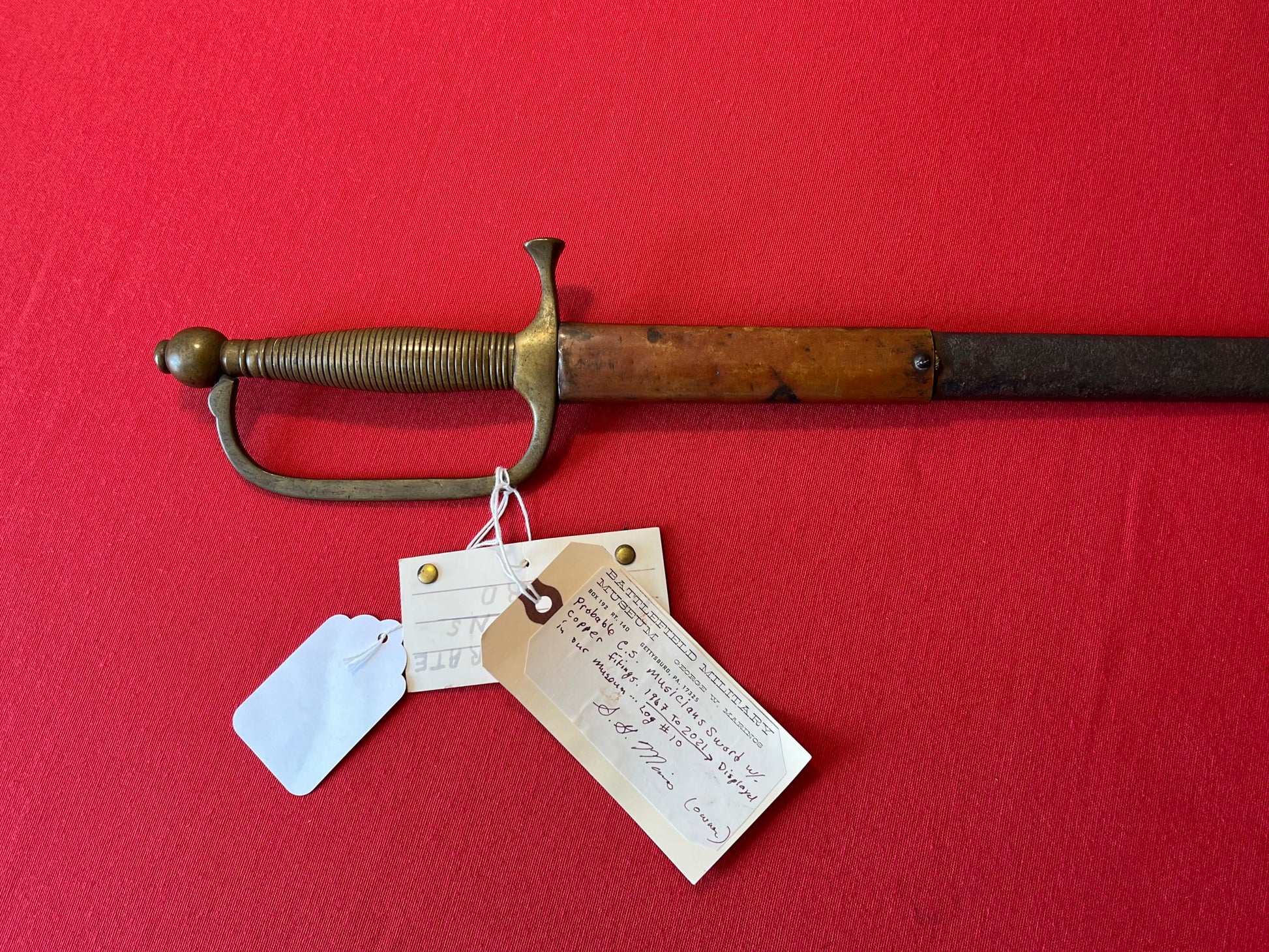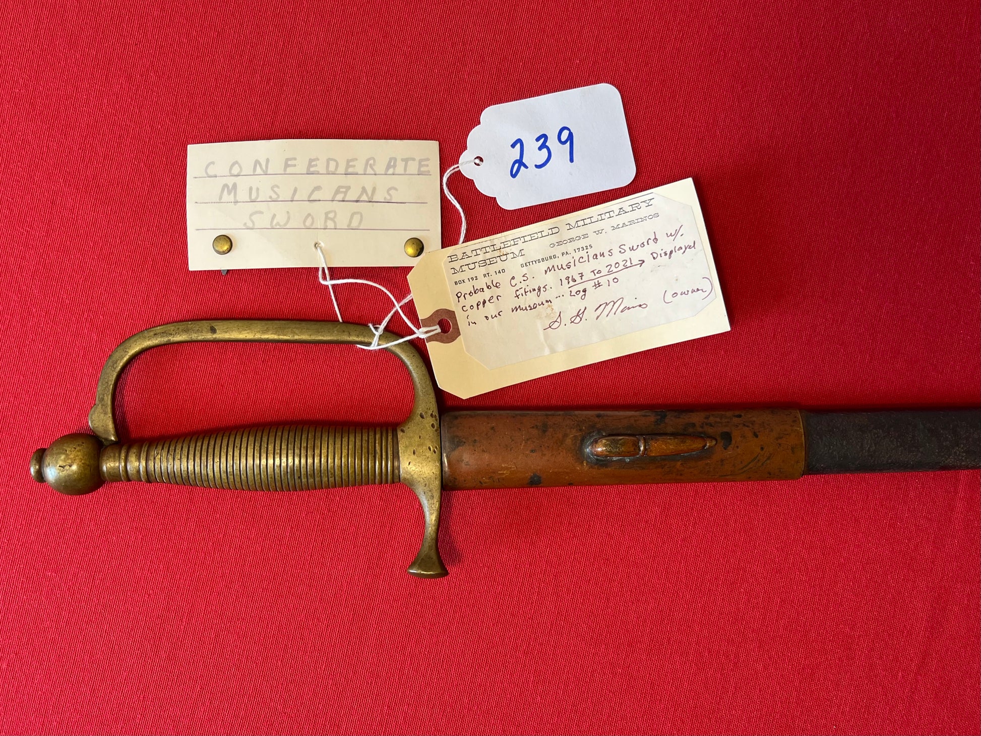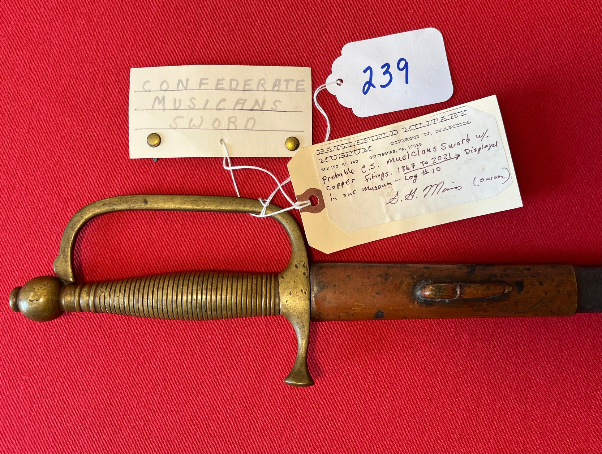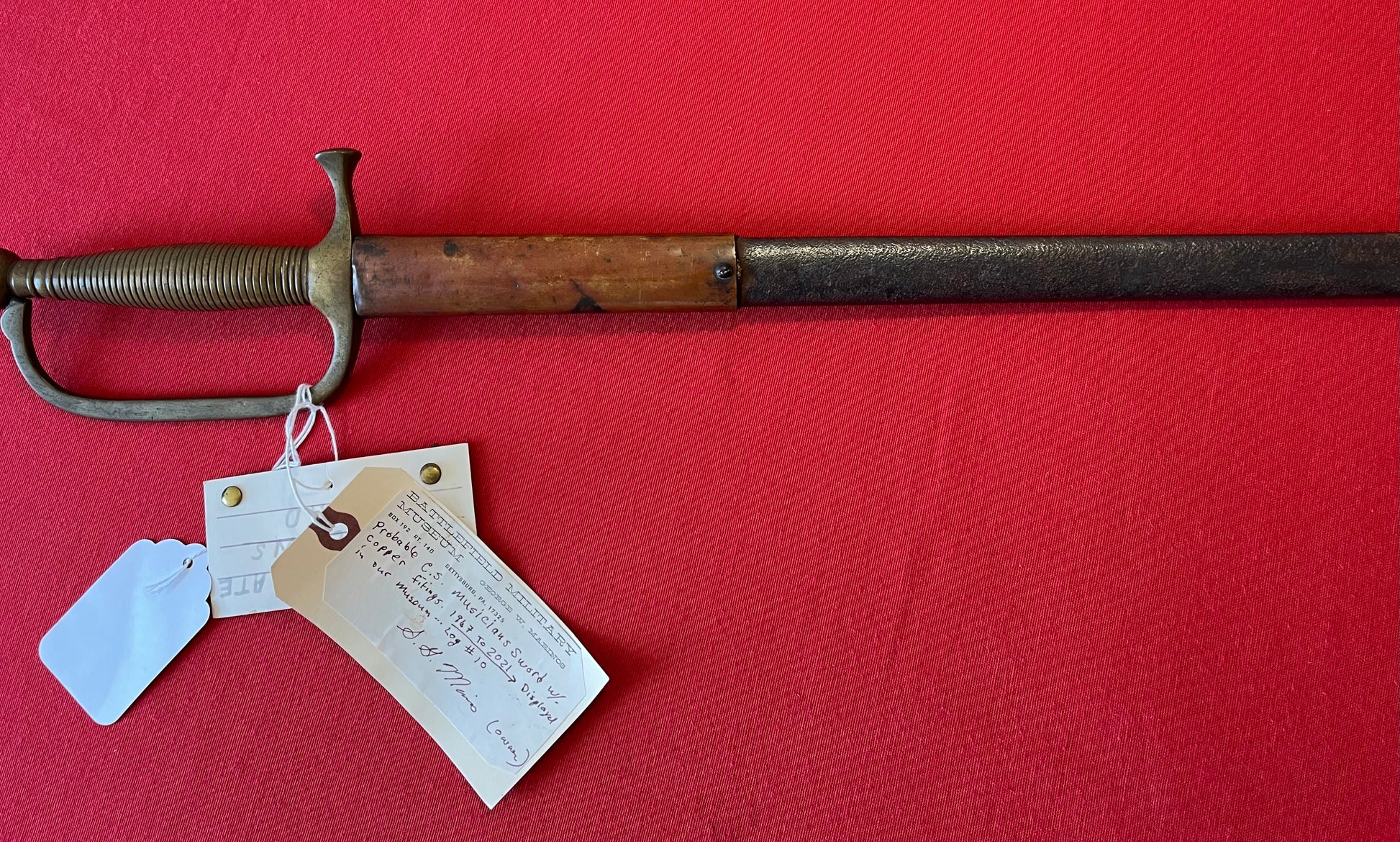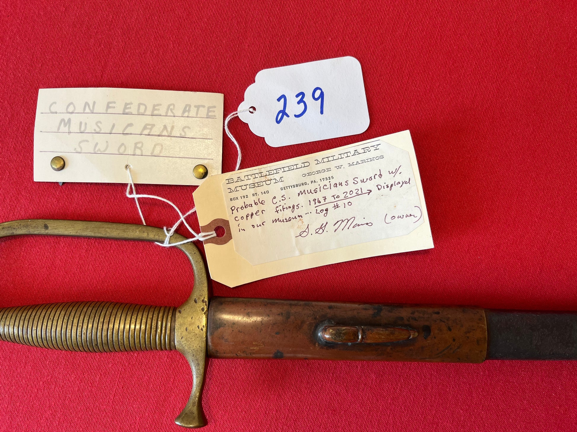 From the Battlefield Military Museum in Gettysburg, Pa / This sword was purchased from the auction house charged with the liquidation sale / Auction flyer and tag included in purchase (showing the item number with its classification in the flyer) The sword still retains both of its original museum tags / This sword was displayed in the museum from 1967 to 2021 as the tag indicates and is signed by the museum owner George Marinos / I personally purchased this sword at that sale on Saturday, October the 5th 2024