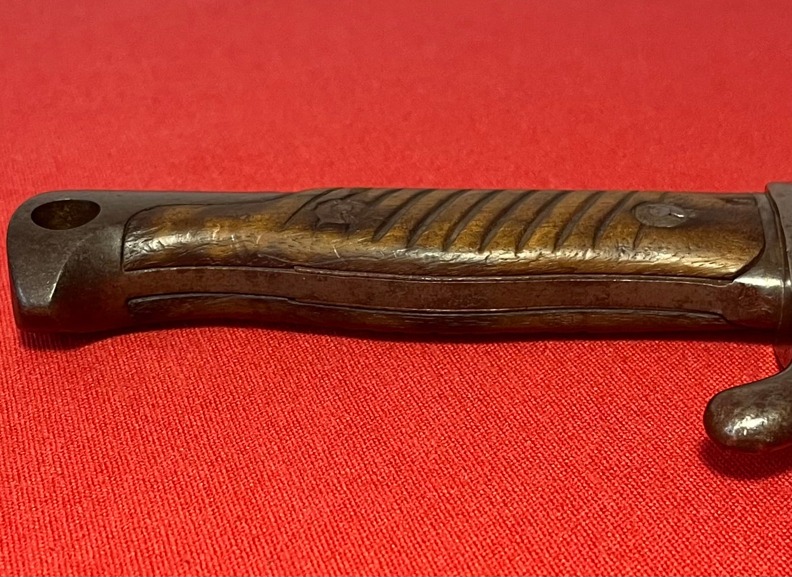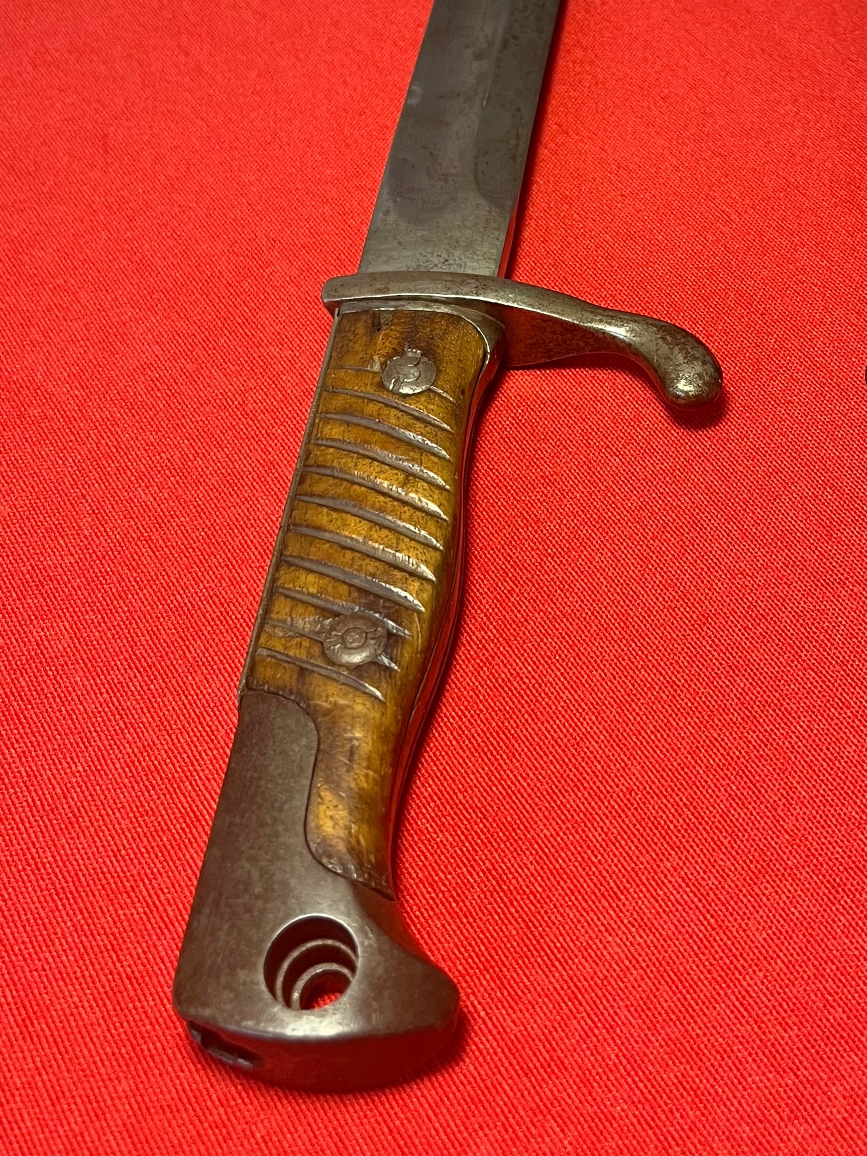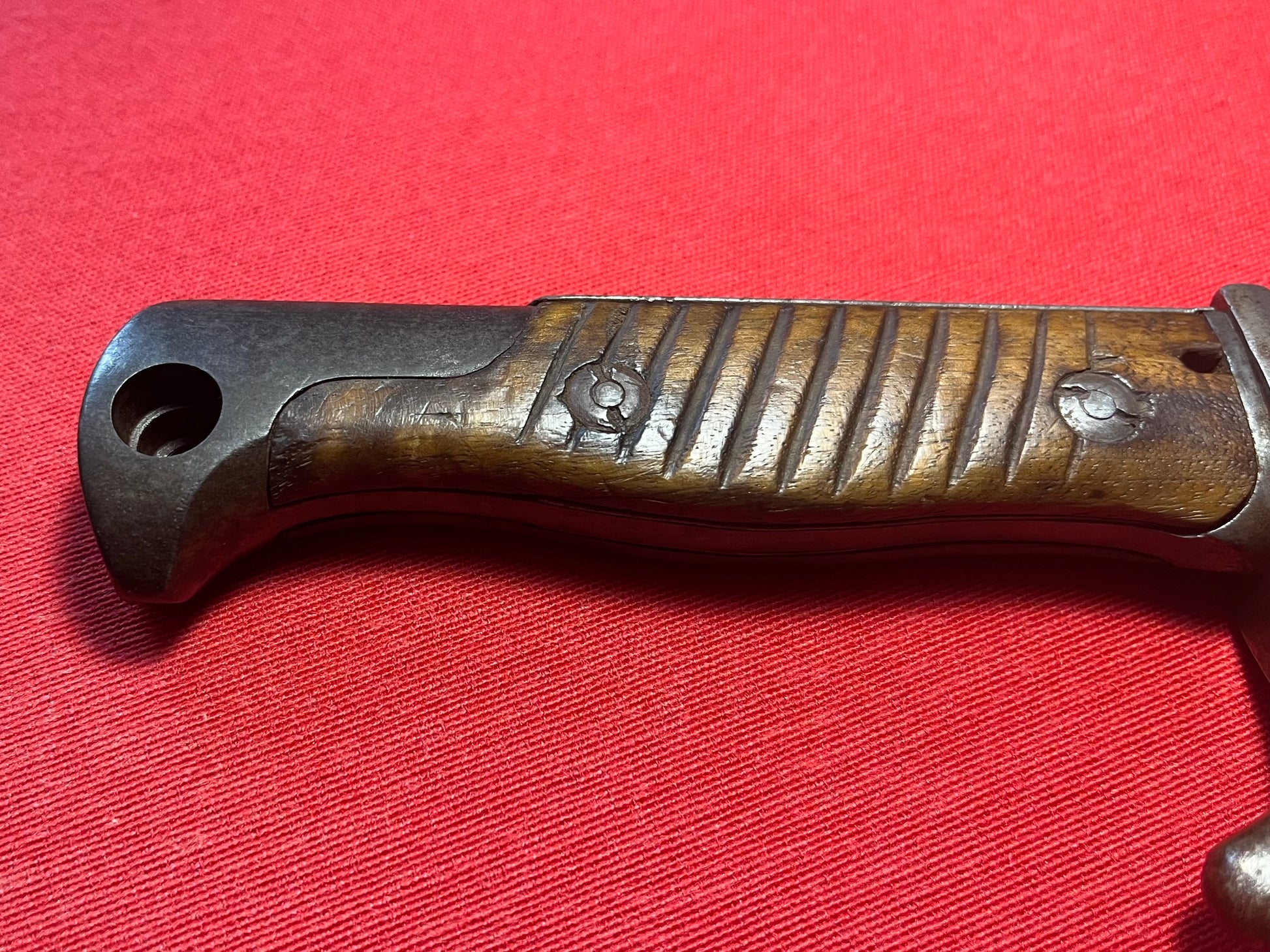 WW1 German / Model 1898/05 bayonet by FERD ESSER & Co. ELBERFELD / Dated 1915 on the spine / Maker mark is nice and bold “scarce” hard to find maker - Made into a fighting knife (The release button has been removed as well as the attachment for the leather frog) “only alterations” The blade has some darker areas, nice and clean and free from rust / The wood grips have a great overall look with some general wear