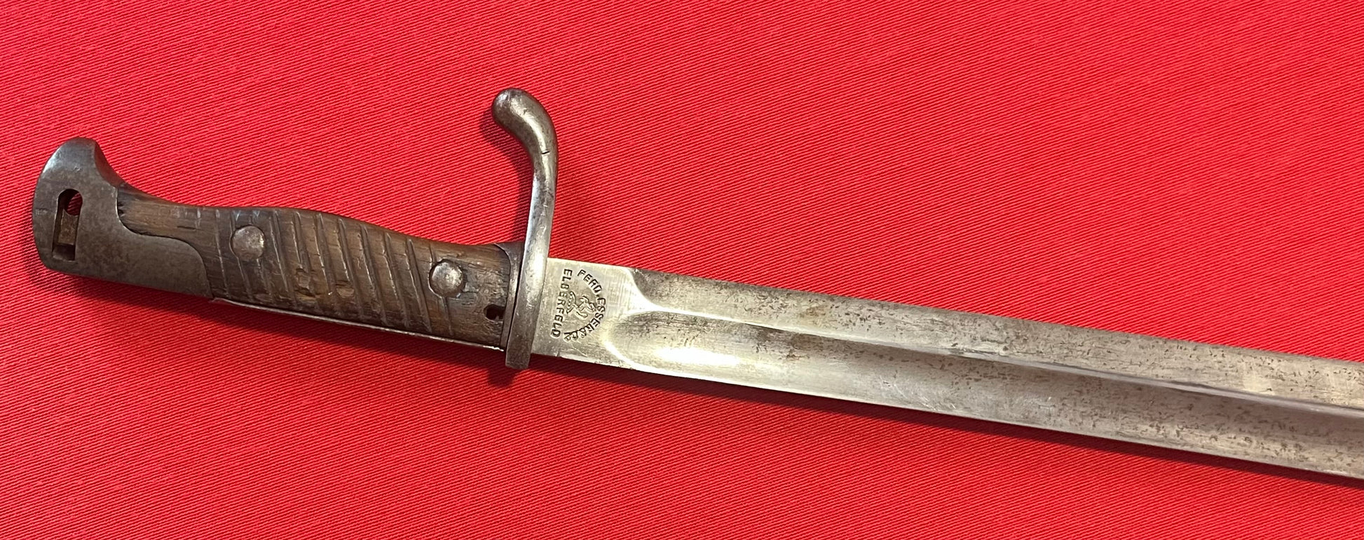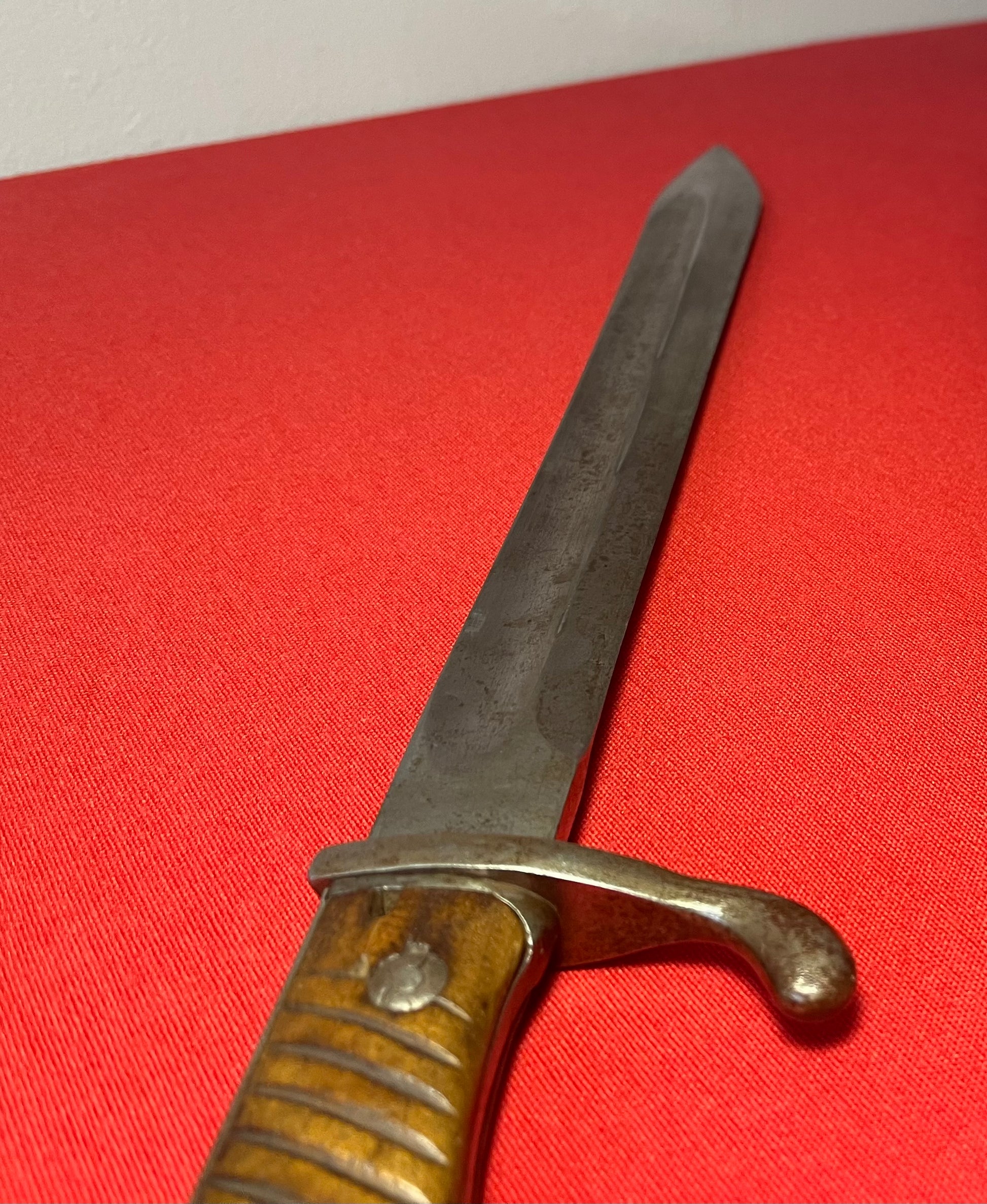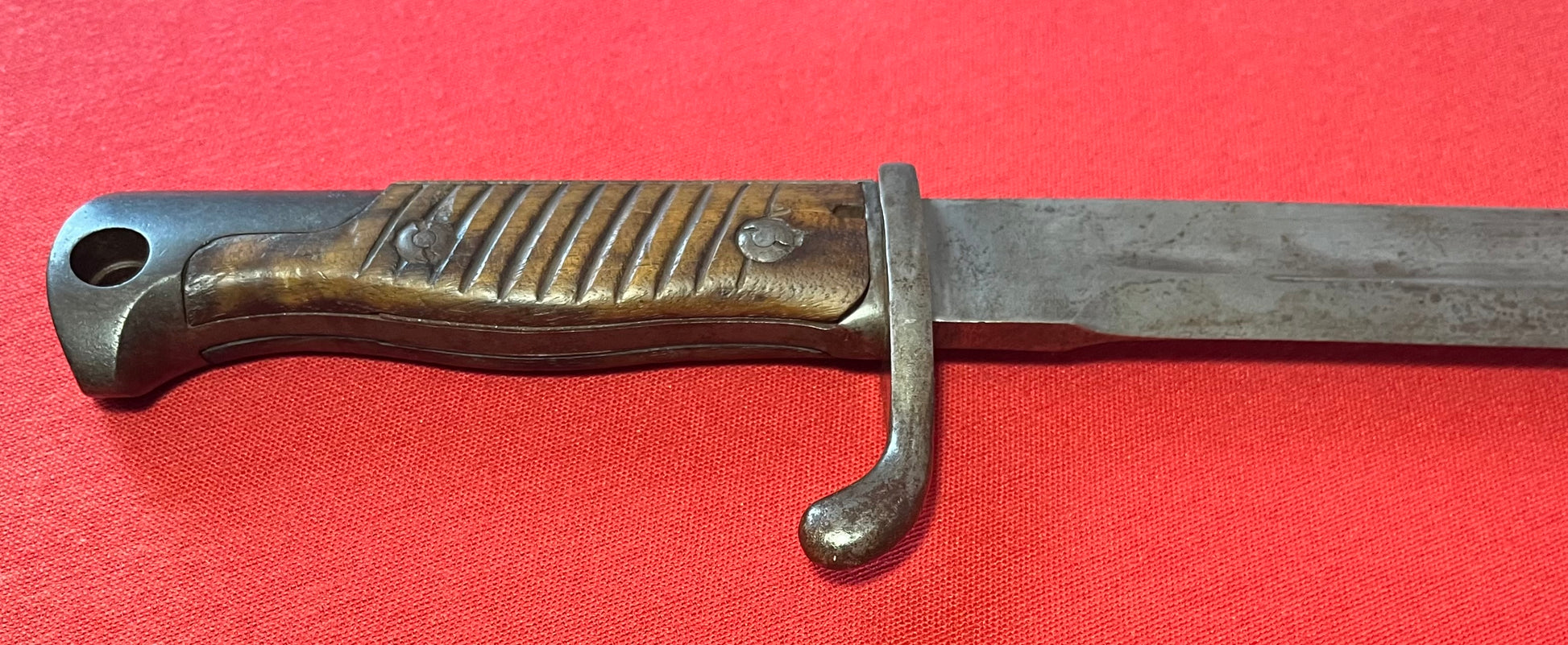 WW1 German / Model 1898/05 bayonet by FERD ESSER & Co. ELBERFELD / Dated 1915 on the spine / Maker mark is nice and bold “scarce” hard to find maker - Made into a fighting knife (The release button has been removed as well as the attachment for the leather frog) “only alterations” The blade has some darker areas, nice and clean and free from rust / The wood grips have a great overall look with some general wear