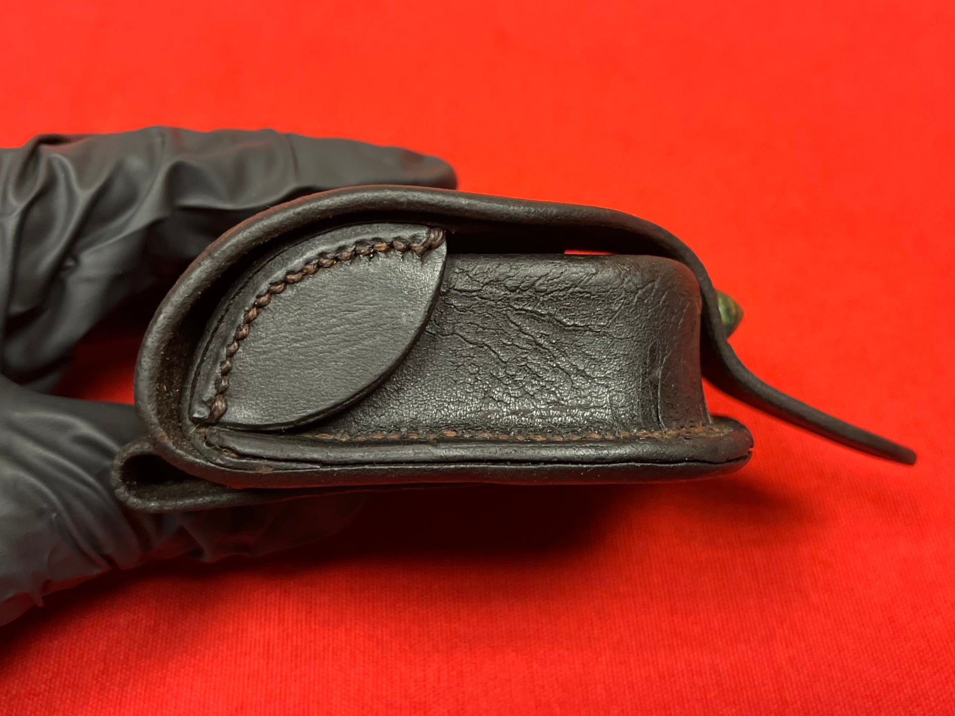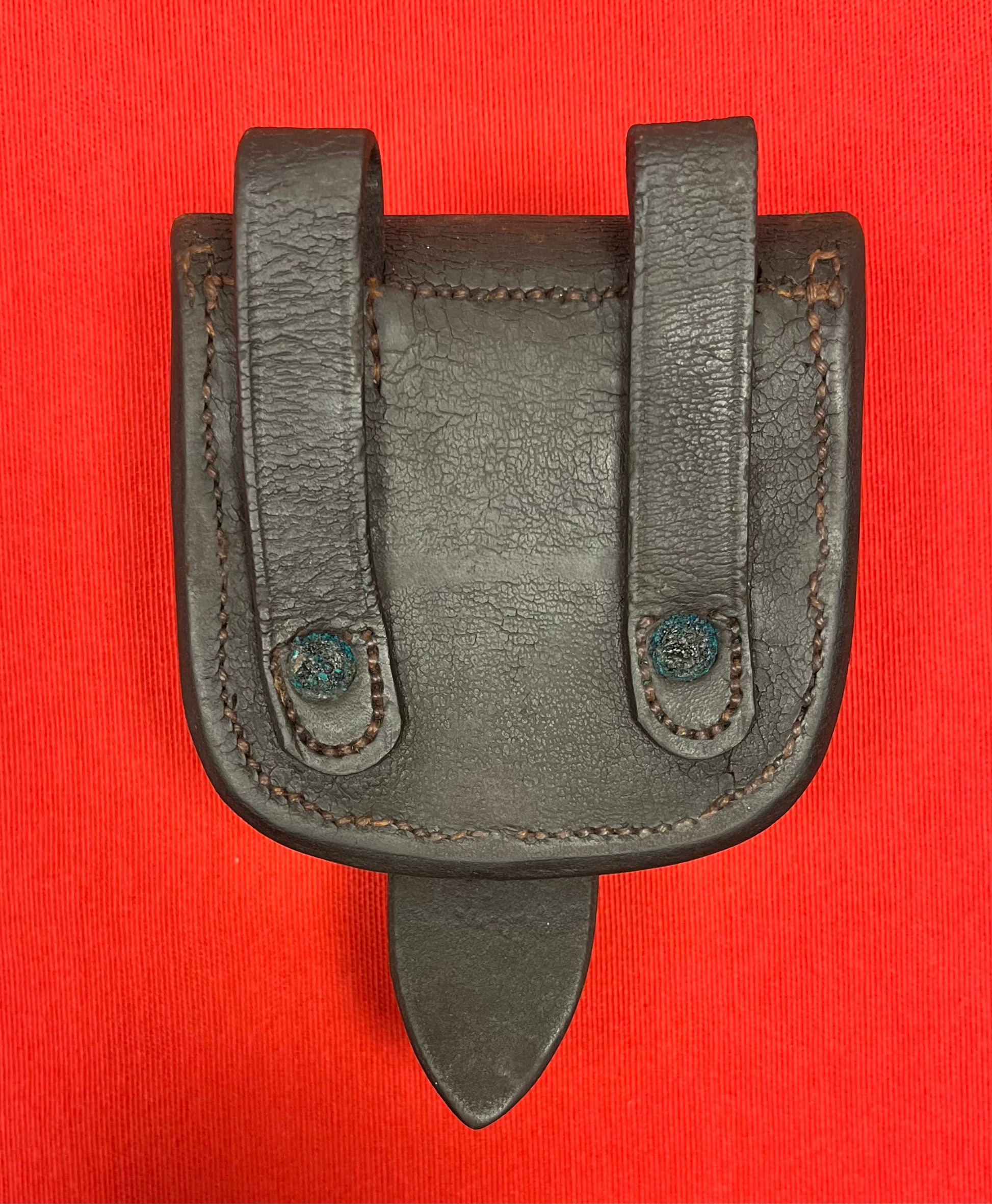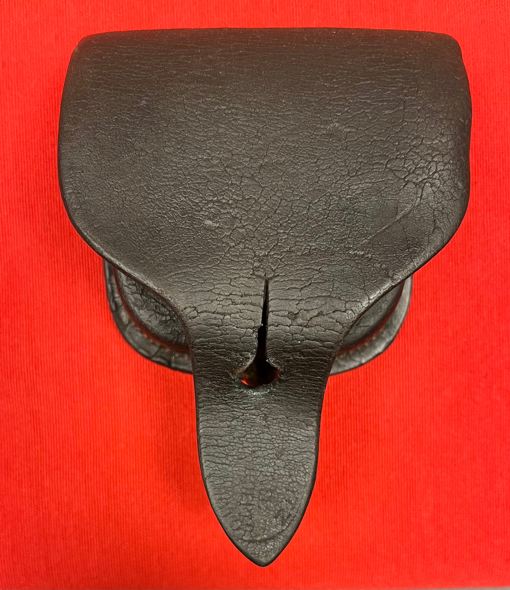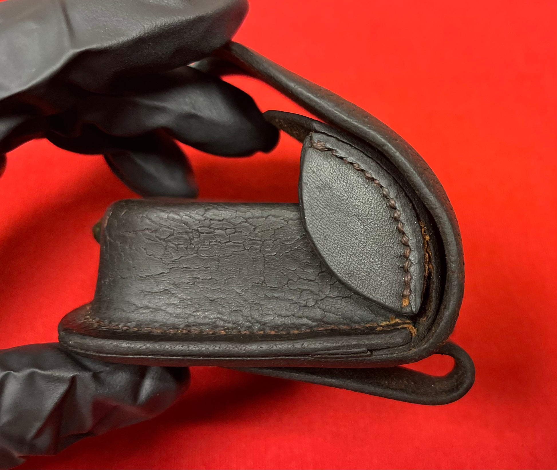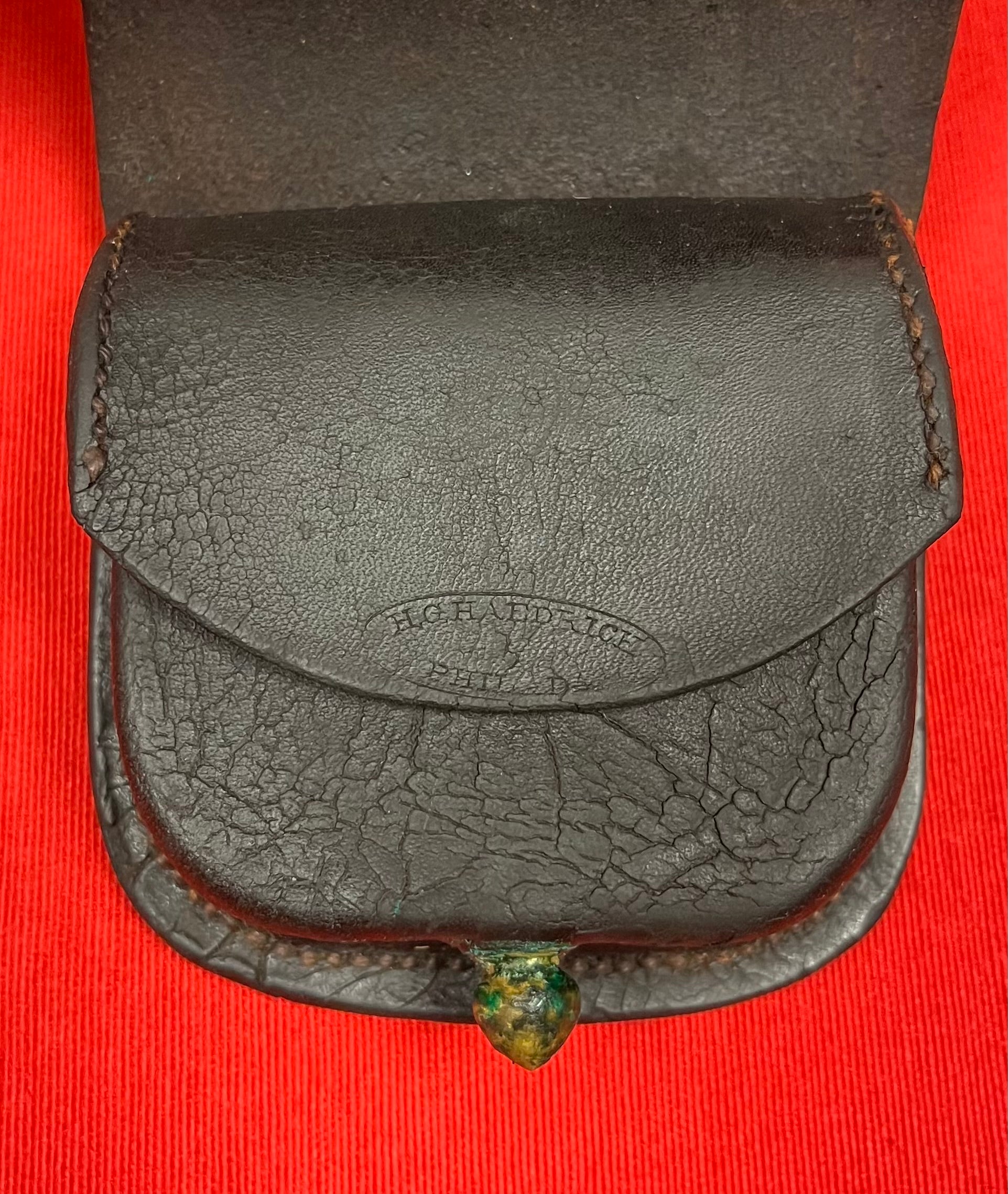 Henry G. Haedrich of Philadelphia had U.S. army contracts for well over 50,000 sets of infantry accoutrements from 1862 to 1865. This is a nice, clean example of his work, clearly marked on the inner flap and outer tongue. Nice finish to the black leather, showing wrinkles from flexing, and with belt loops and side-ears. (Side-ears missing a couple stitches)The wool fleece inside, meant to keep the percussion caps from bouncing out, is still present. Some verdigris buildup on the belt loops rivets and closure device. Should be cleaned off, otherwise this is a good example of an essential soldier’s accouterment by a well-known maker.