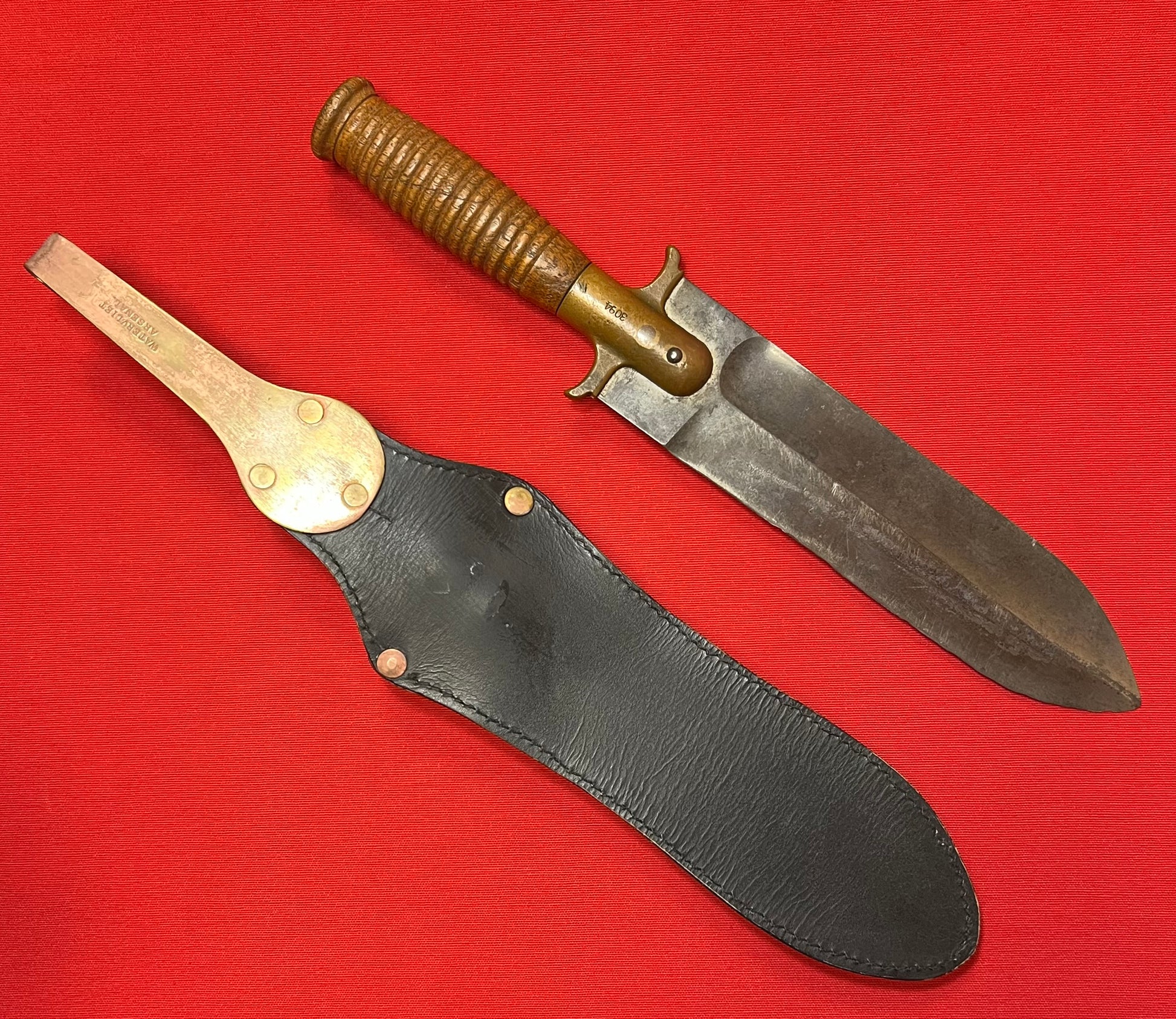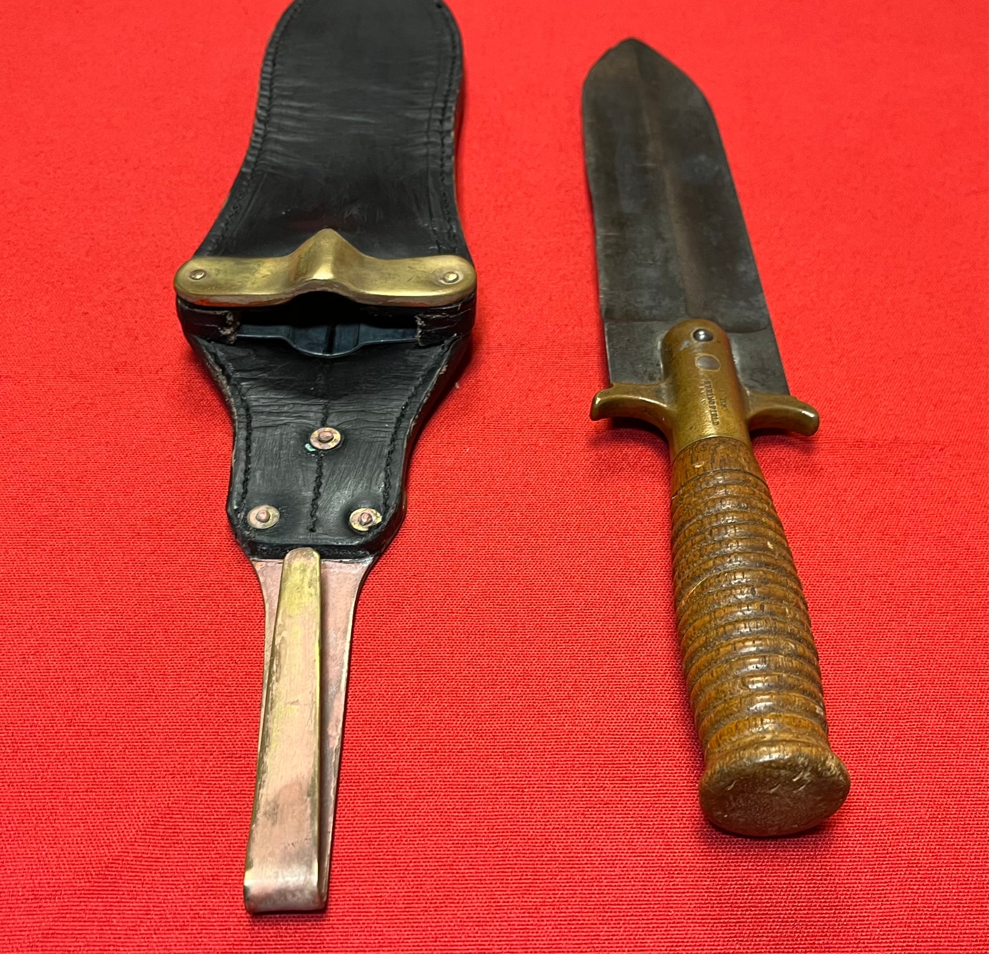 This example has a brass guard bearing the Springfield Armory mark and is numbered 3094. While the hunting knife is original; the sheath its in is a tasteful reproduction.