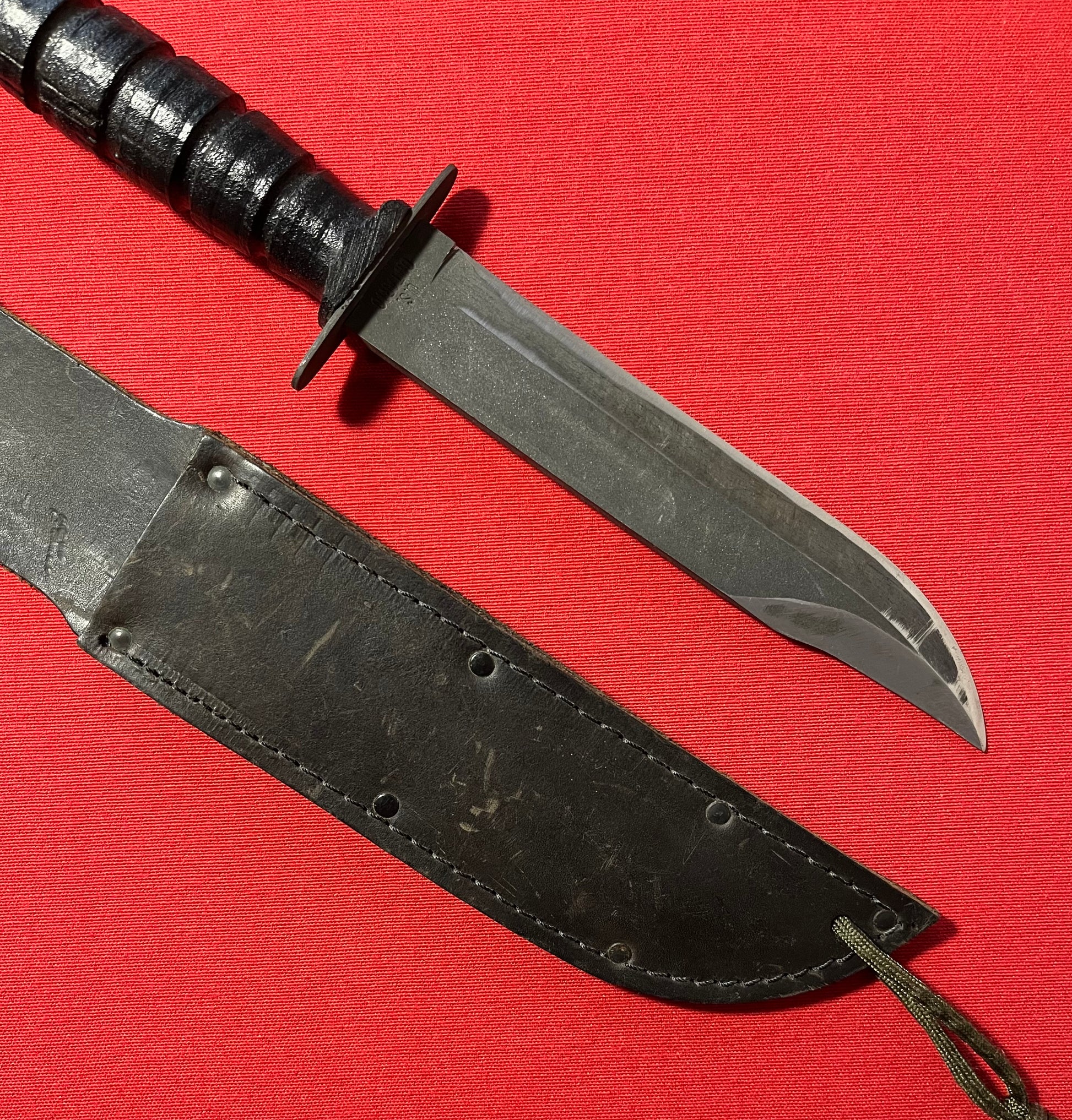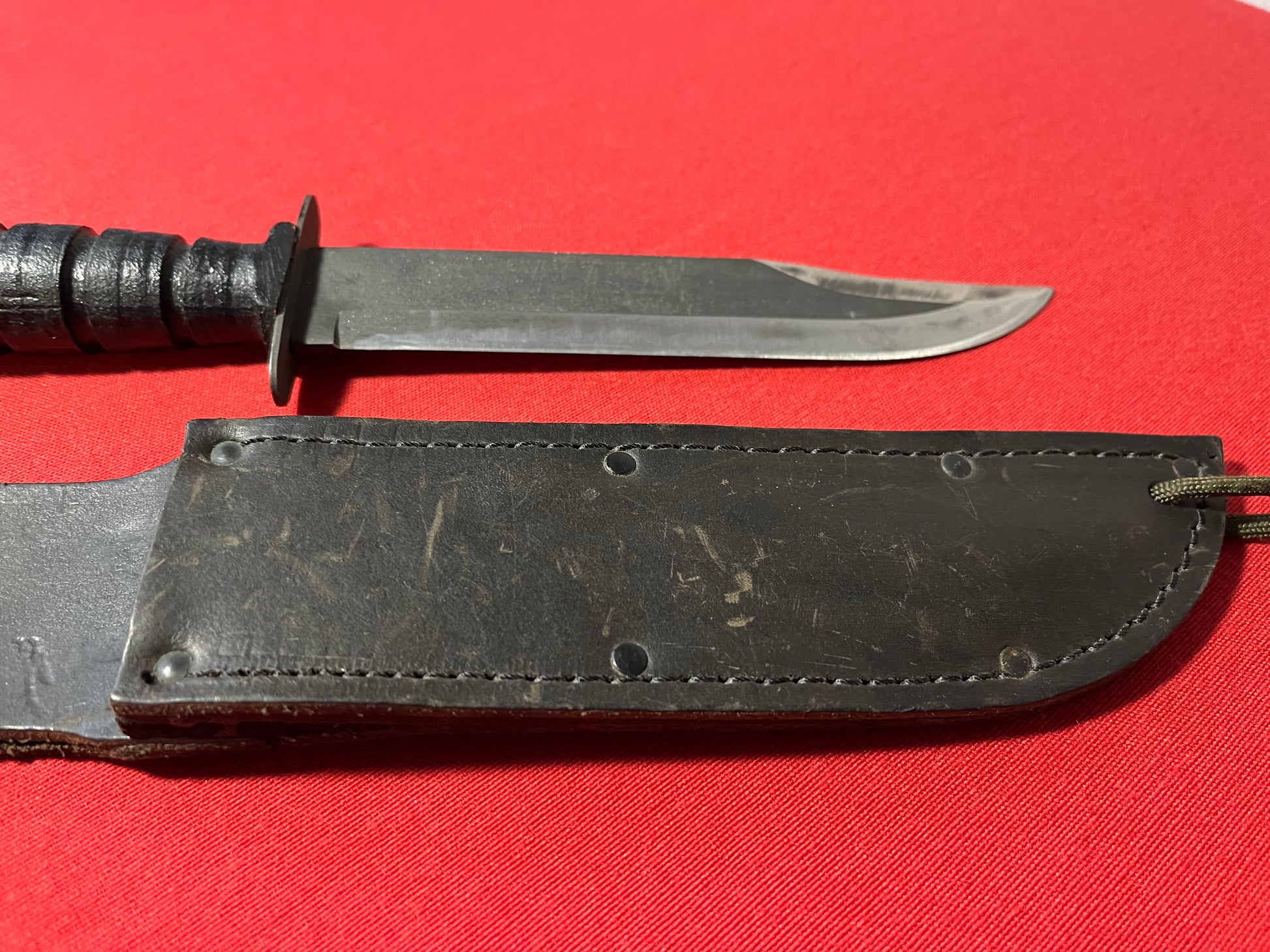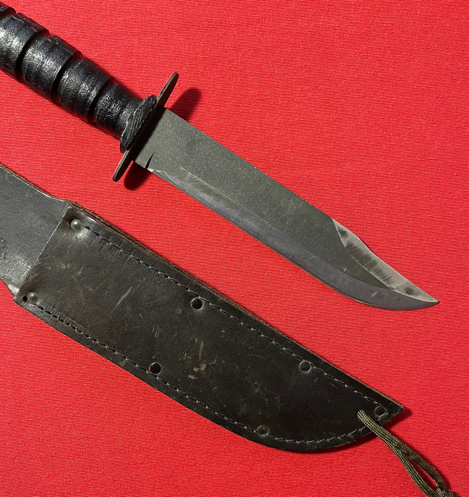 MFG by Ontario / U.S Fighting knife / Authentic / Original leather scabbard / Strap is operational / Great patina / Size- 12 1/8 inches overall with a 7 inch parkerized blade / Pictures provided for overall condition and quality / Please inquire with any questions "Used" General wear with age