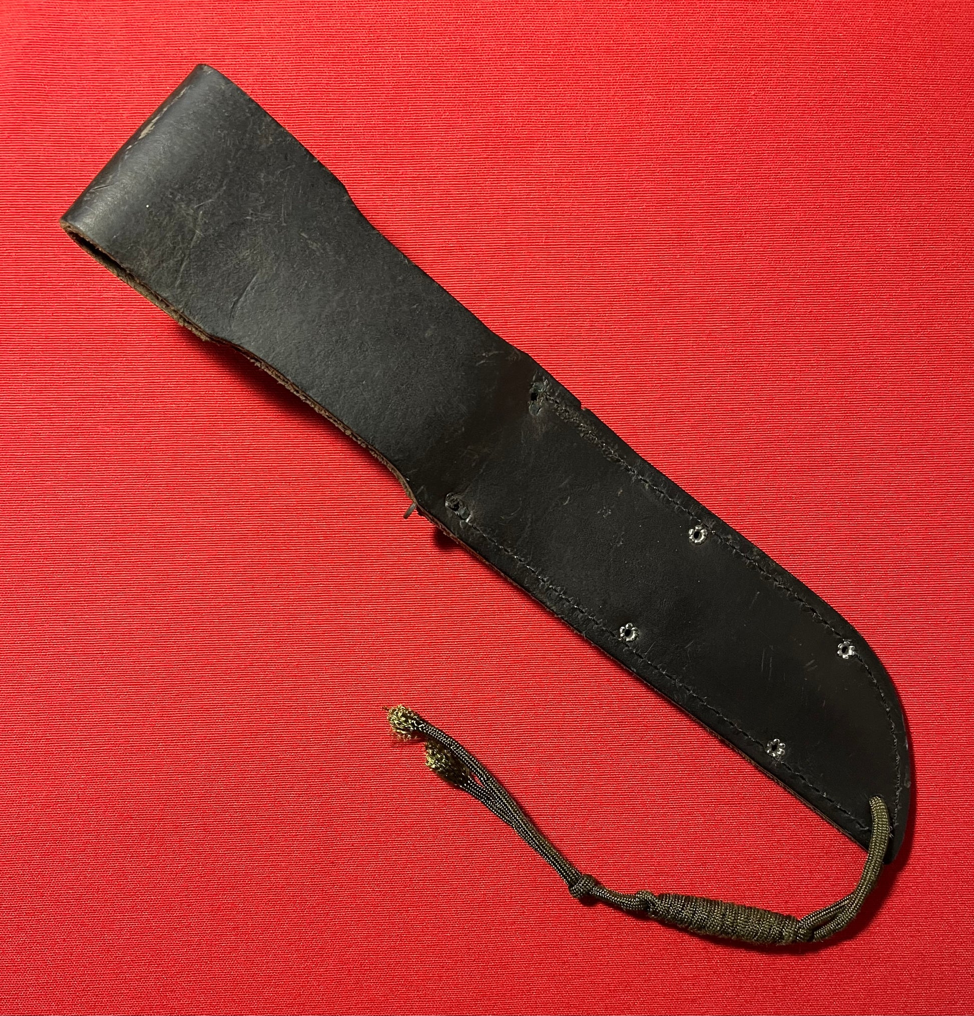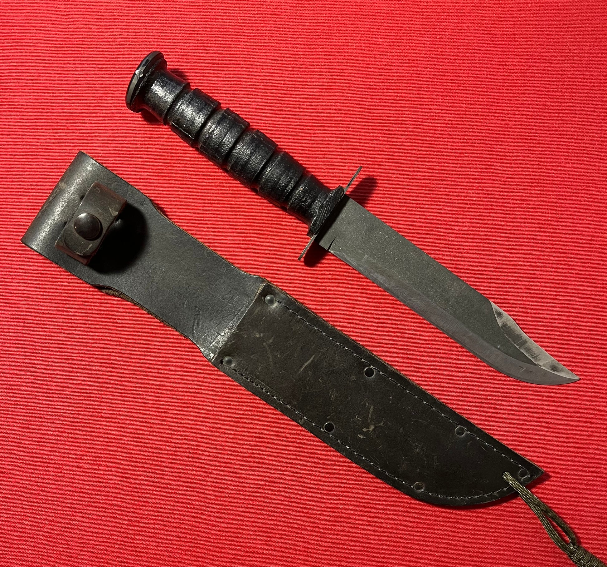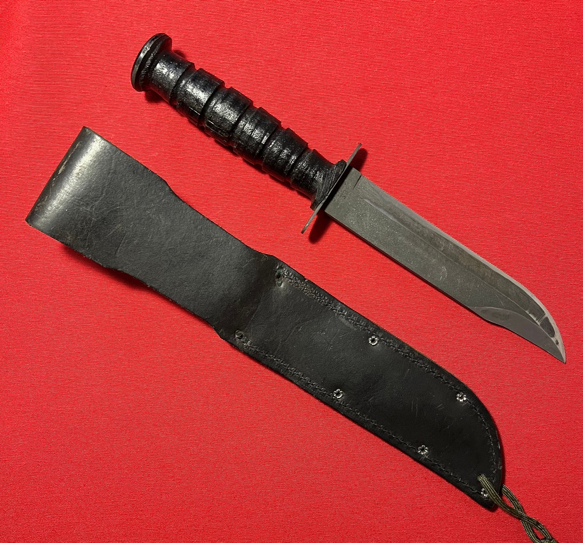 MFG by Ontario / U.S Fighting knife / Authentic / Original leather scabbard / Strap is operational / Great patina / Size- 12 1/8 inches overall with a 7 inch parkerized blade / Pictures provided for overall condition and quality / Please inquire with any questions "Used" General wear with age