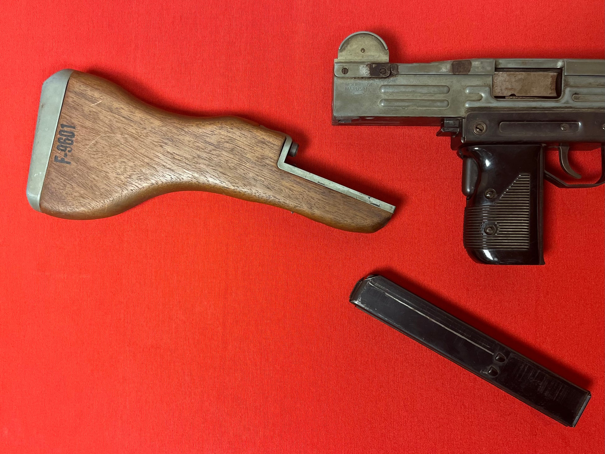 The Model of Marusin UZI "Early Model" is a replica weapon commonly seen in movies. Made by the brand Marushin (early models like this spelled Marusin not Marushin) which is how you can tell... and numbered "A0028" (extremely low production number) 70's. This reproduction gun was manufactured in Japan. It is a very detailed and authentic representation of a UZI weapon. Perfect for collectors, reenactments, or enthusiasts looking to add a realistic touch to their movie-themed accessories. Its design and craftsmanship make it a standout piece for anyone interested in movie industry memorabilia. We personally have not tried to use it. Sold in "as-is" condition. Please look at the pictures carefully before purchasing.