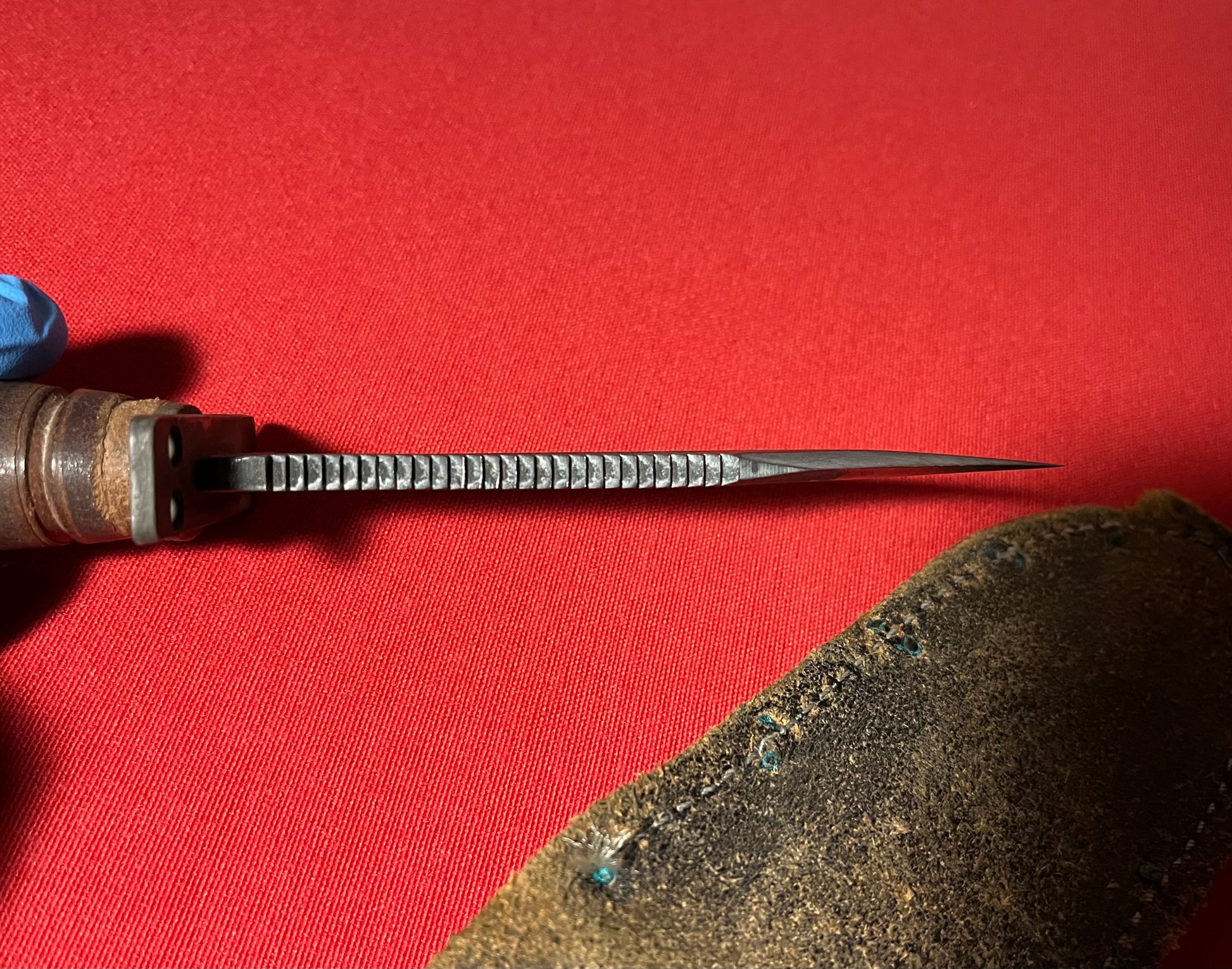 Authentic / Vietnam Era / Maker - Camillus N.Y. / Dated 5–1973 on the pommel / Overall size is 9 3/8 inches / 5 inch blade / Comes in leather scabbard (Lower half of brass snap missing from leather support strap (easy-fix) Minty blade / Parkerized finish