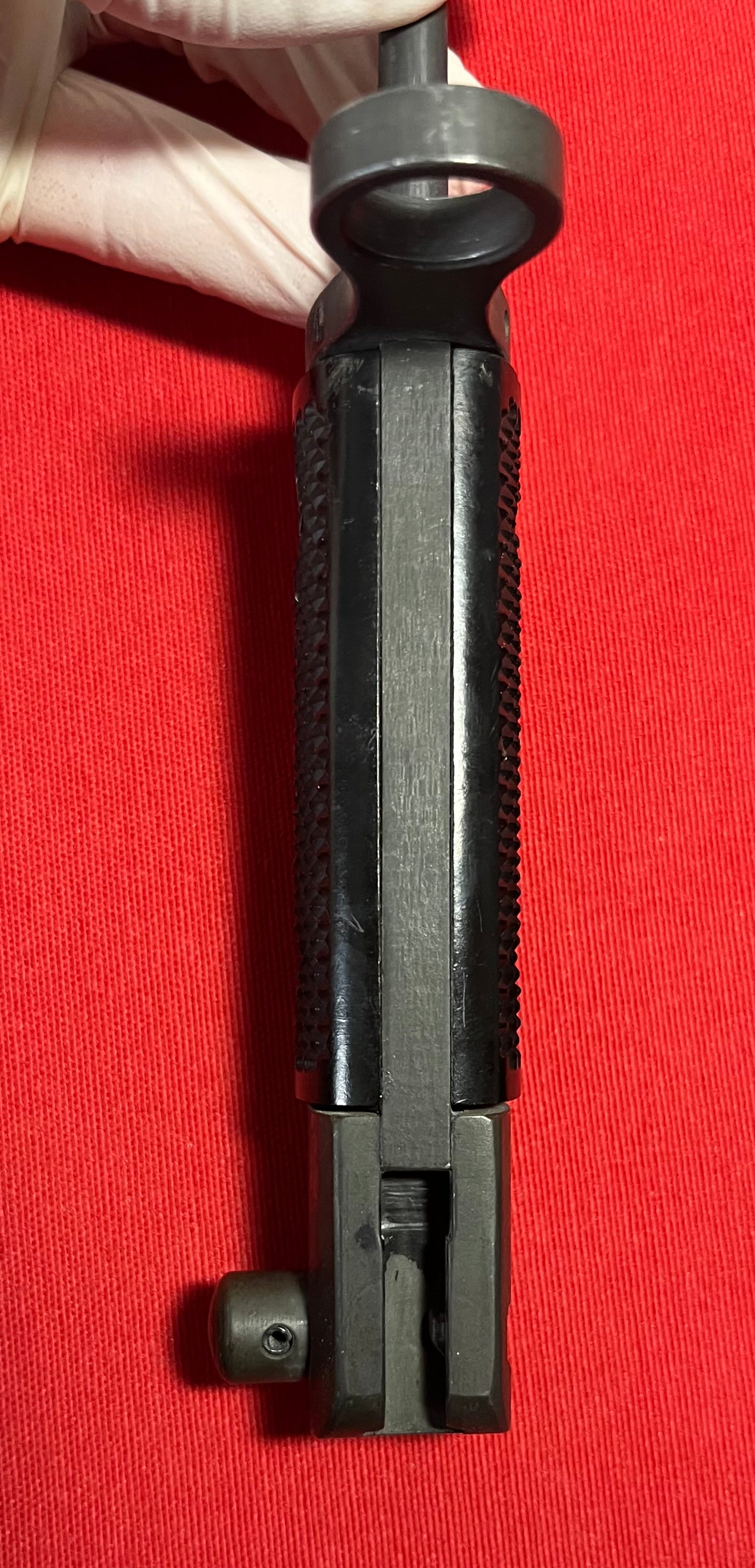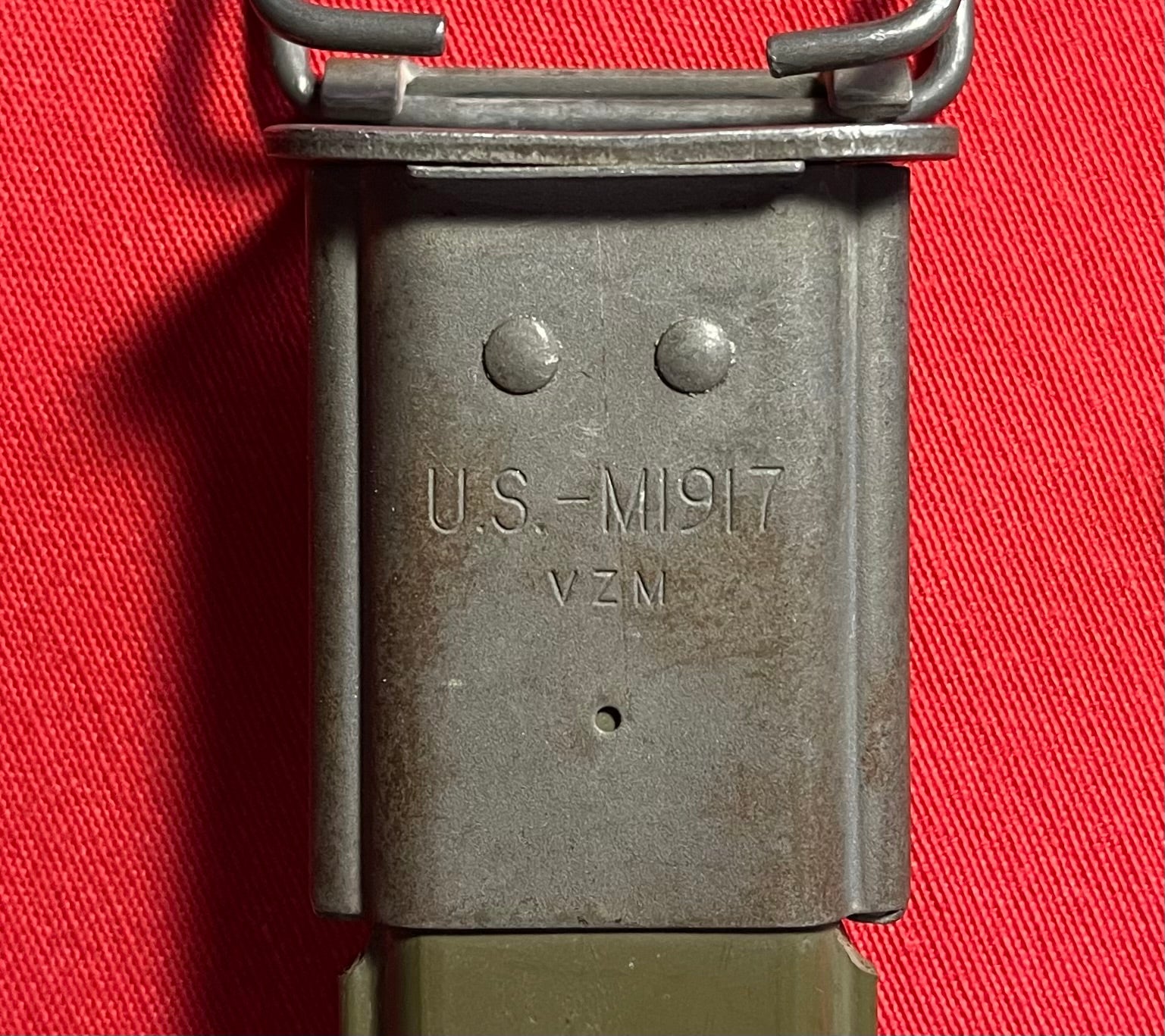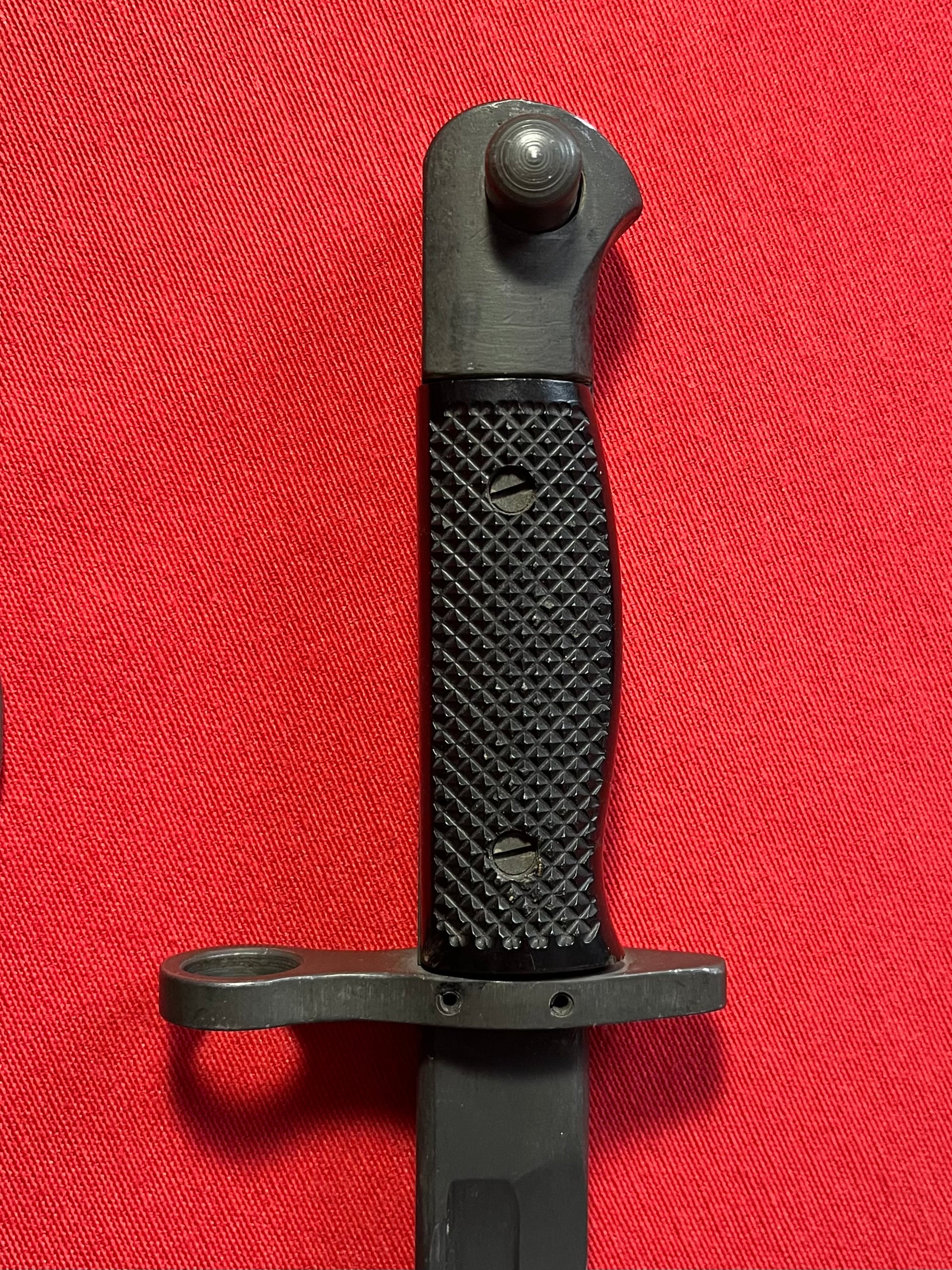 This bayonet however was not made for WWI or repurposed for WWII, this was produced for the Vietnam War era by shotgunners equipped with a shotgun that had an M1917 bayonet adapter. The most common encountered examples were marked “GEN CUT” on the crossguard on one side of the blade and “M1917” on the other. A contract was also given to Canadian Arsenal, Ltd. (Ontario, Canada) during this same period for additional M1917 bayonets of this type. These were marked with a small “A” enclosed in a larger “C” and “M1917” on the crossguard, like this example here.