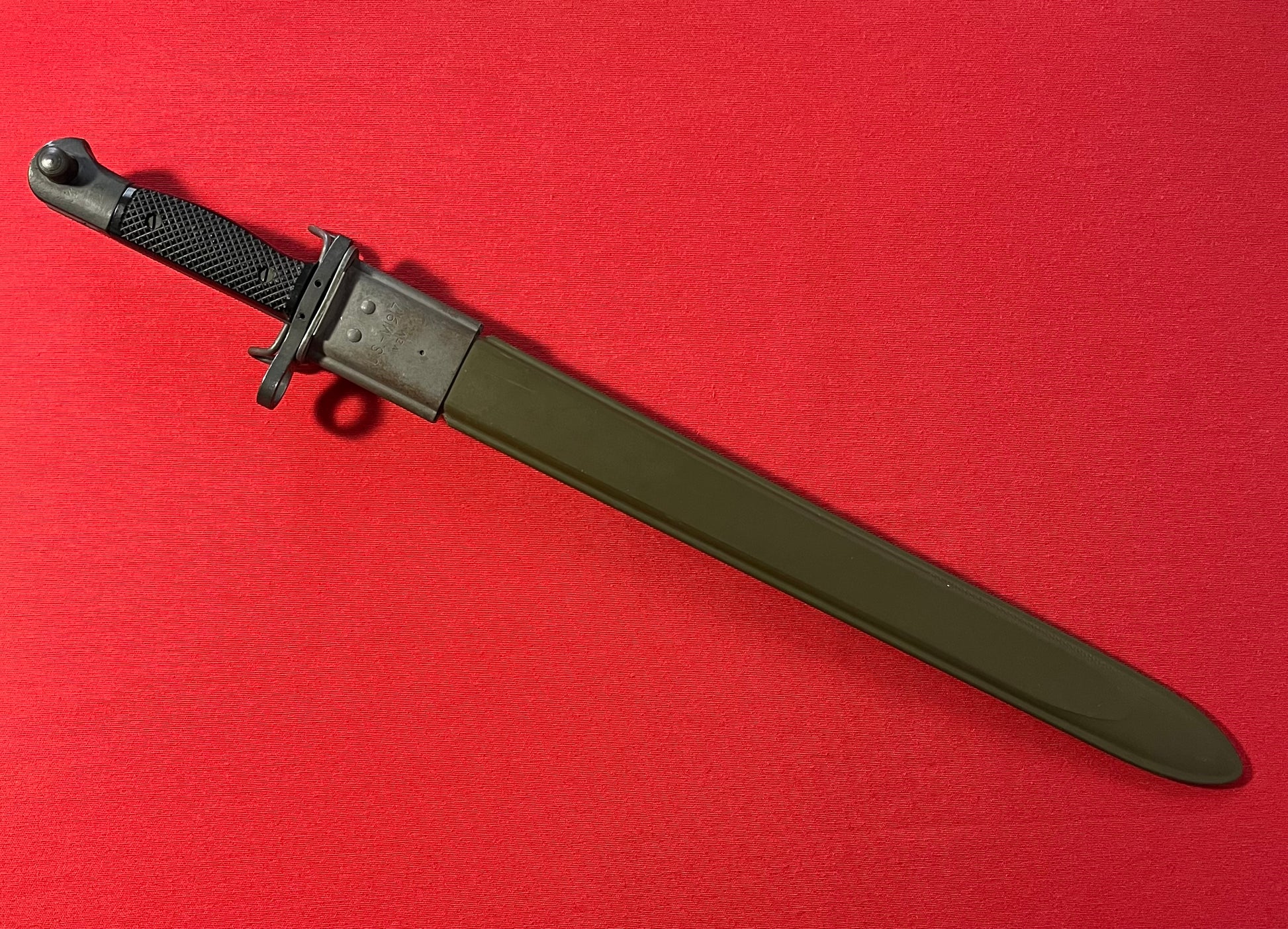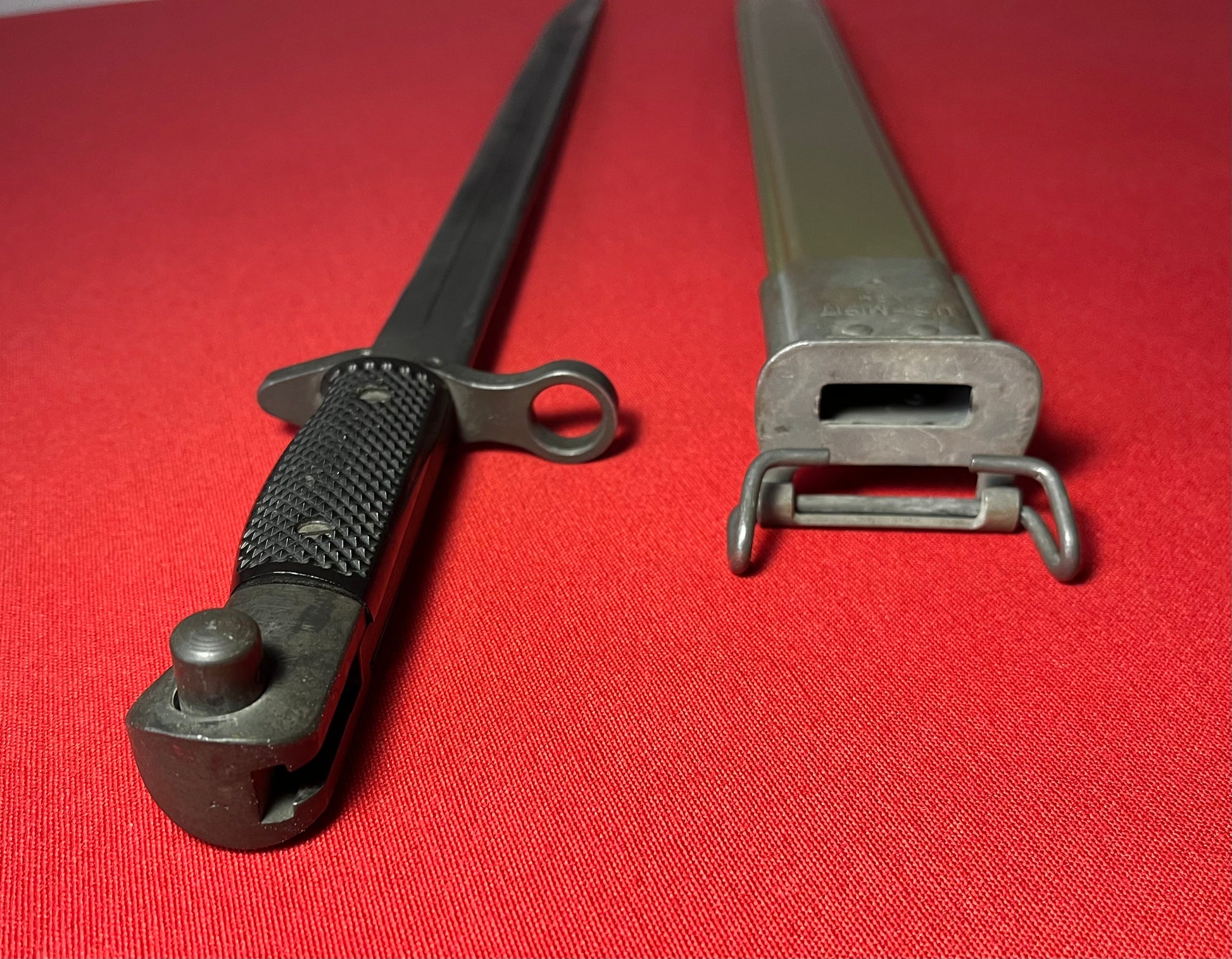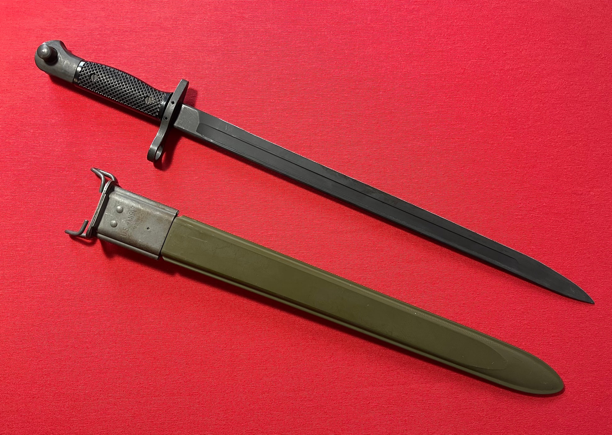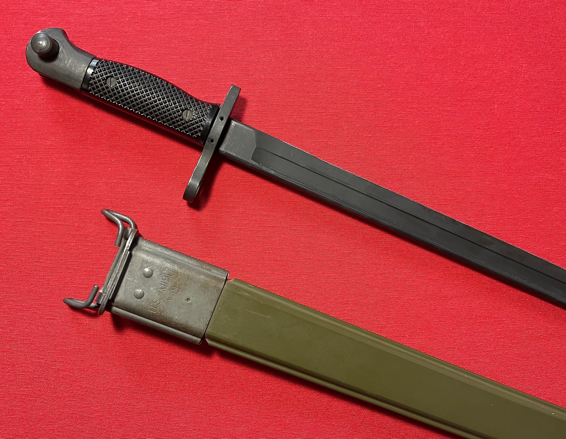 These bayonets are rather scarce and would be proper for display with any of the U.S. military “trench guns” in service after about 1966 equipped with adapters for the M1917 bayonet, so if you have one and need a bayonet, you're in luck!