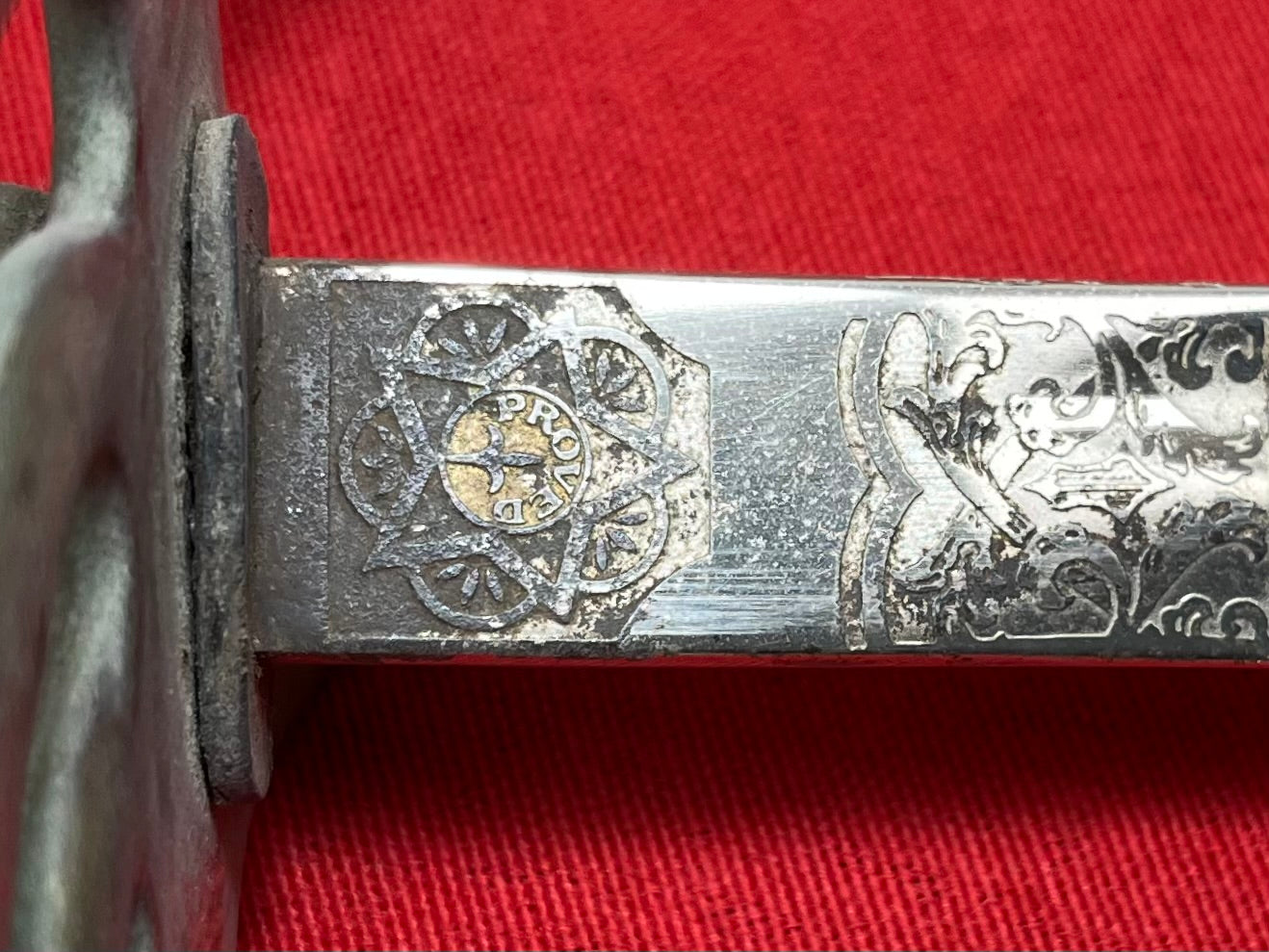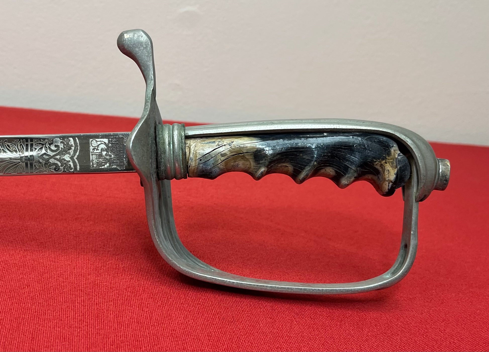Condition - The handle is made of horn and has shrunk with some cracks through the years. A small dent, 3/4 of the way down the scabbard is visible as well. Opposed to these defects with age and use this is a great identified piece with outstanding engraving on both sides of the blade.