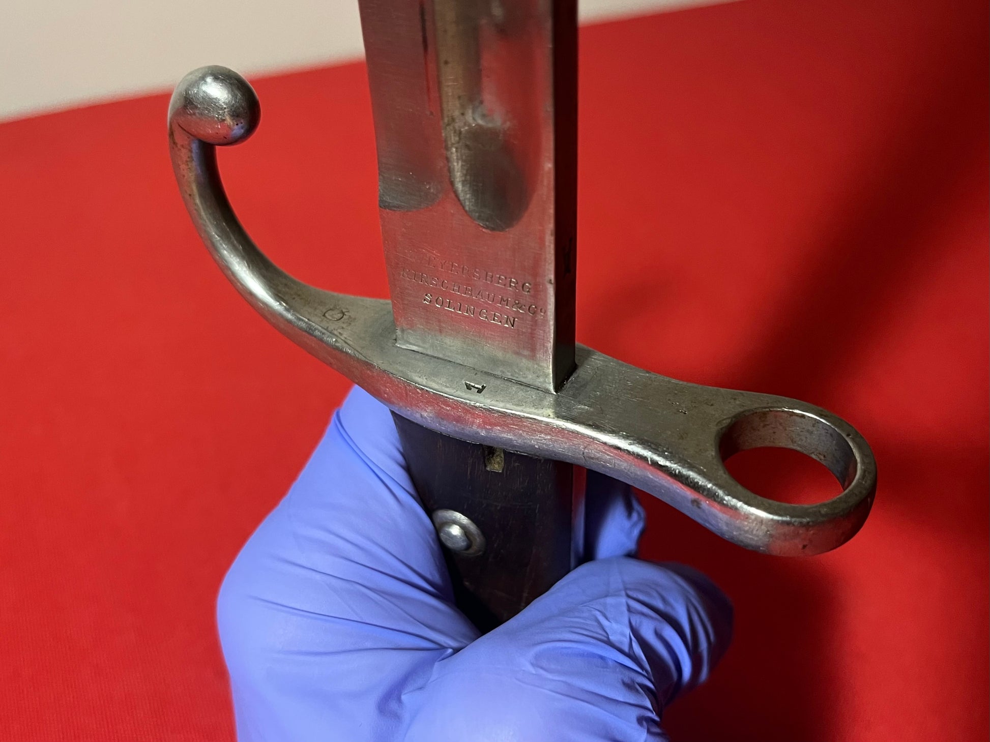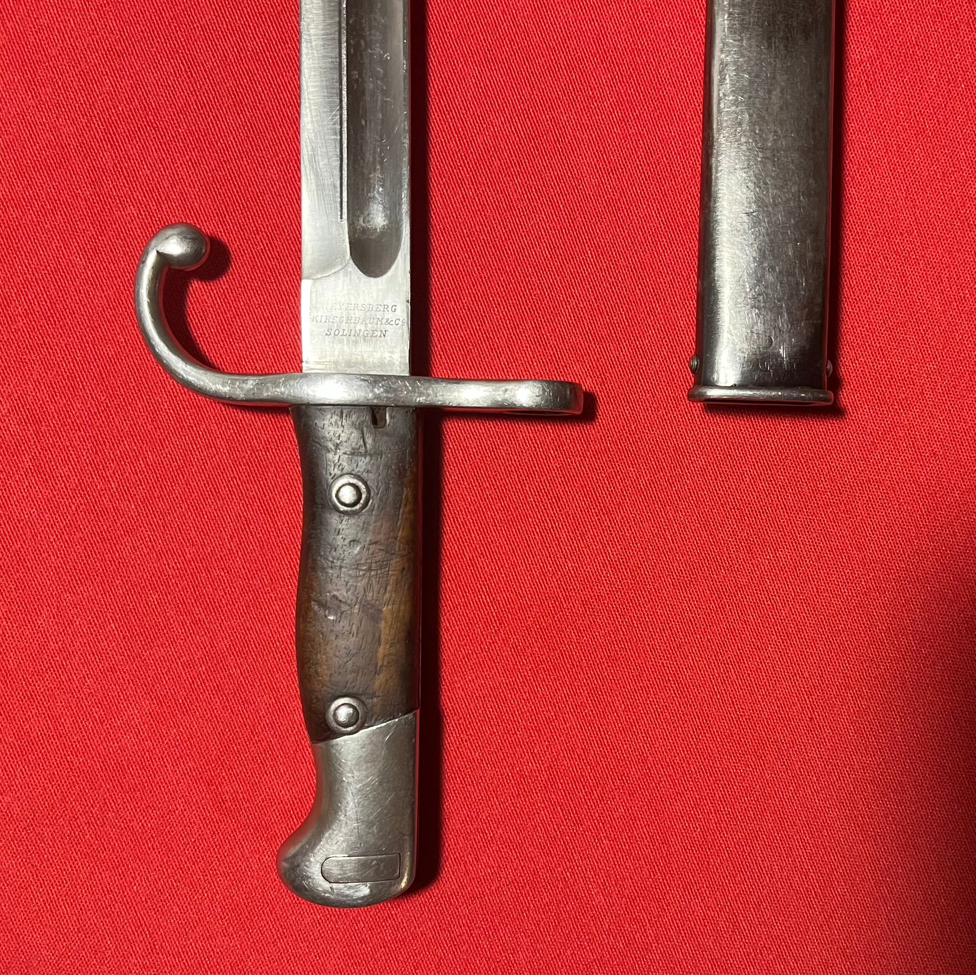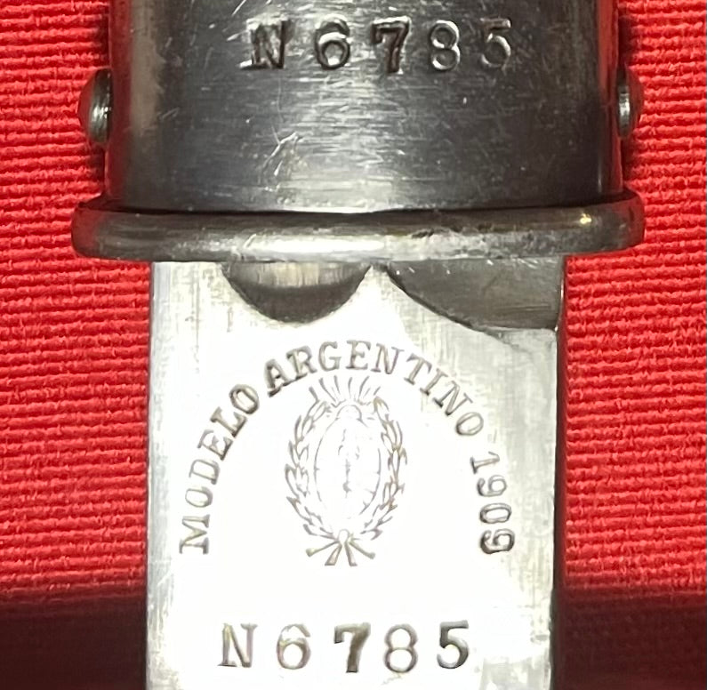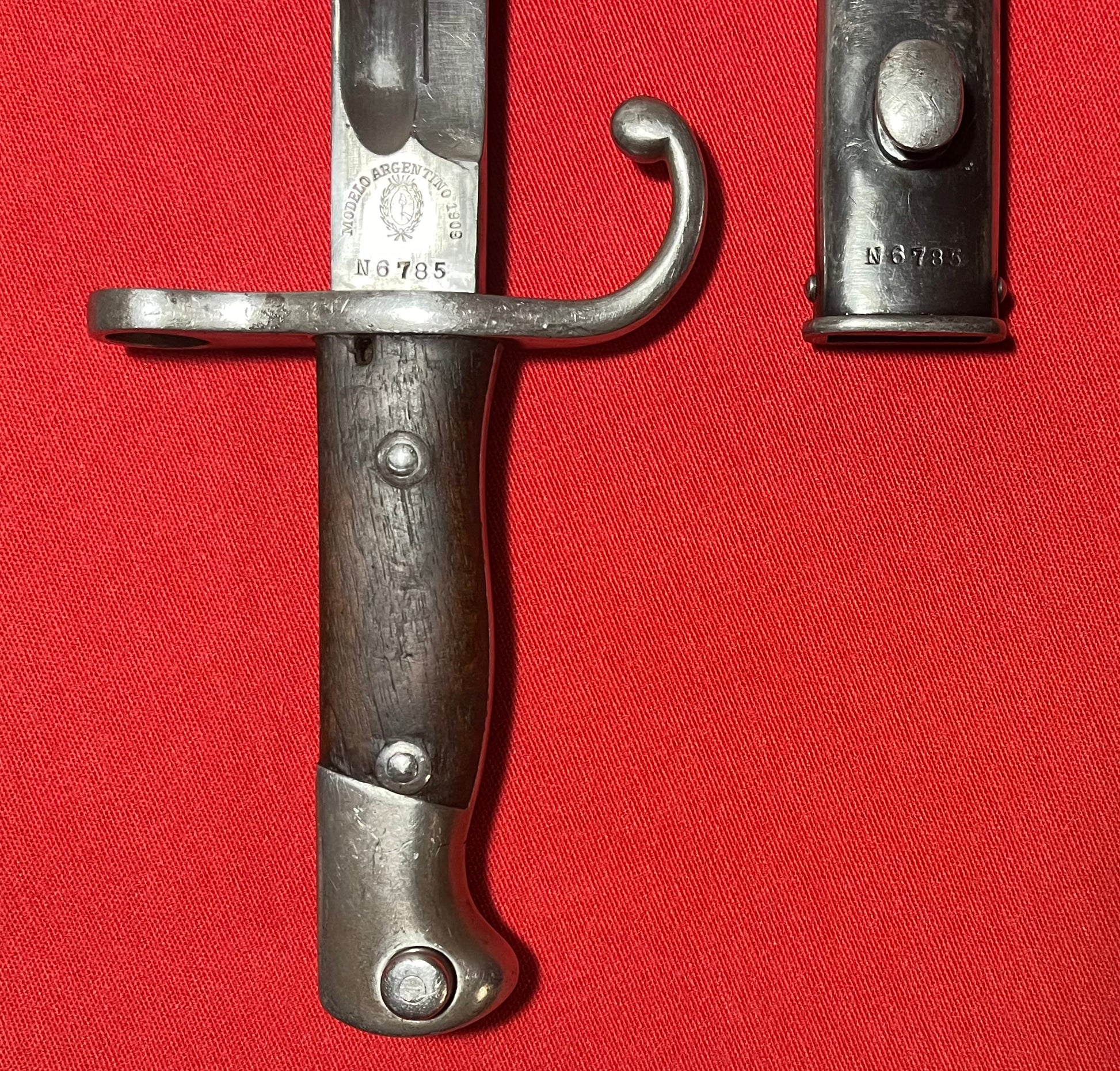 German Made / WW1 Era / By Weyersberg Kirschbaum & Co / Solingen Germany / Made for Argentina's - M1909 Modelo Argentino Mauser Rifle / Matching Numbers N6785 / "C" & "1" on crossguard "A" on spine / Overall length is 20 2/4 inches with a 15 3/4 inch blade / Blade is nice and clean with a bold crest that is usually ground off during the export process / Scabbard has some scratches