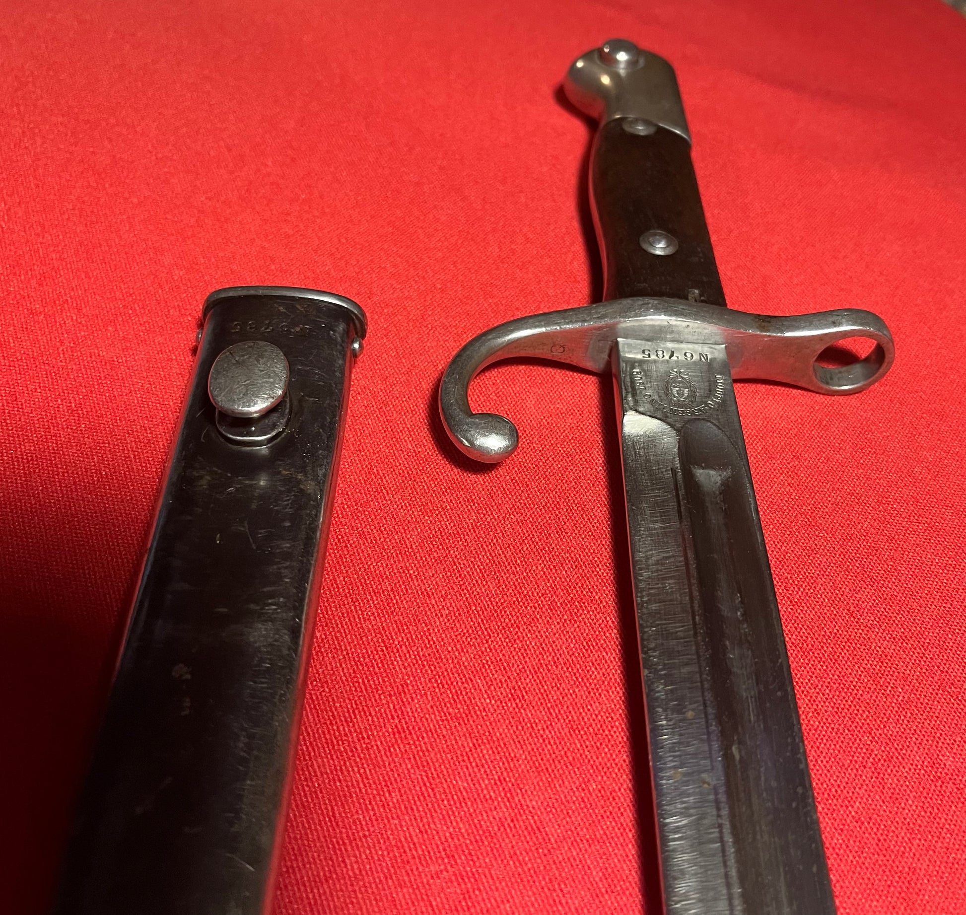 WW1 Era 1909 German Made Mauser Bayonet & Scabbard for Argentina / Matching Numbers