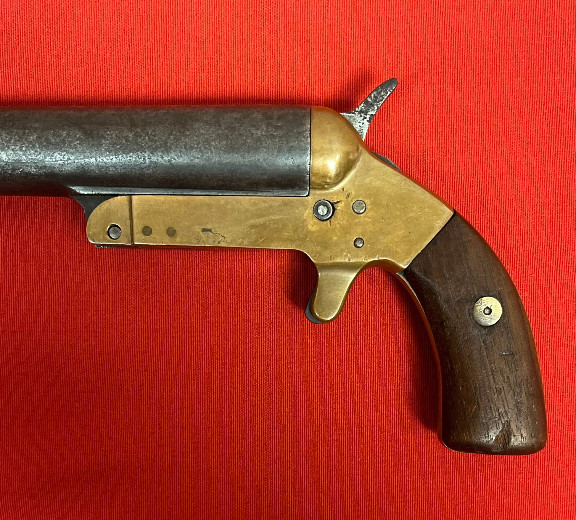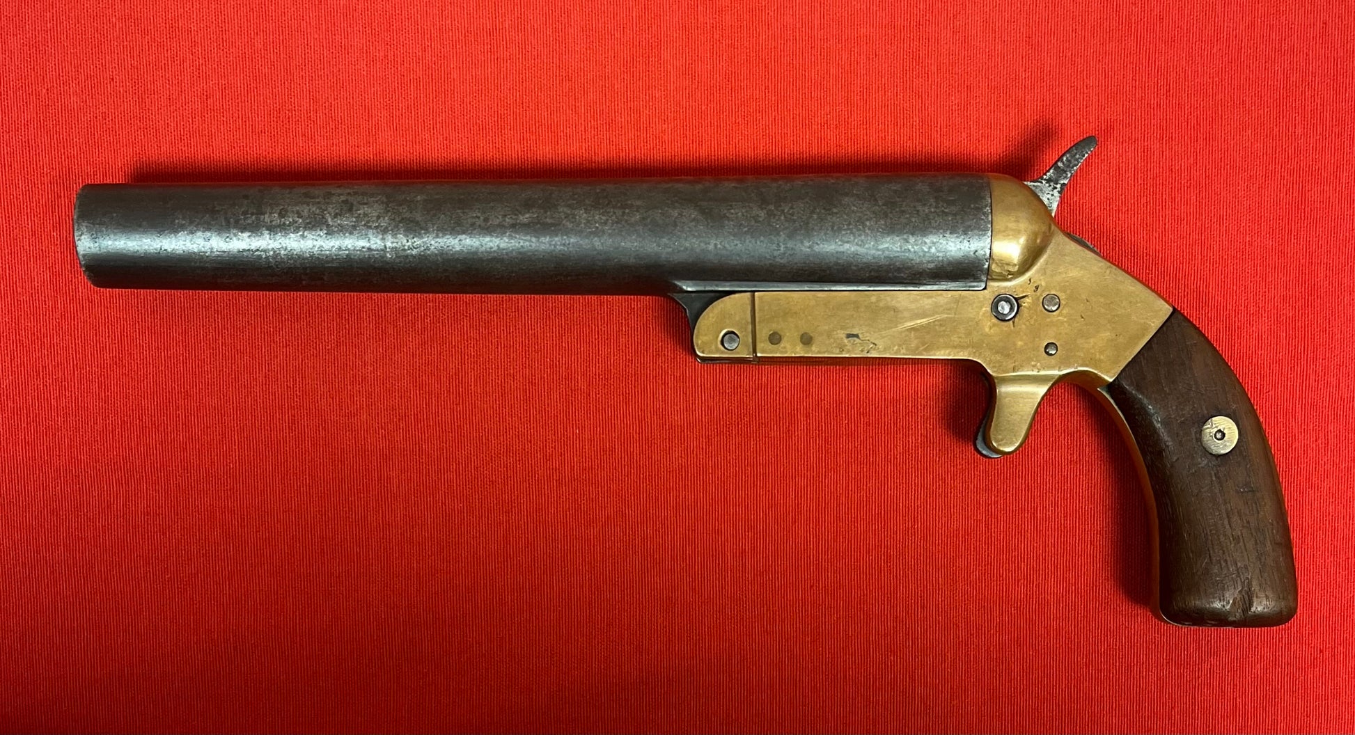The frame is of brass and comes with its original wood grips. Serial number 3368. This design features a "spur" trigger, and a "top break" loading system, typical of most flare pistols. Measures 12 1/2 inches overall, with a 9 inch barrel.