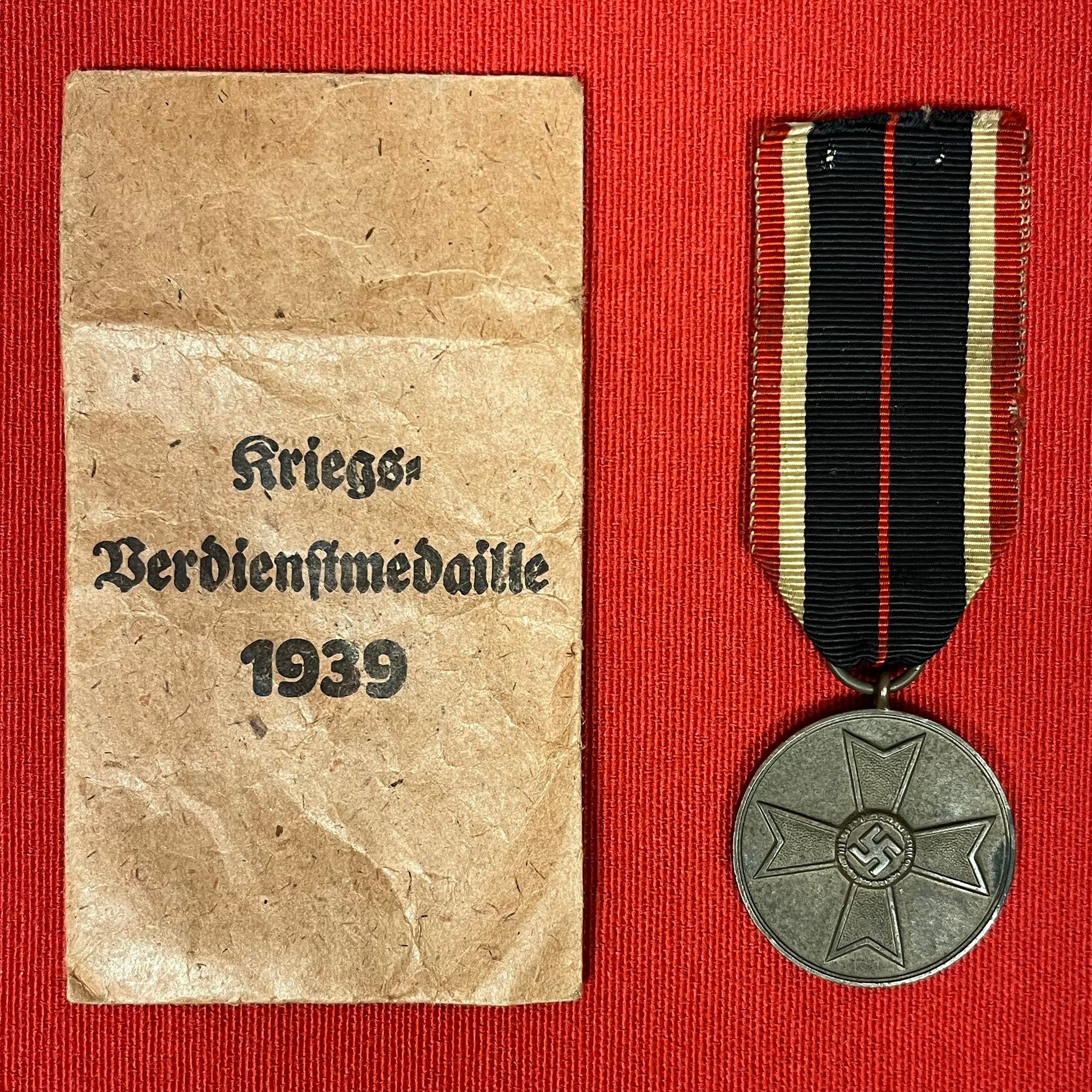 The War Merit Medal was an extension of the War Merit Cross series of awards and was introduced on August 19th 1940 and awarded to German nationals and foreign civilians who provided exceptional service to the war effort. The reverse of the award has embossed Gothic script, “Für Kriegs-verdienst 1939”, (For War Merit 1939), on a smooth background. Complete with ribbon and original envelope. 100% authenticity guaranteed!