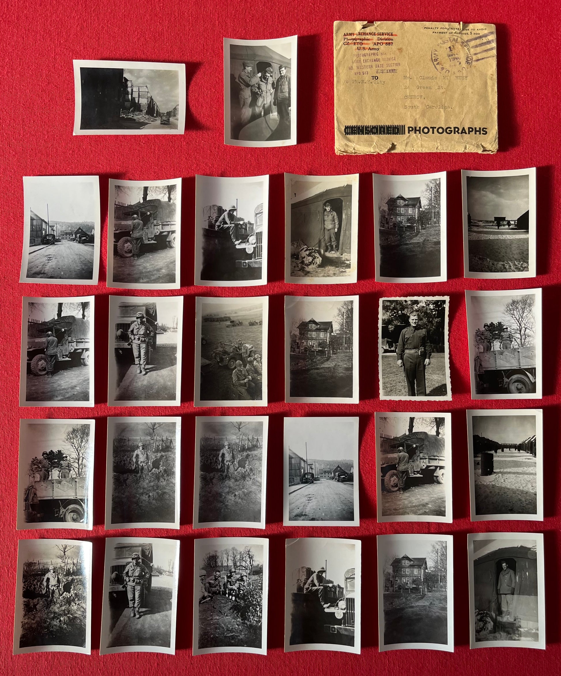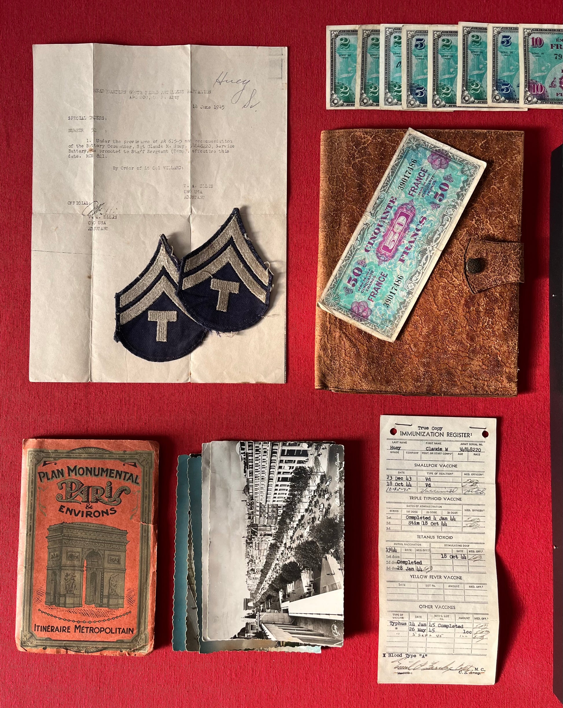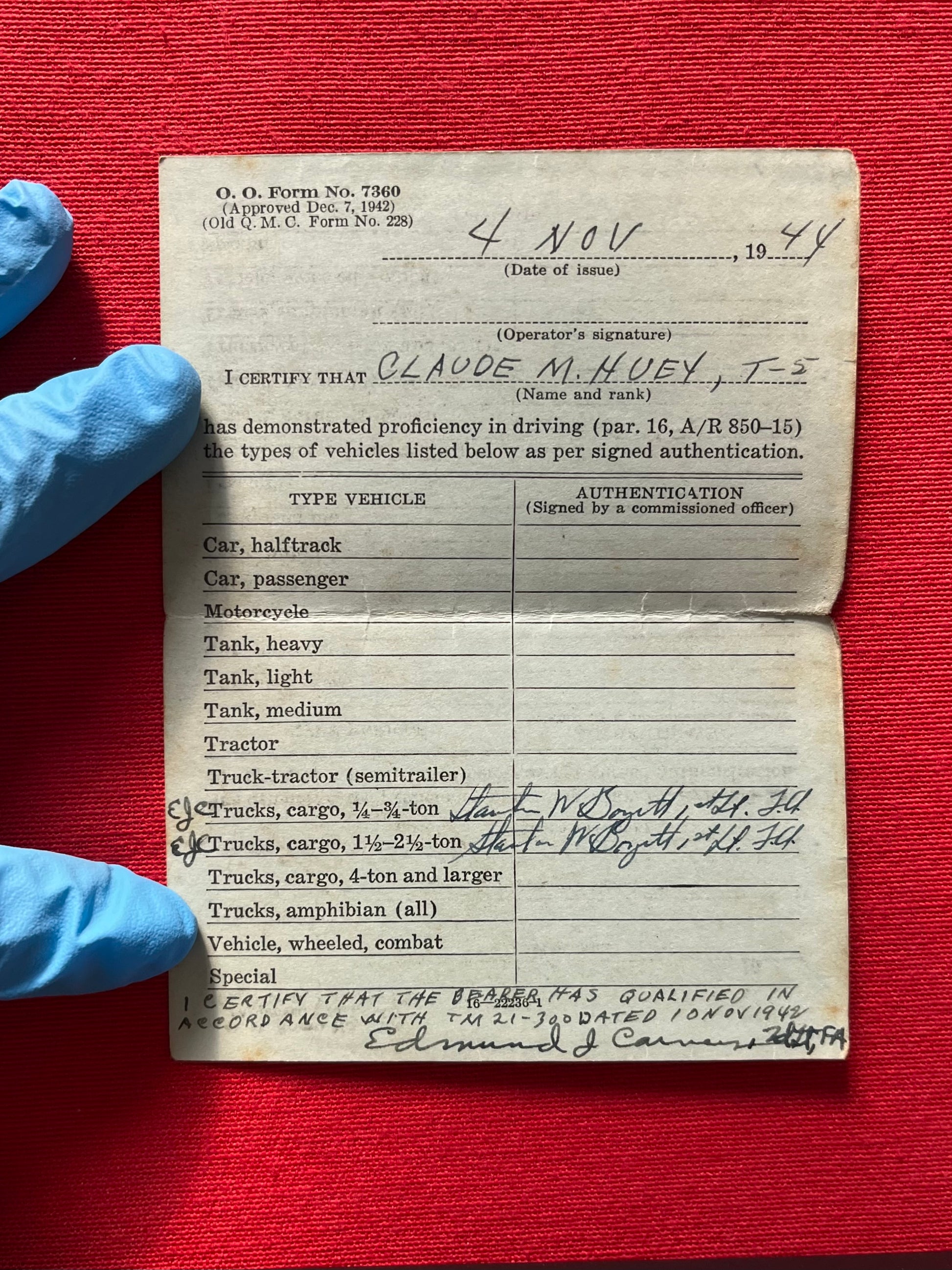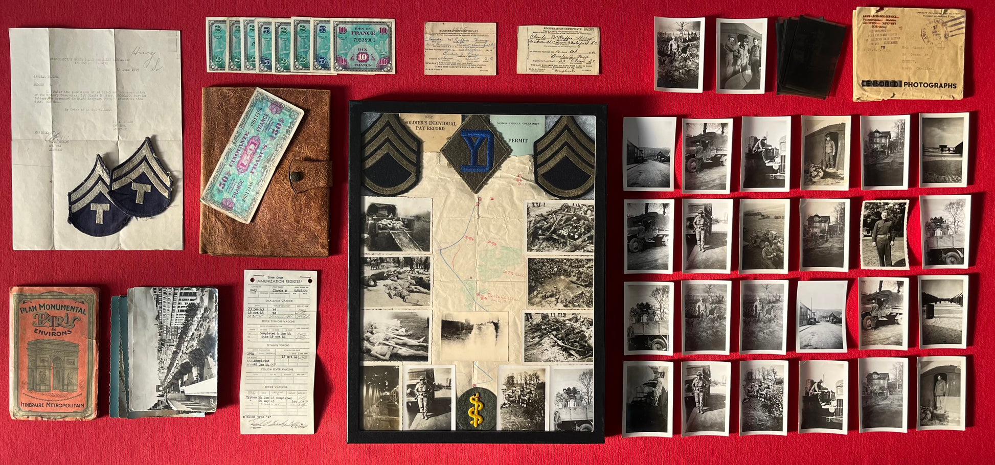 In this grouping there are 37 original photos “some are doubles” and a couple negatives / 6 U.S. Army patches / 1 German medical patch / 1 Original ambulance route map (hand drawn) by Claude M. Huey / 1 soldiers individual pay record / 1 motor vehicle operators permit “driver’s license” for larger equipment / 1 immunization register / 2 Registration certificates / Leather case with French money / Letter of promotion to Staff Sergeant / Paris souvenir booklet and postcards (some postcards written and sent by Claude)… (All items personally owned by Claude M. Huey) Display case provided and measures 16 x 12 inches