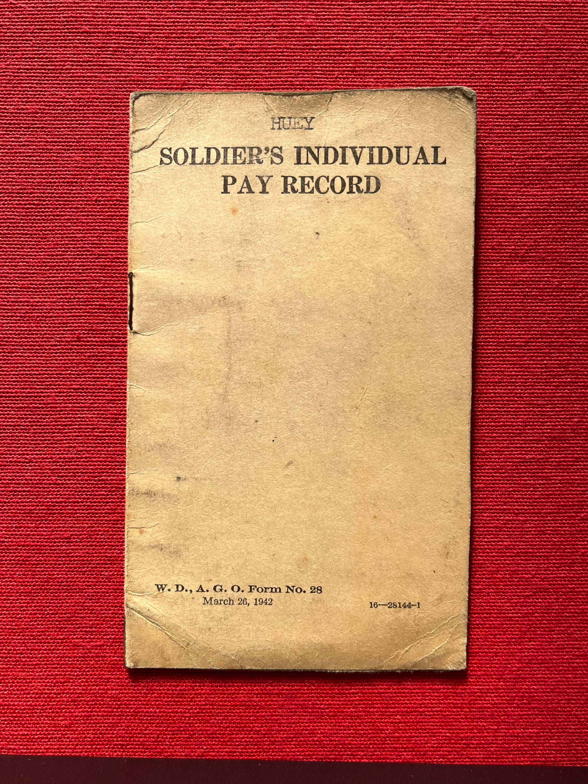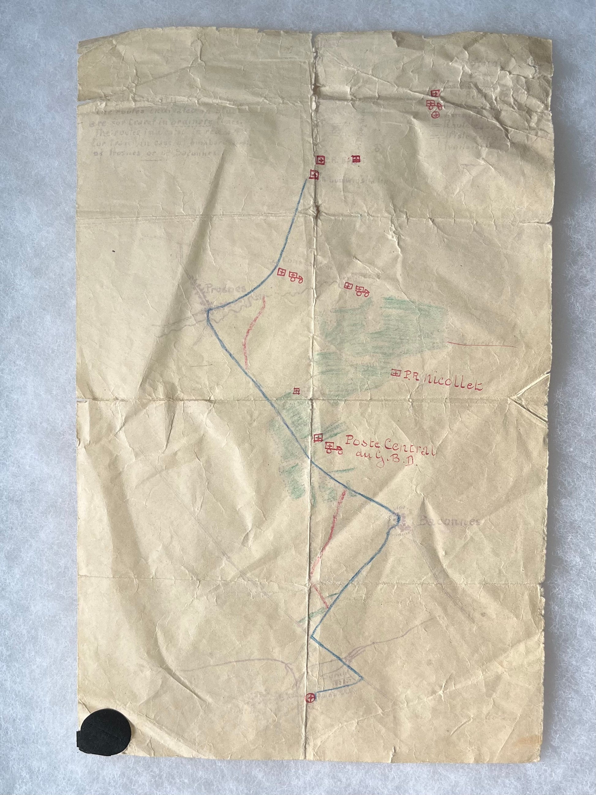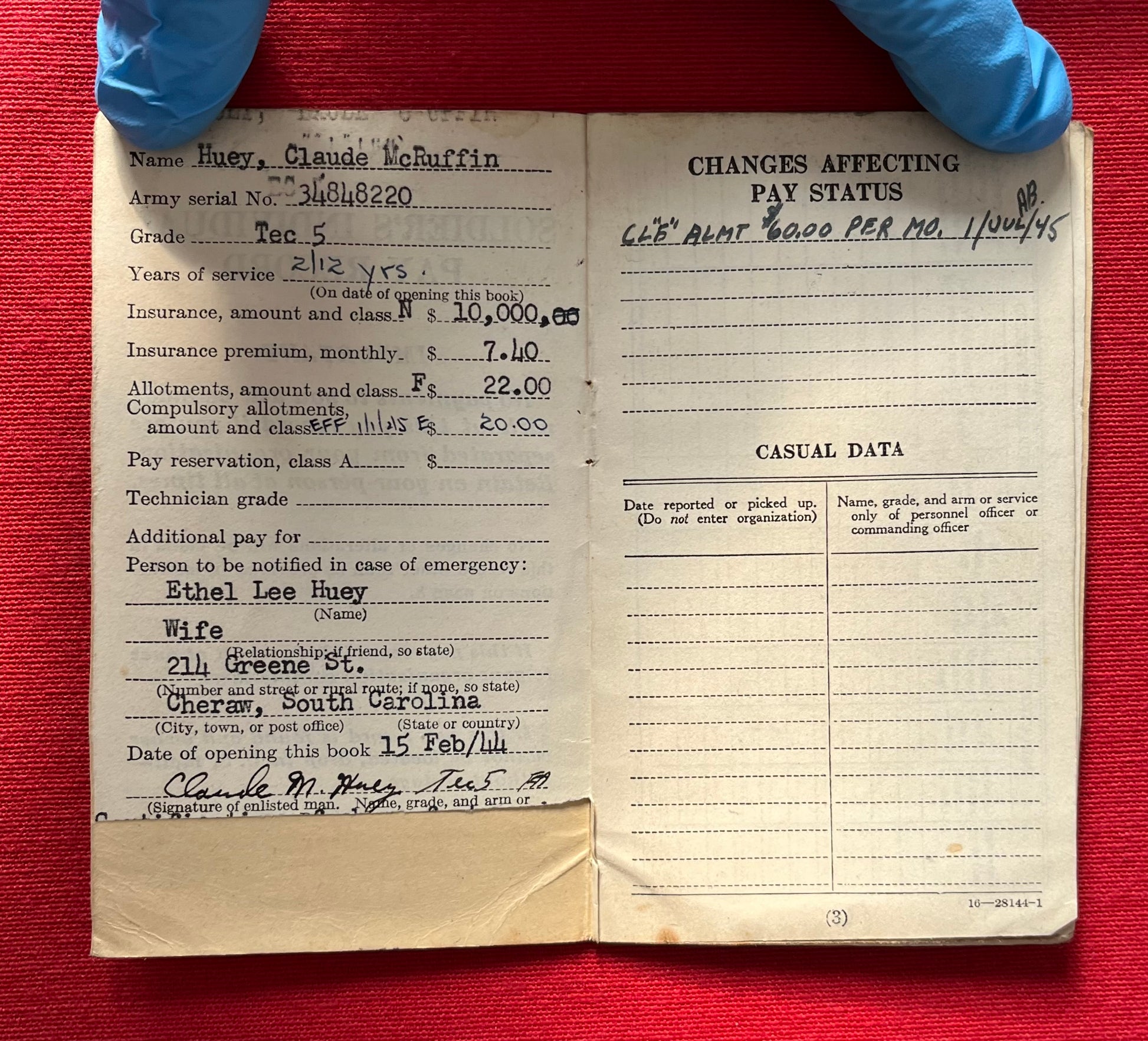 In this grouping there are 37 original photos “some are doubles” and a couple negatives / 6 U.S. Army patches / 1 German medical patch / 1 Original ambulance route map (hand drawn) by Claude M. Huey / 1 soldiers individual pay record / 1 motor vehicle operators permit “driver’s license” for larger equipment / 1 immunization register / 2 Registration certificates / Leather case with French money / Letter of promotion to Staff Sergeant / Paris souvenir booklet and postcards (some postcards written and sent by Claude)… (All items personally owned by Claude M. Huey) Display case provided and measures 16 x 12 inches