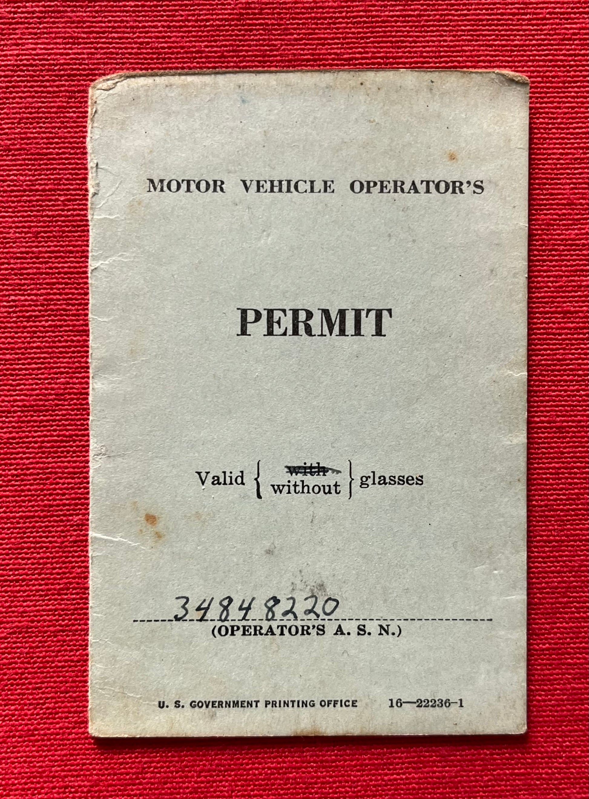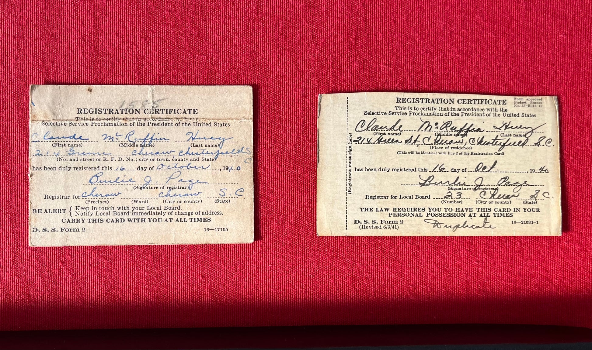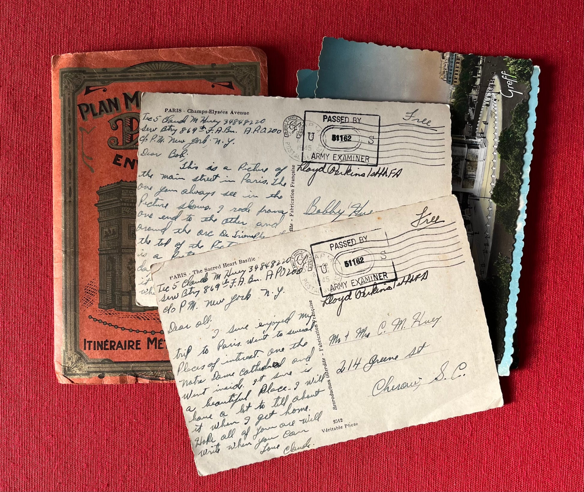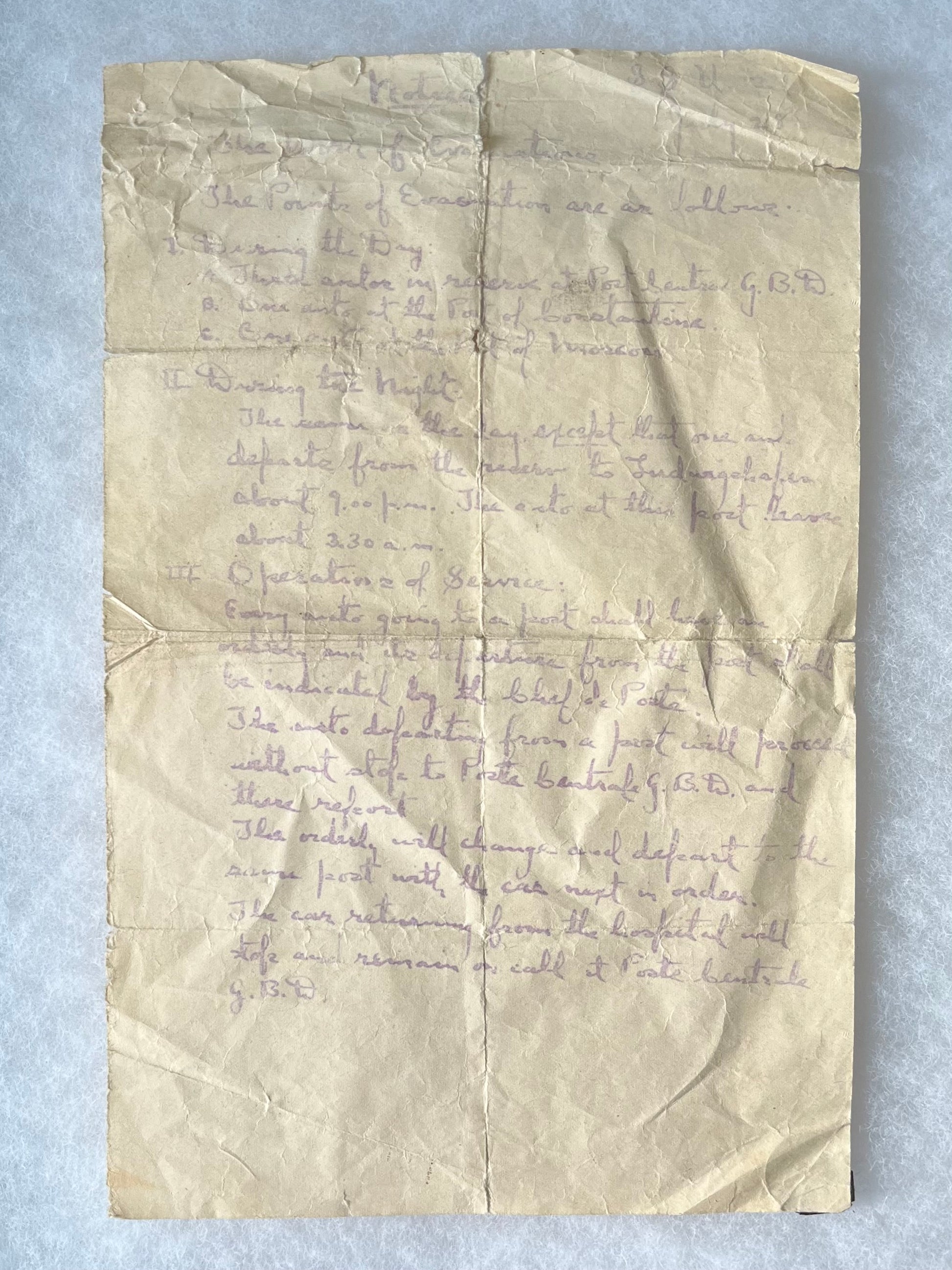 In this grouping there are 37 original photos “some are doubles” and a couple negatives / 6 U.S. Army patches / 1 German medical patch / 1 Original ambulance route map (hand drawn) by Claude M. Huey / 1 soldiers individual pay record / 1 motor vehicle operators permit “driver’s license” for larger equipment / 1 immunization register / 2 Registration certificates / Leather case with French money / Letter of promotion to Staff Sergeant / Paris souvenir booklet and postcards (some postcards written and sent by Claude)… (All items personally owned by Claude M. Huey) Display case provided and measures 16 x 12 inches