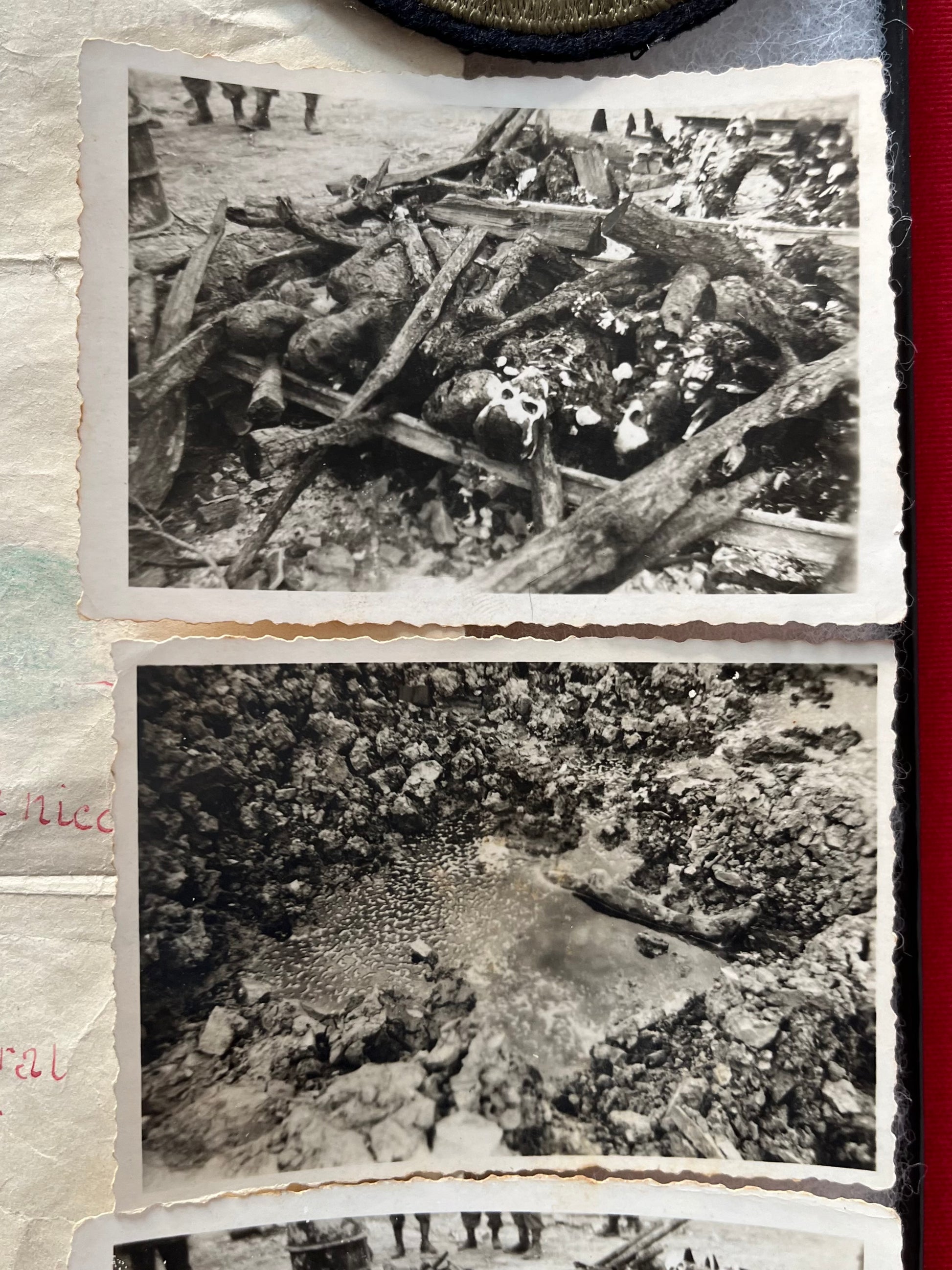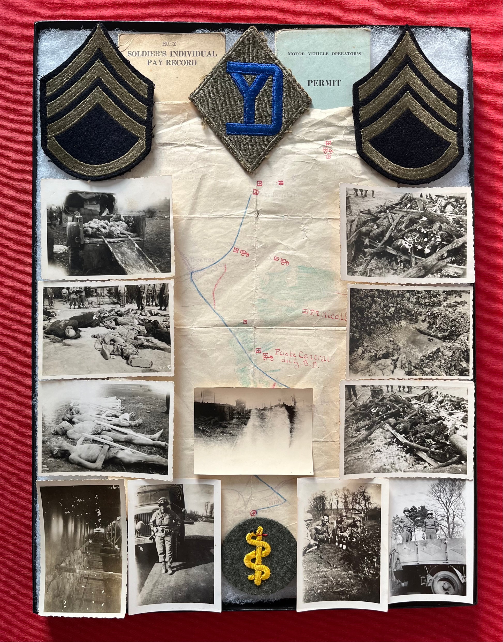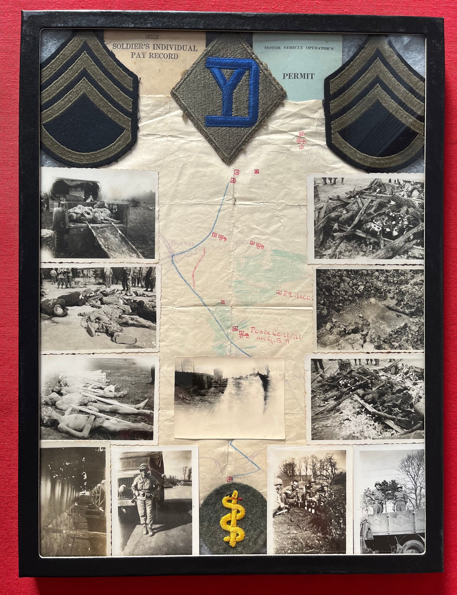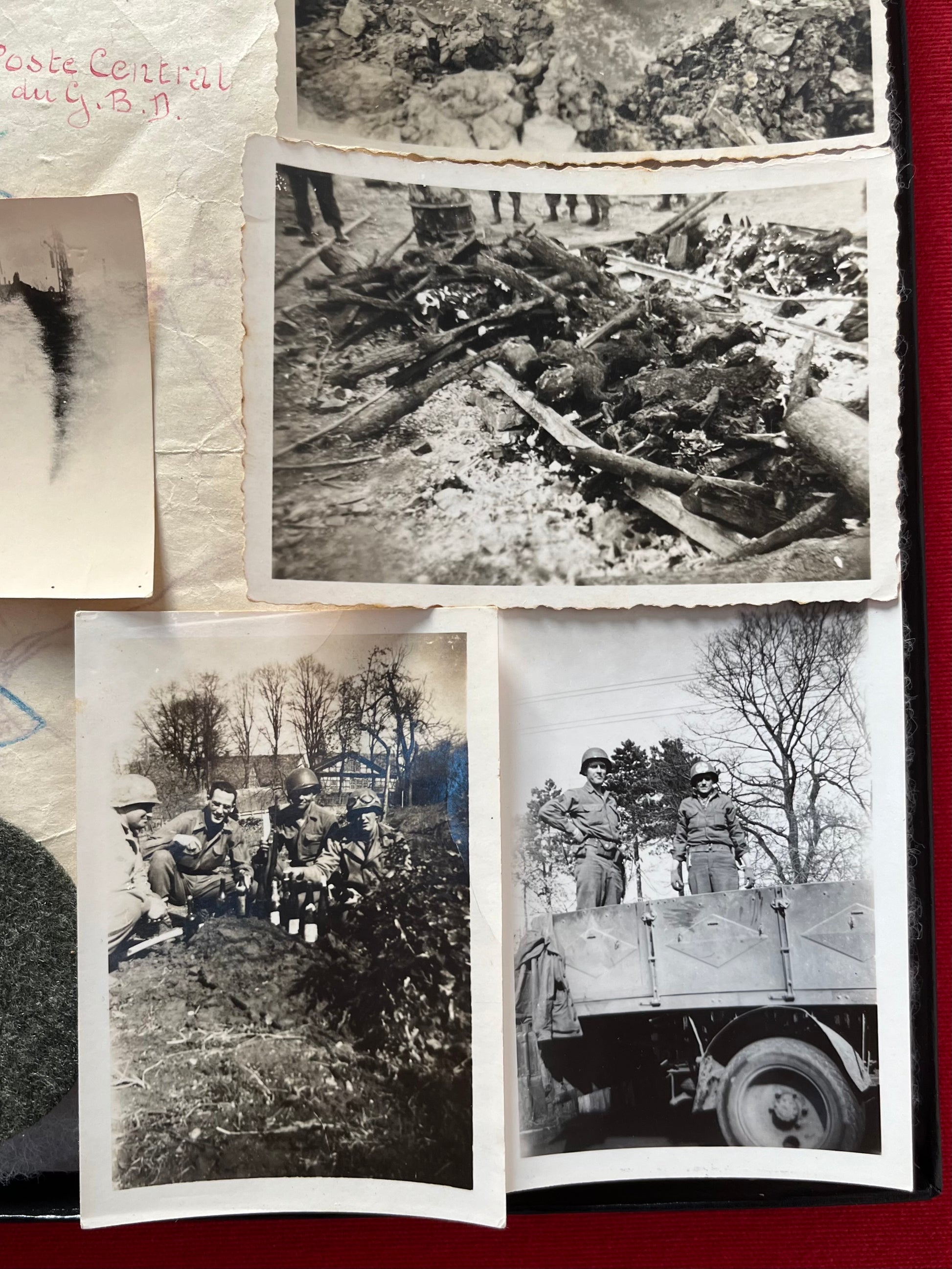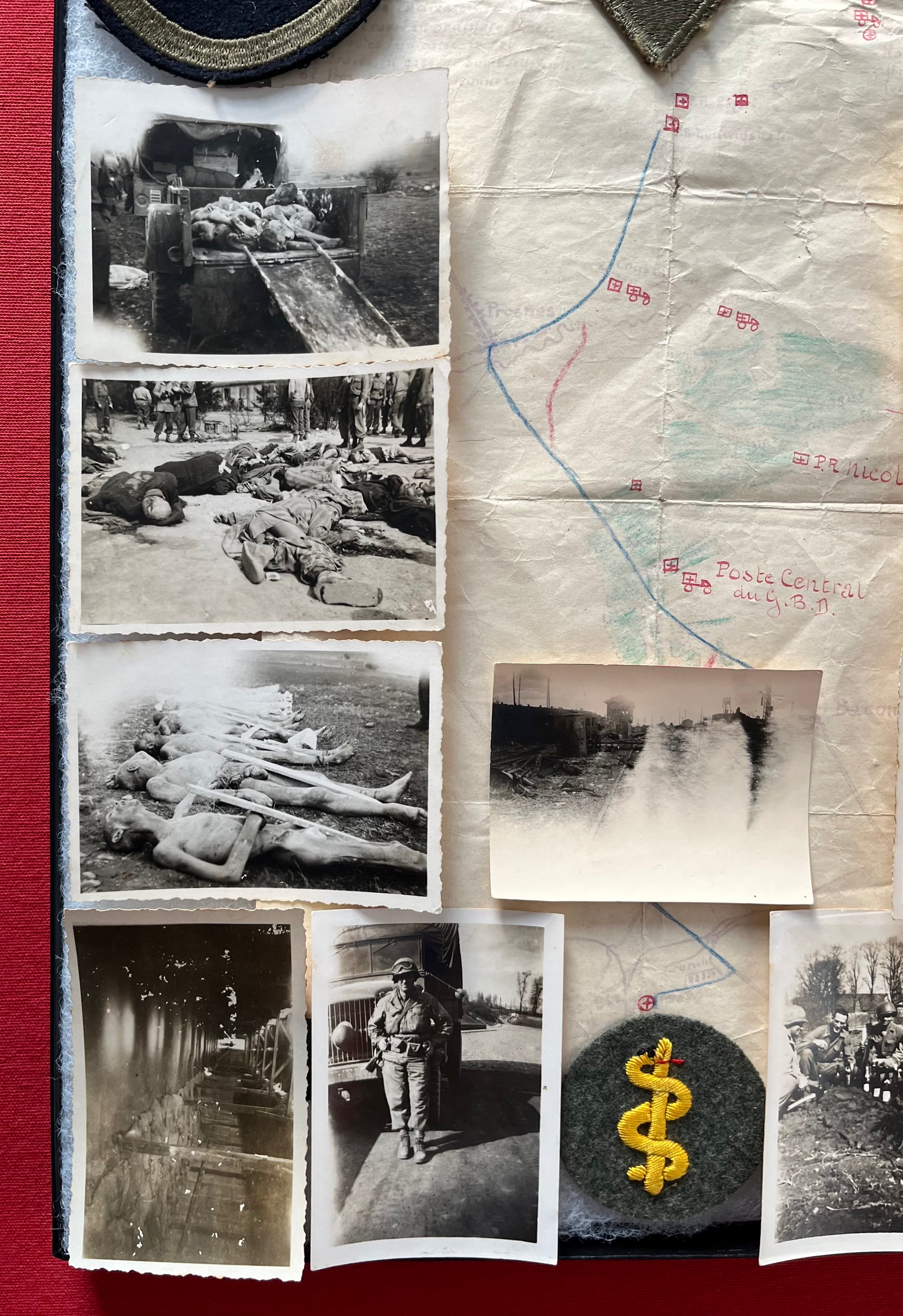 WW2 26th Infantry Division “Gusen” concentration camp liberation grouping / Original photos, map, patches and documents of Claude M. Huey (Ambulance Driver)