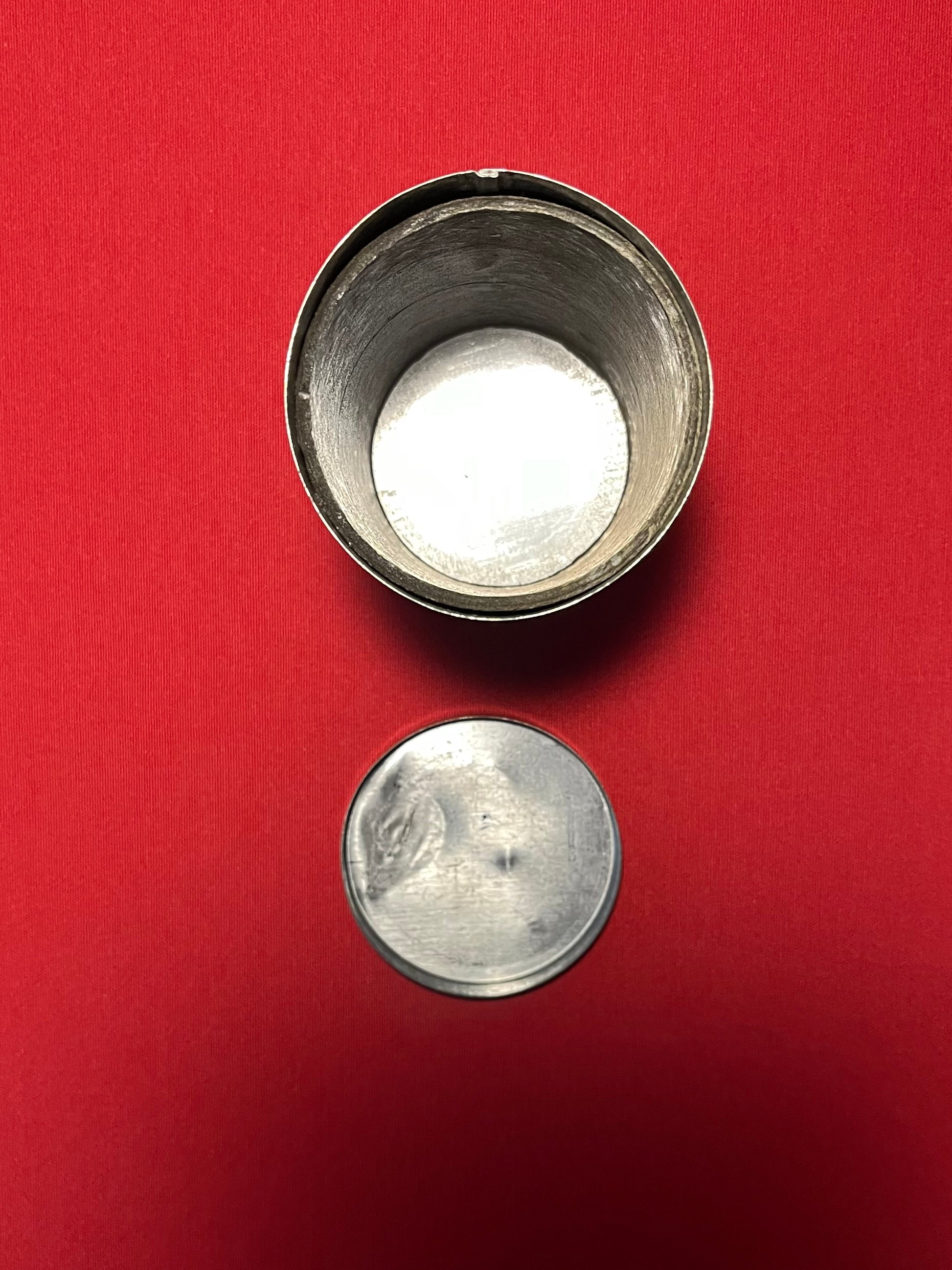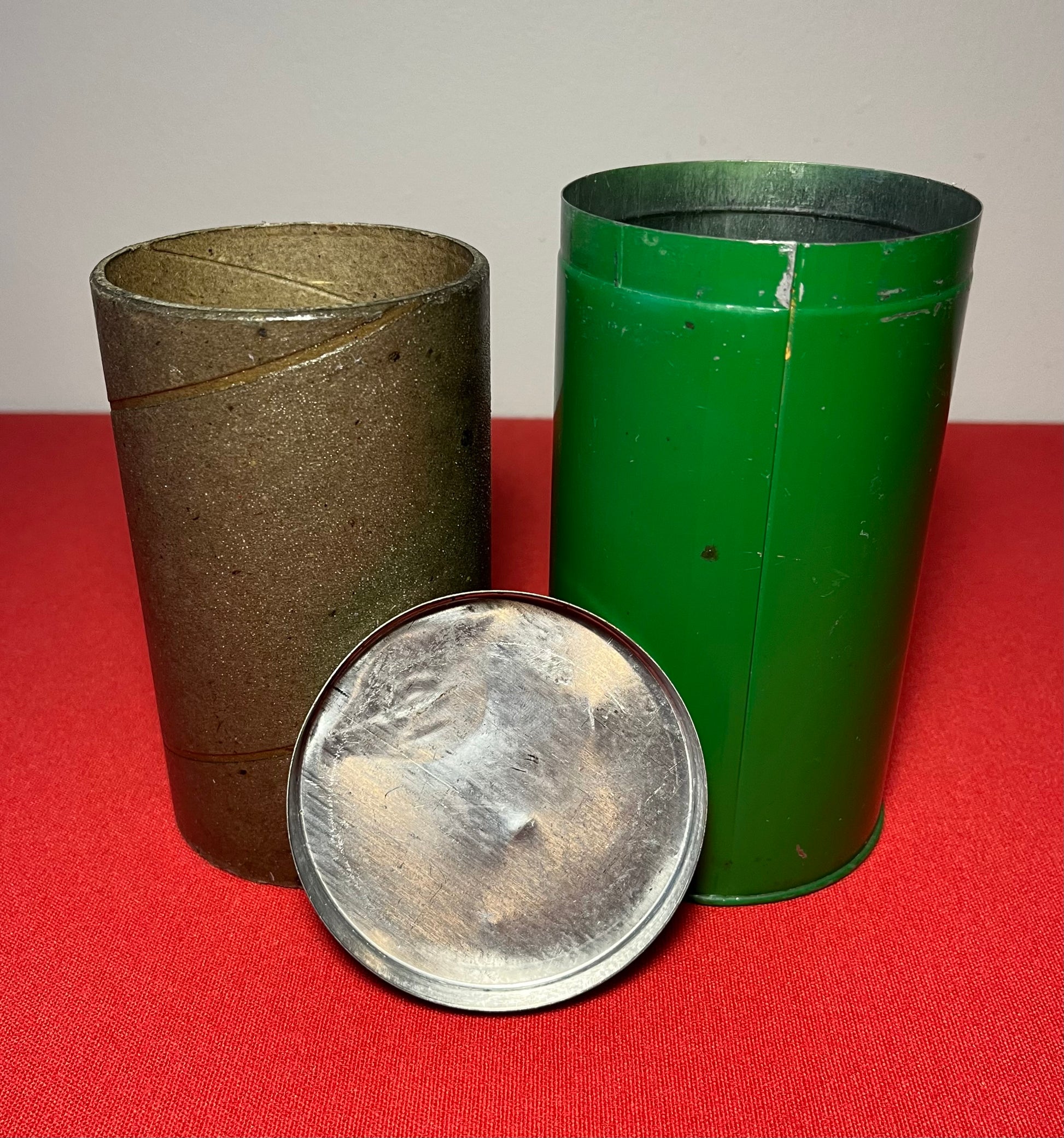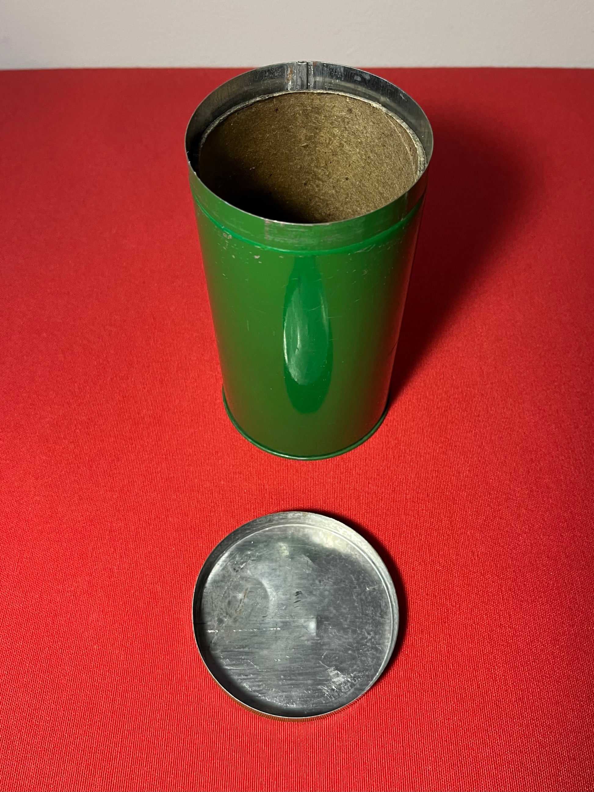 Authentic / WW2 British RAF - Royal Air Force / Size 5 3/4 x 3 1/4 Inches / Green painted tin surface / This was used for storage of the No42 MK1V Fuze / Cardboard insert still remains (Container is empty)