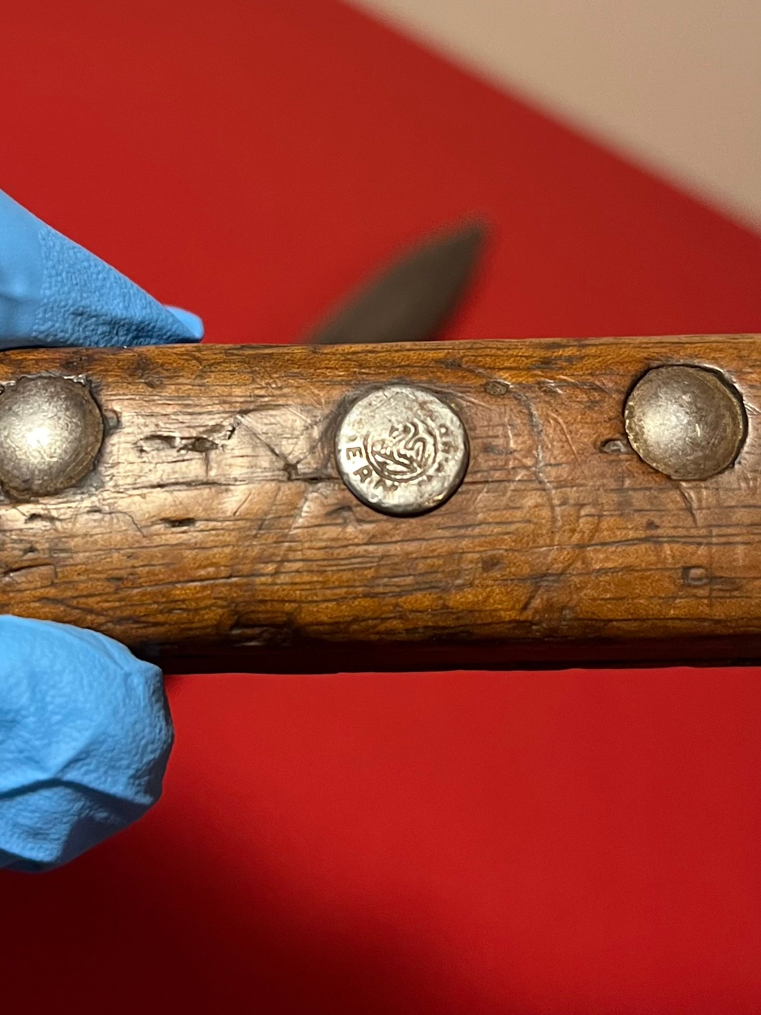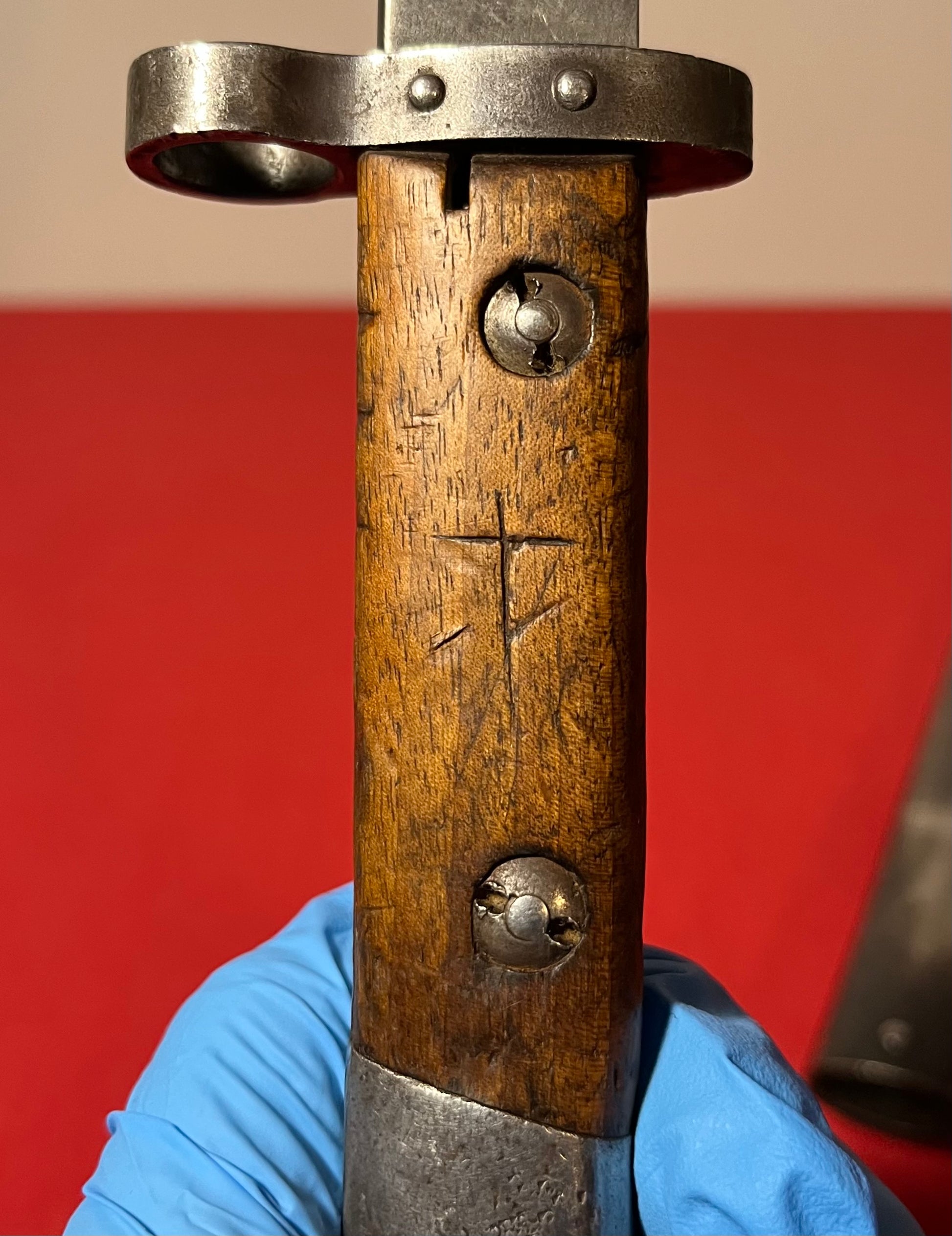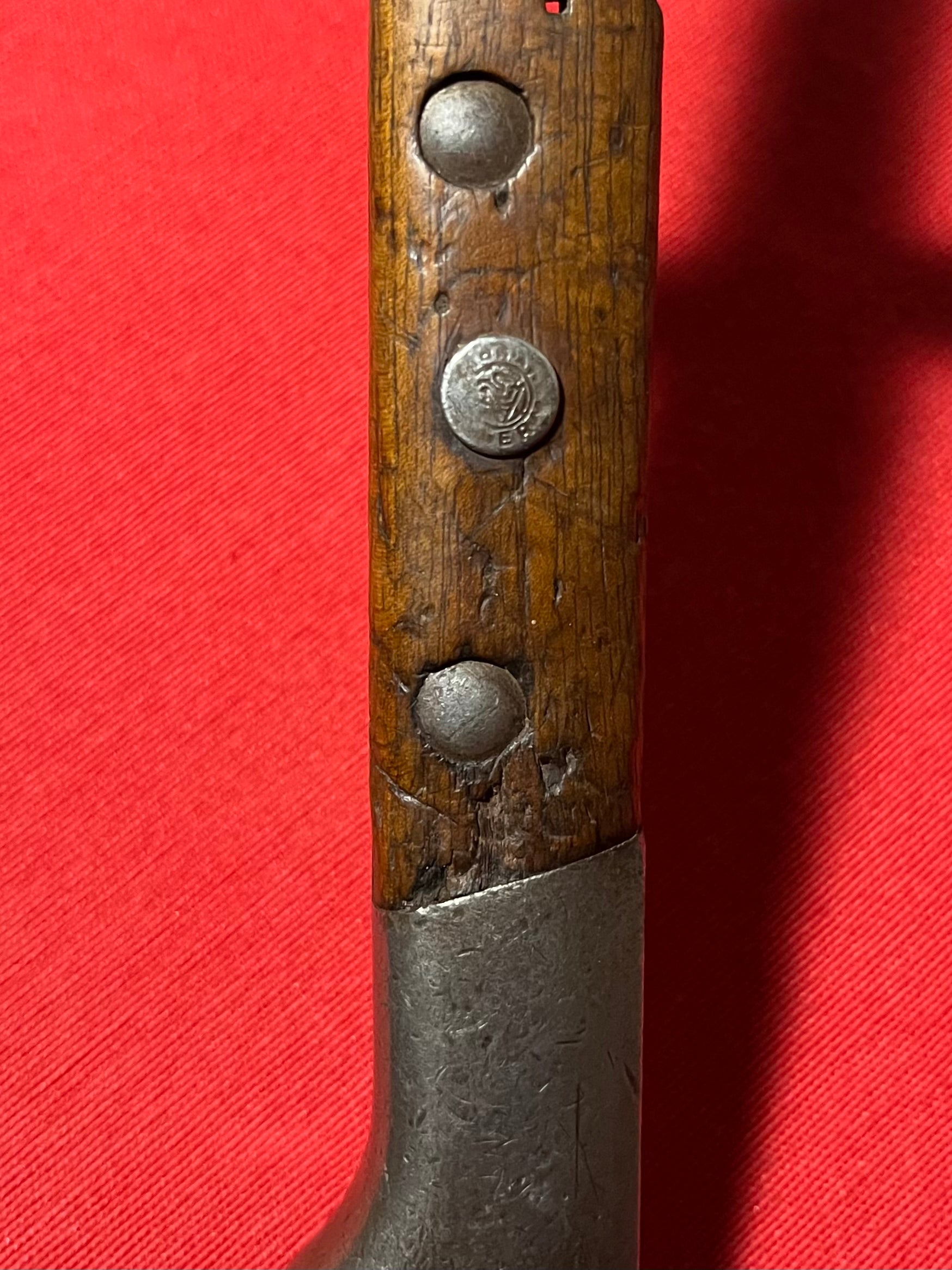 Holy water capsule in handle (blessed by a priest) with a cross & three kill notches / Religious Catholic soldier's bayonet / It also comes attached with an old museum "typewriter" typed tag / Bayonets that have holy water filled capsules in there handles are very scarce and are mostly in personal collections / This is typically seen in the buttstock of earlier firearms / WW2 Era "Long" bayonet (uncut) 17 inches overall length with an 11 5/8 inch blade / Marked CSZ B on the ricasso / General wear with age / Pictures provided for overall condition and quality
