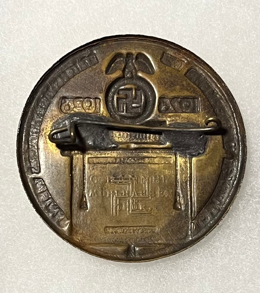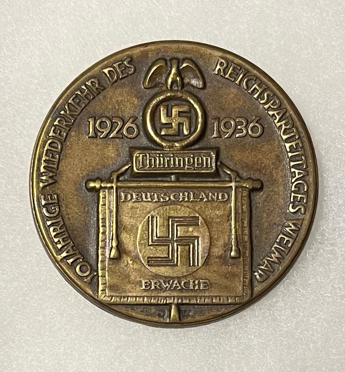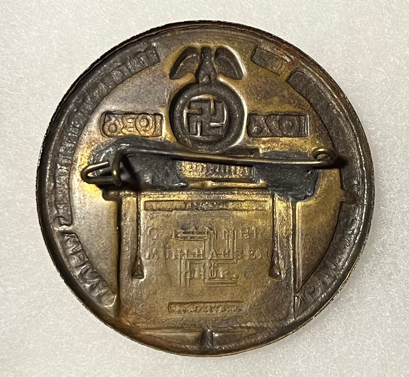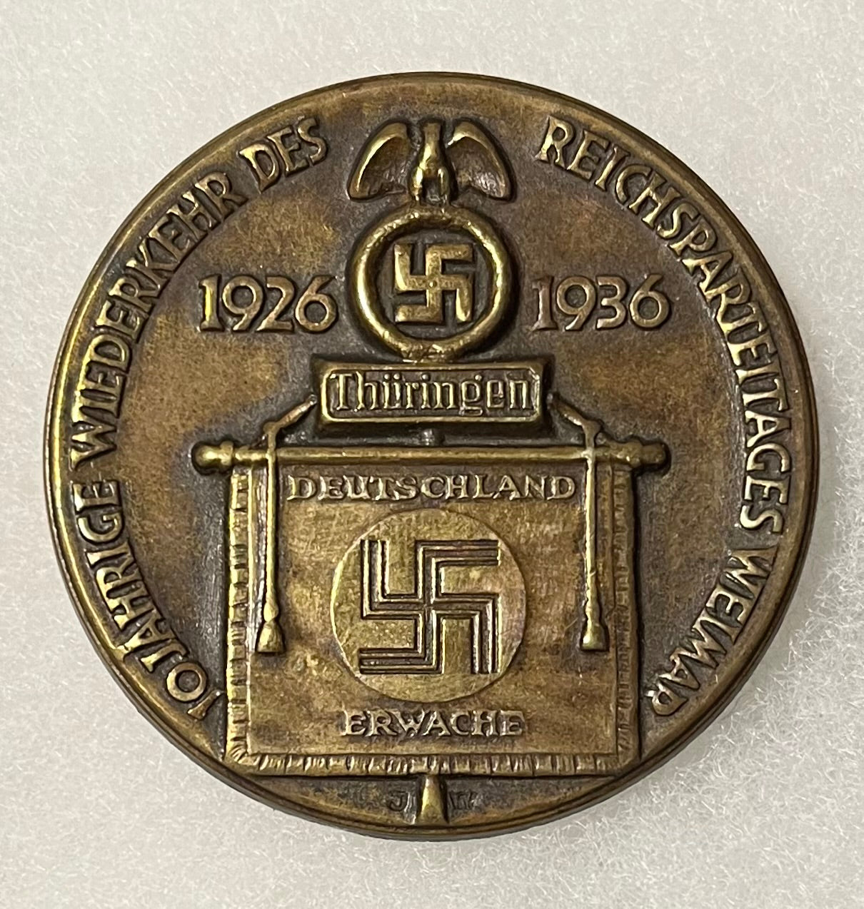 NSDAP (Nazi Party) 10th Anniversary of the party in Weimar Tinnie -1926-1936 – Die-stamped metal with a bronze gilt, magnetic, maker marked “G. DANNER MURLHAUSEN THUR" on the reverse side, very crisp detail, 49 mm, horizontal pin-back (top of pin missing) These were issued to individuals in attendance of the celebration