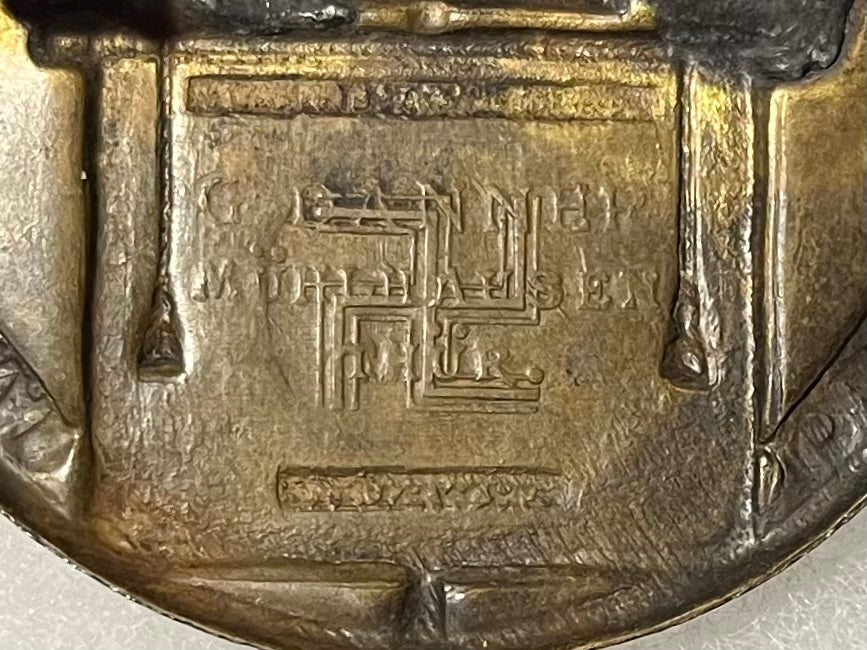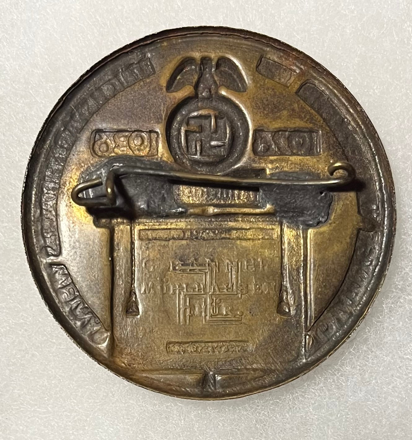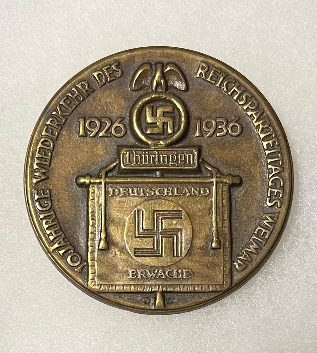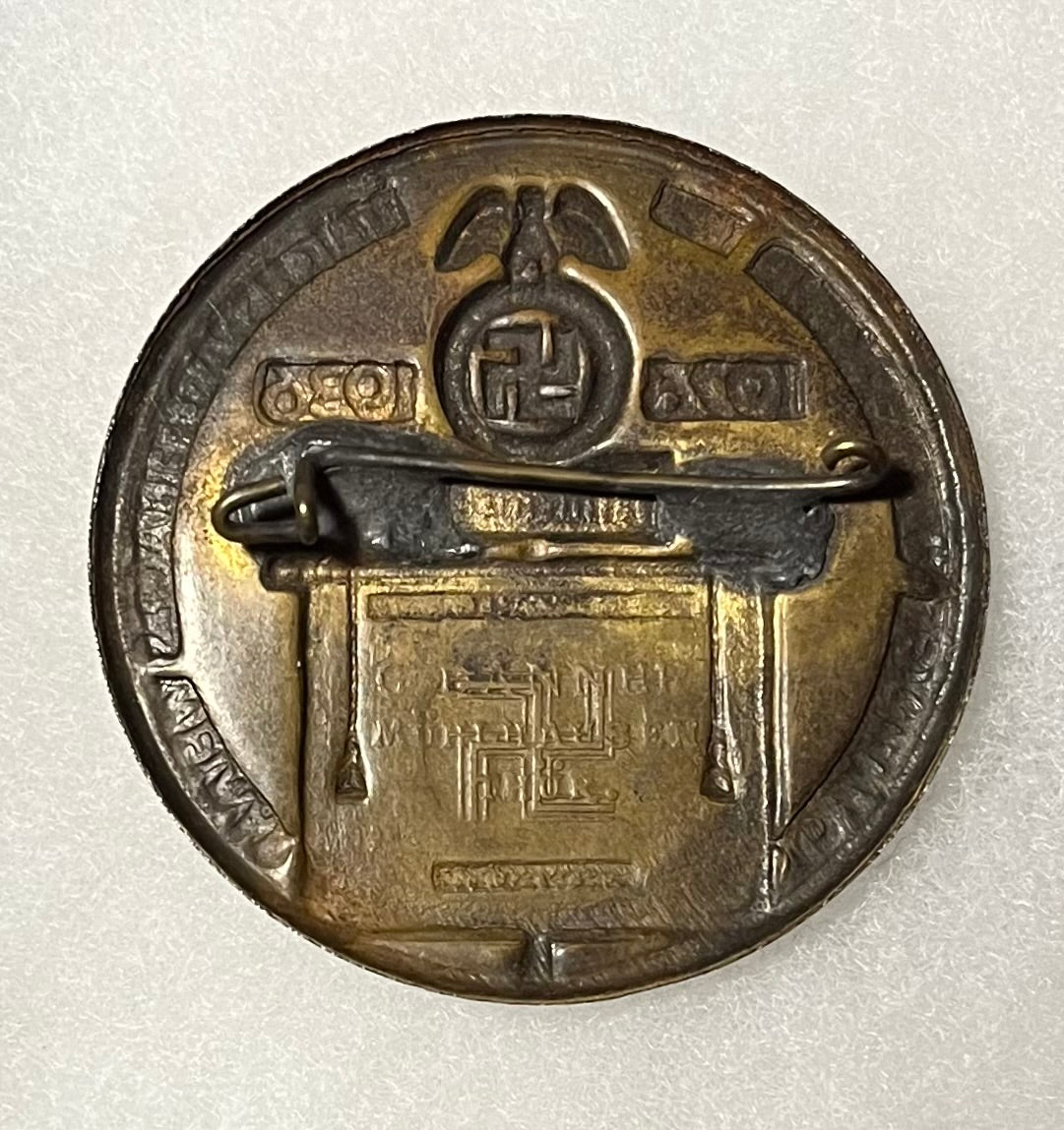 NSDAP (Nazi Party) 10th Anniversary of the party in Weimar Tinnie -1926-1936 – Die-stamped metal with a bronze gilt, magnetic, maker marked “G. DANNER MURLHAUSEN THUR" on the reverse side, very crisp detail, 49 mm, horizontal pin-back (top of pin missing) These were issued to individuals in attendance of the celebration