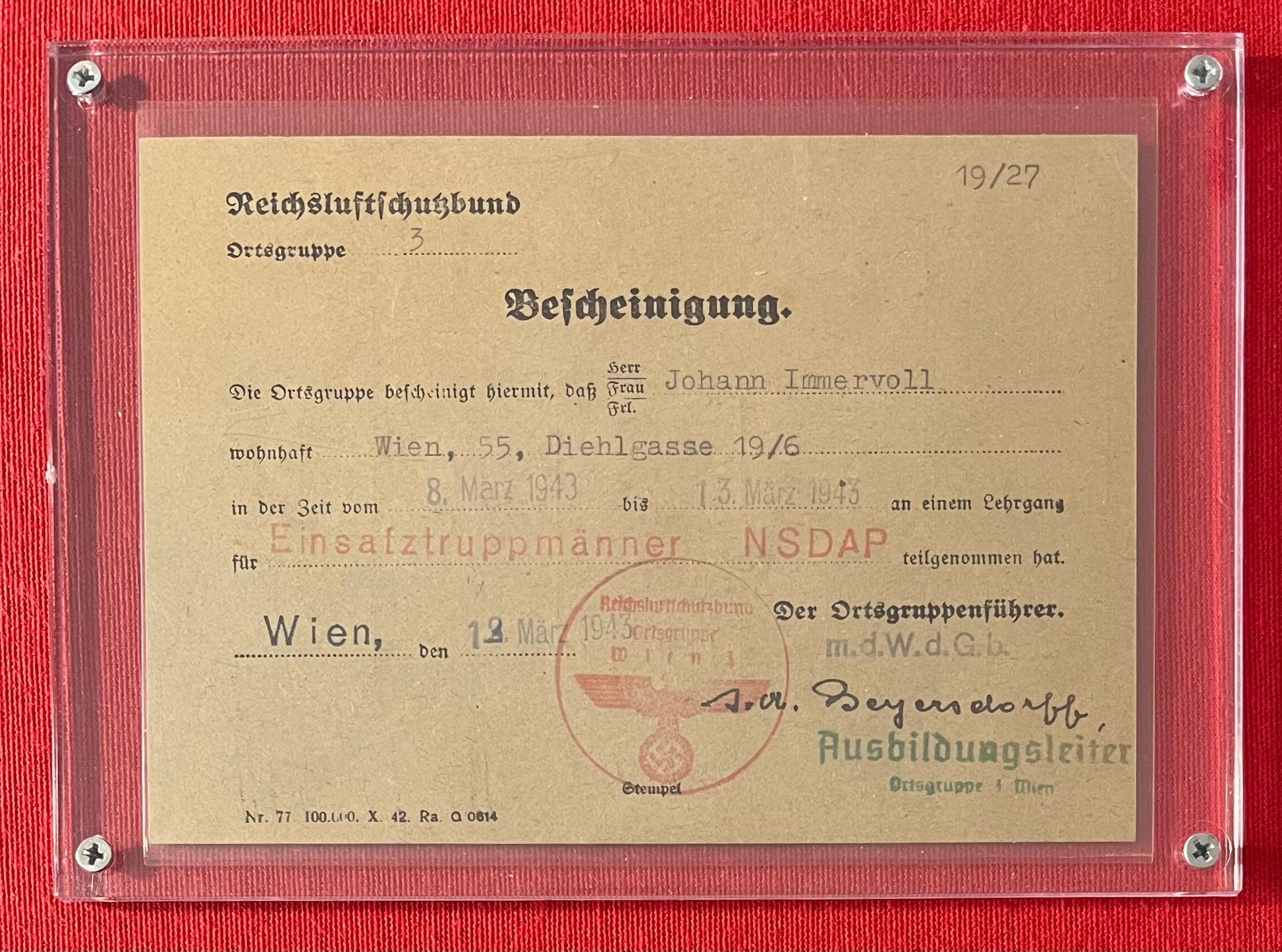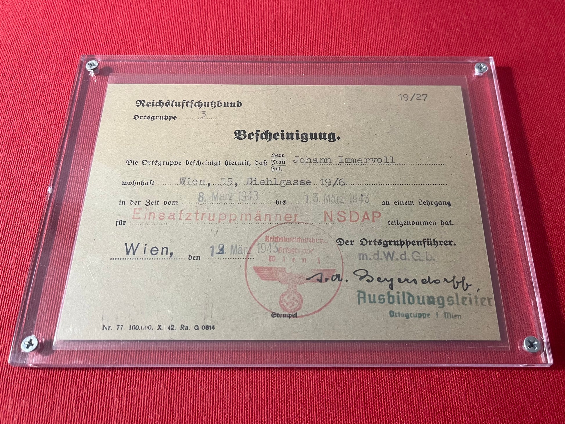 Authentic / Dated 1943 / Certification card from the NSDAP (Nazi Party) Size 5.75” x 4“ / Translation in photo area / Certification class held in Vienna / Comes in protective acrylic display (You can unscrew display if necessary to remove)