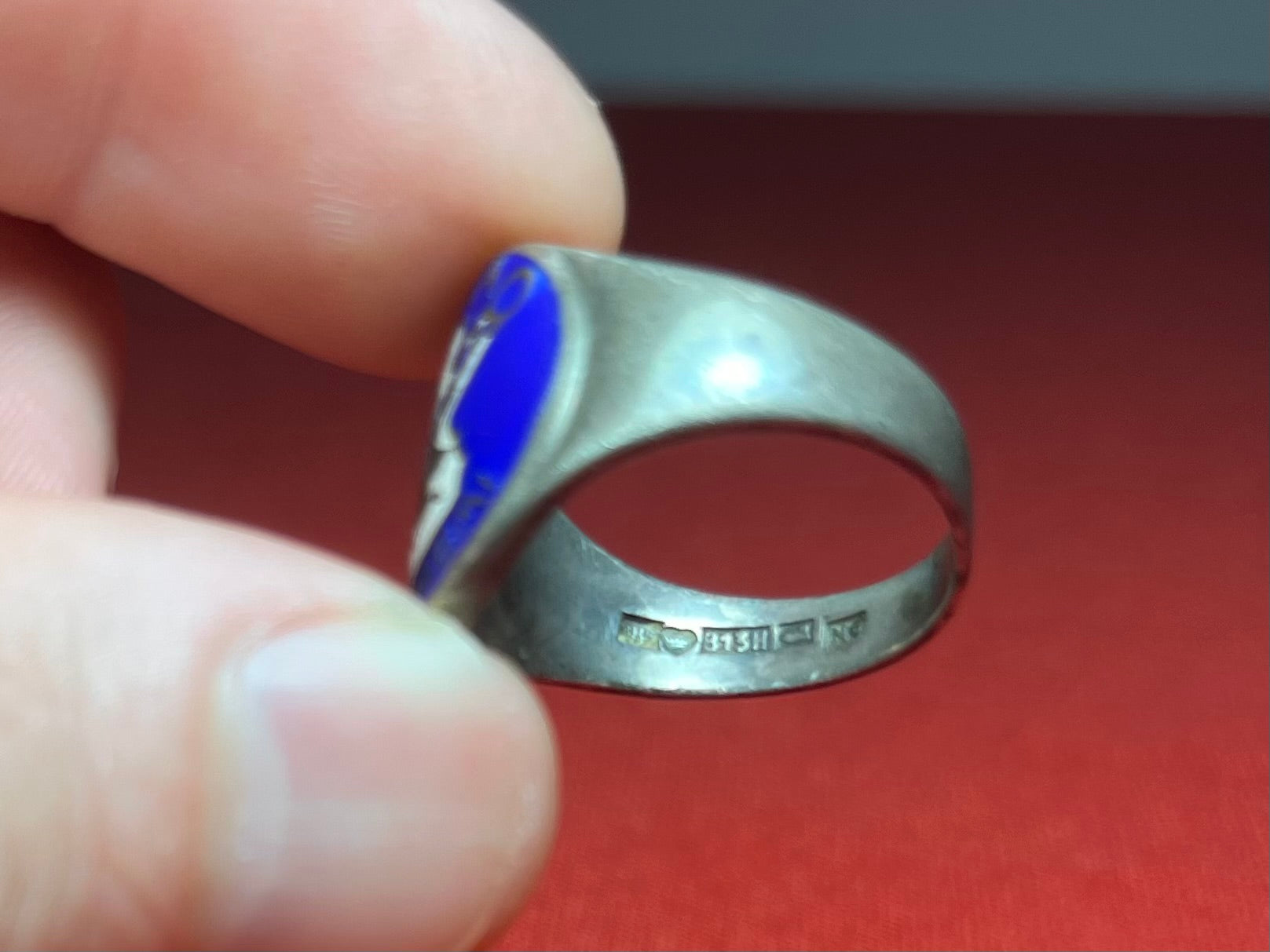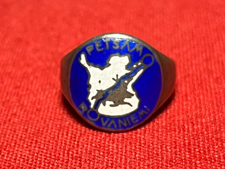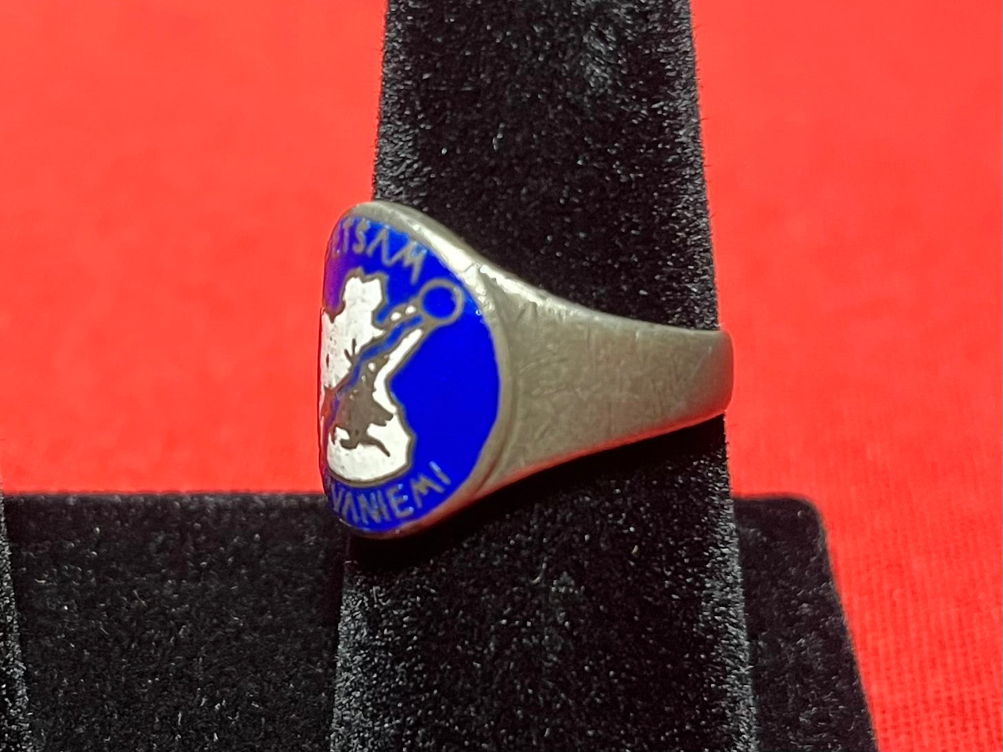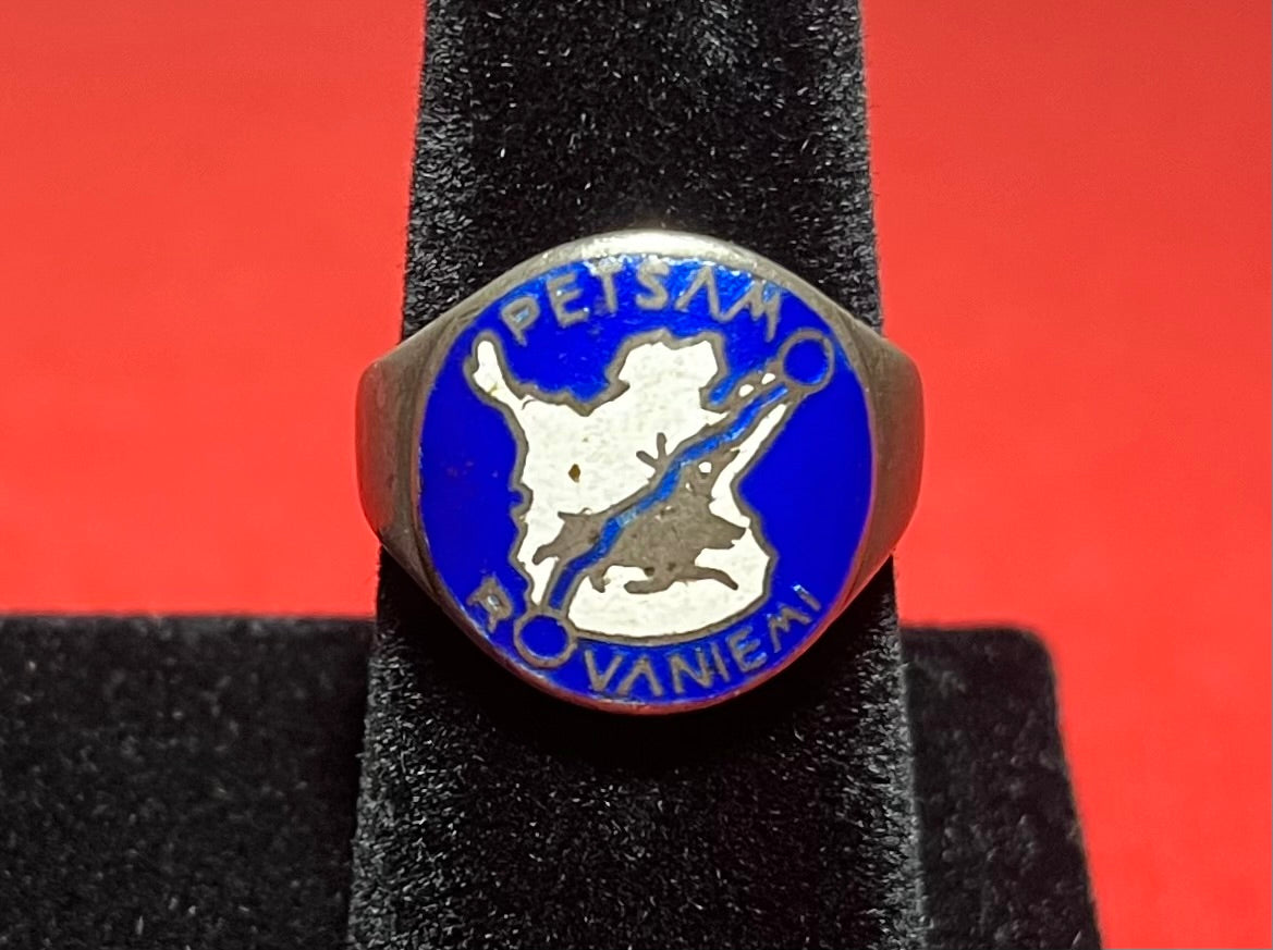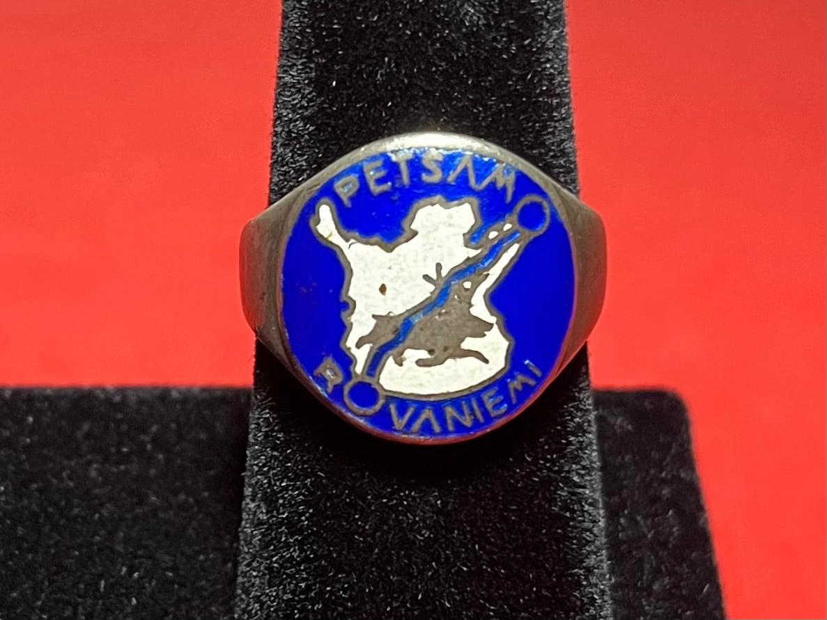 This ring was given to soldiers involved in the 820 km winter march from Petsamo to Rovaniemi in Lapland (Finland) which took place from October 25th through December 2nd, 1941 / German "allies" ring / Finnish hallmarks inside of ring / Blue enamel face / Ring is constructed of silver / General wear with age / Size of ring is 10.25 |