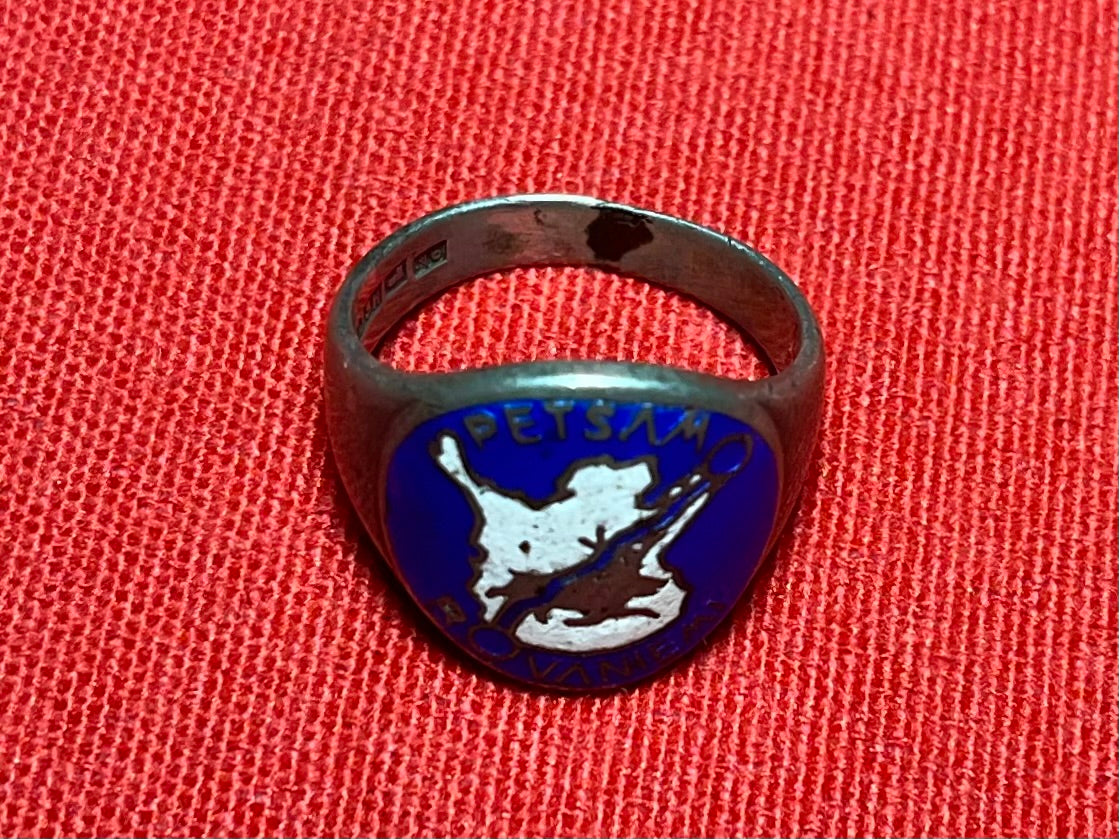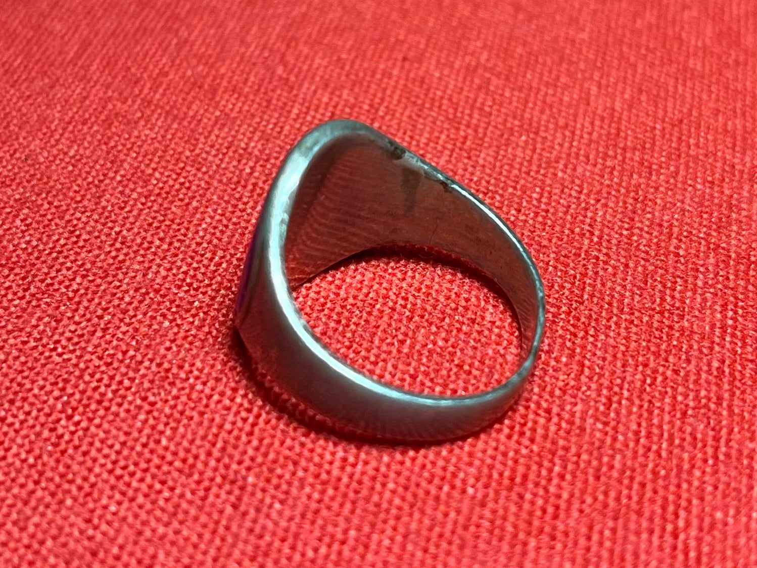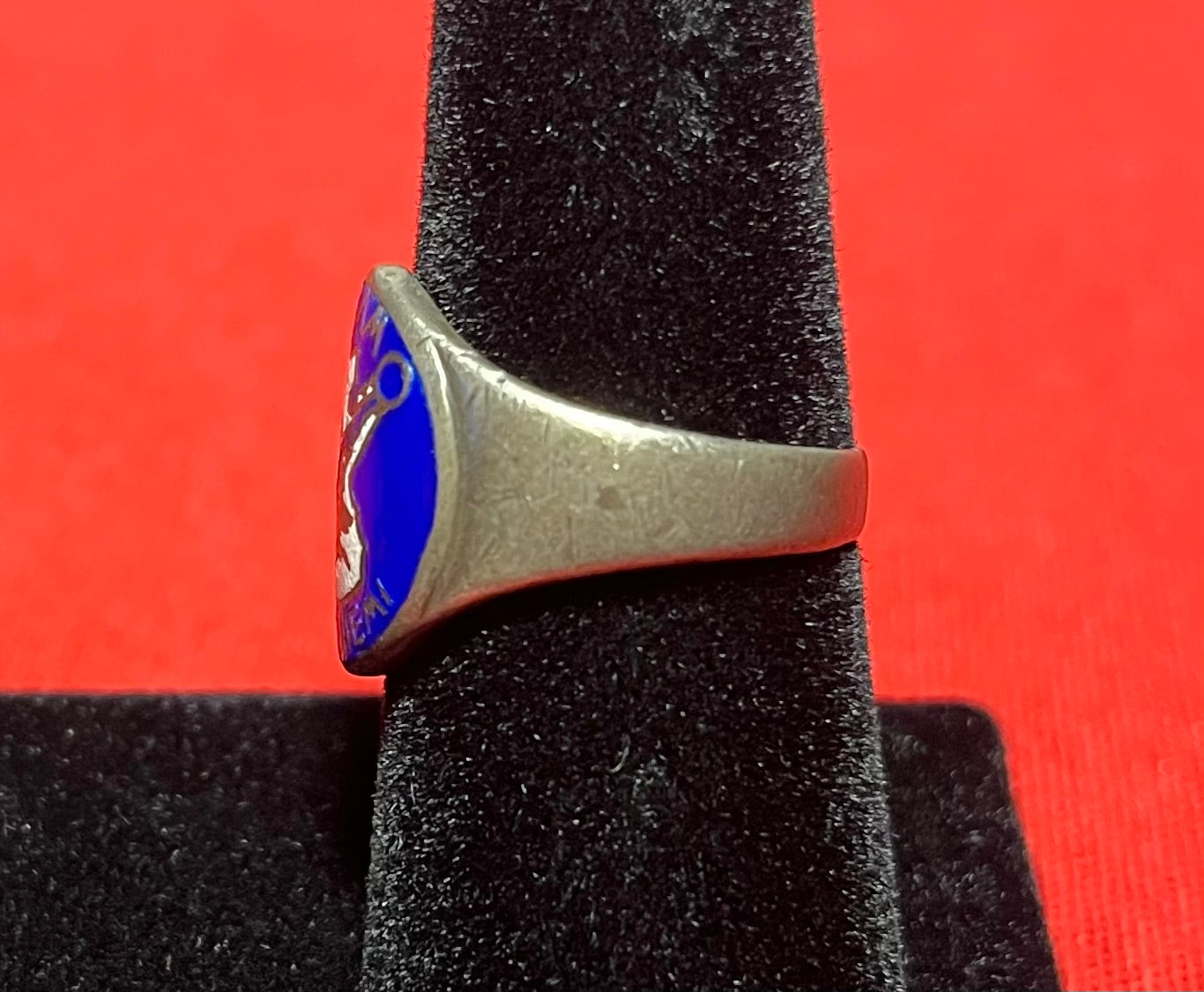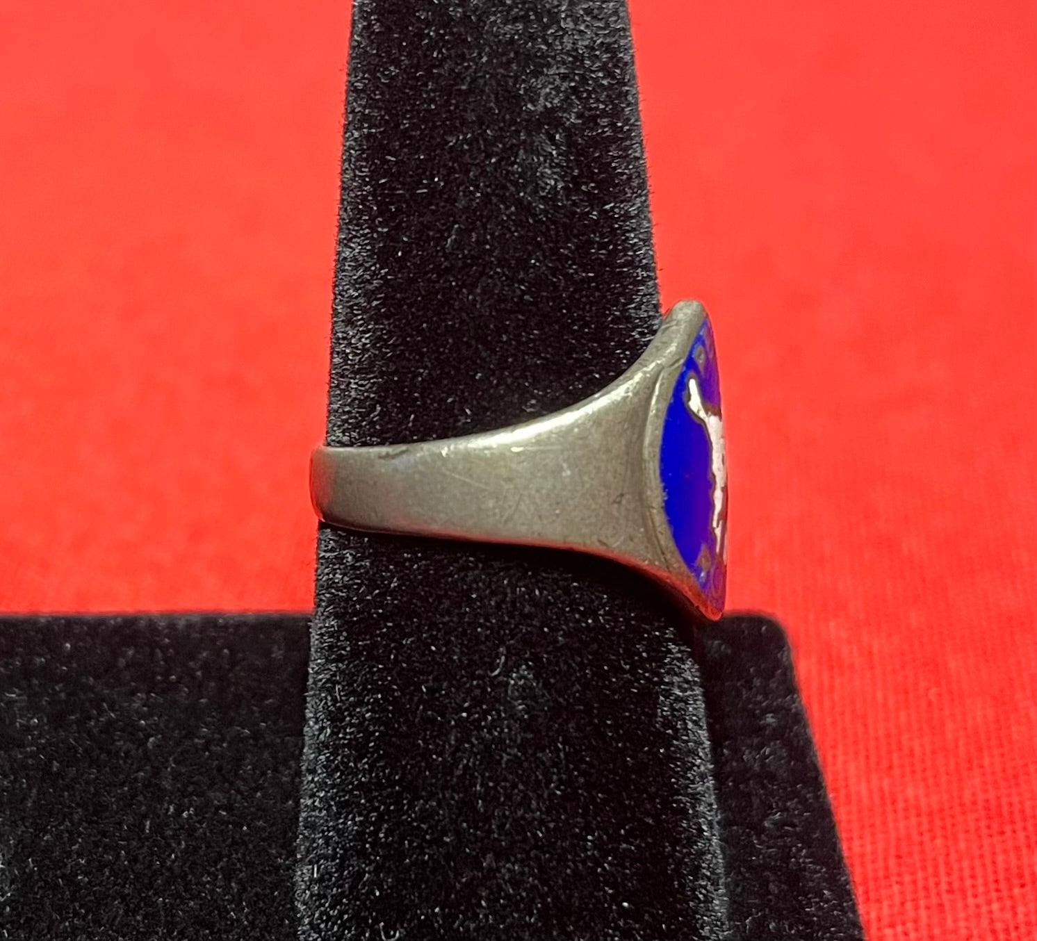This ring was given to soldiers involved in the 820 km winter march from Petsamo to Rovaniemi in Lapland (Finland) which took place from October 25th through December 2nd, 1941 / German "allies" ring / Finnish hallmarks inside of ring / Blue enamel face / Ring is constructed of silver / General wear with age / Size of ring is 10.25 |