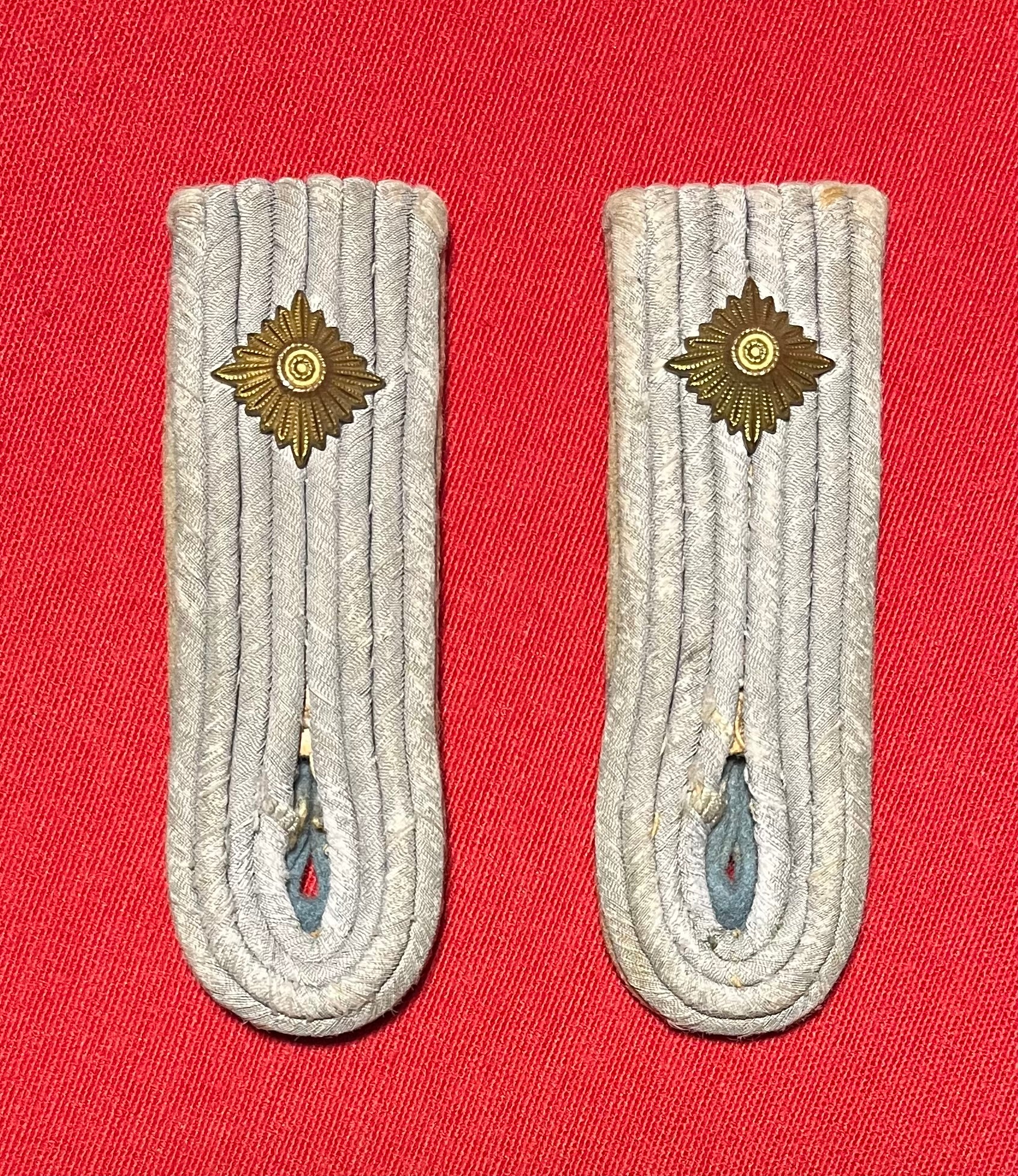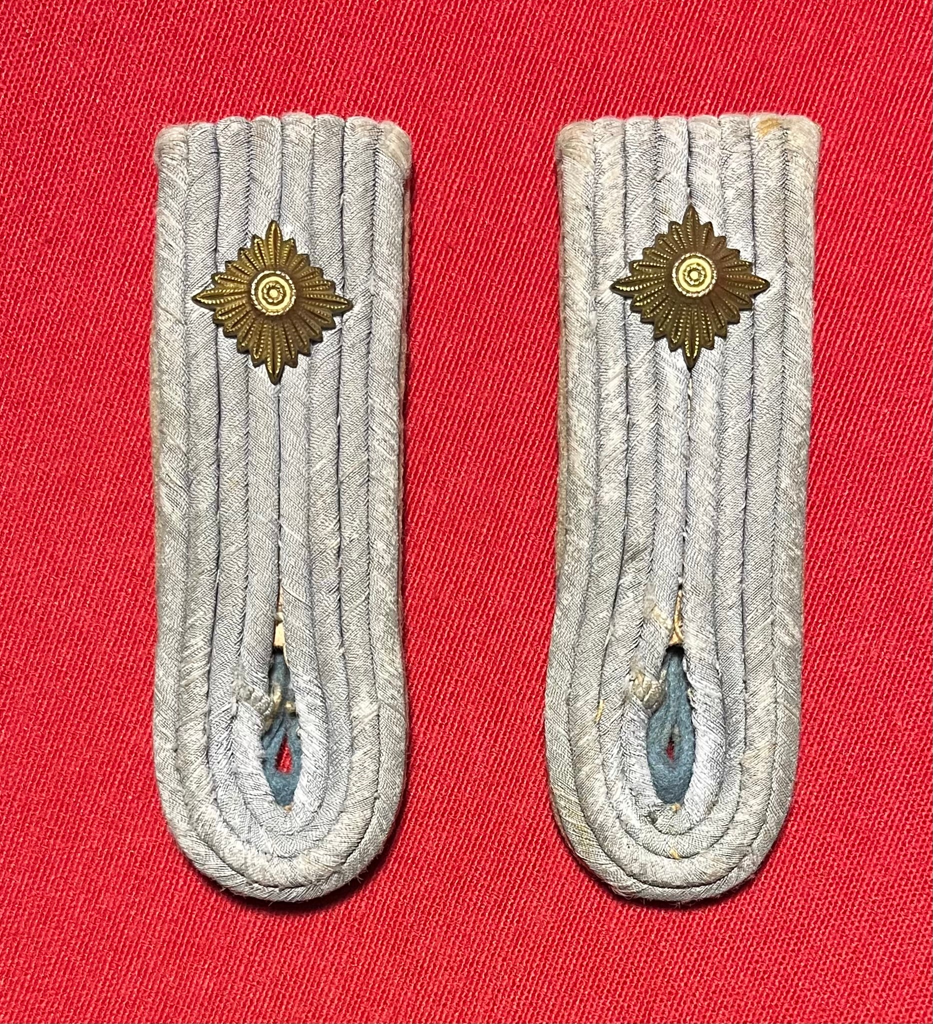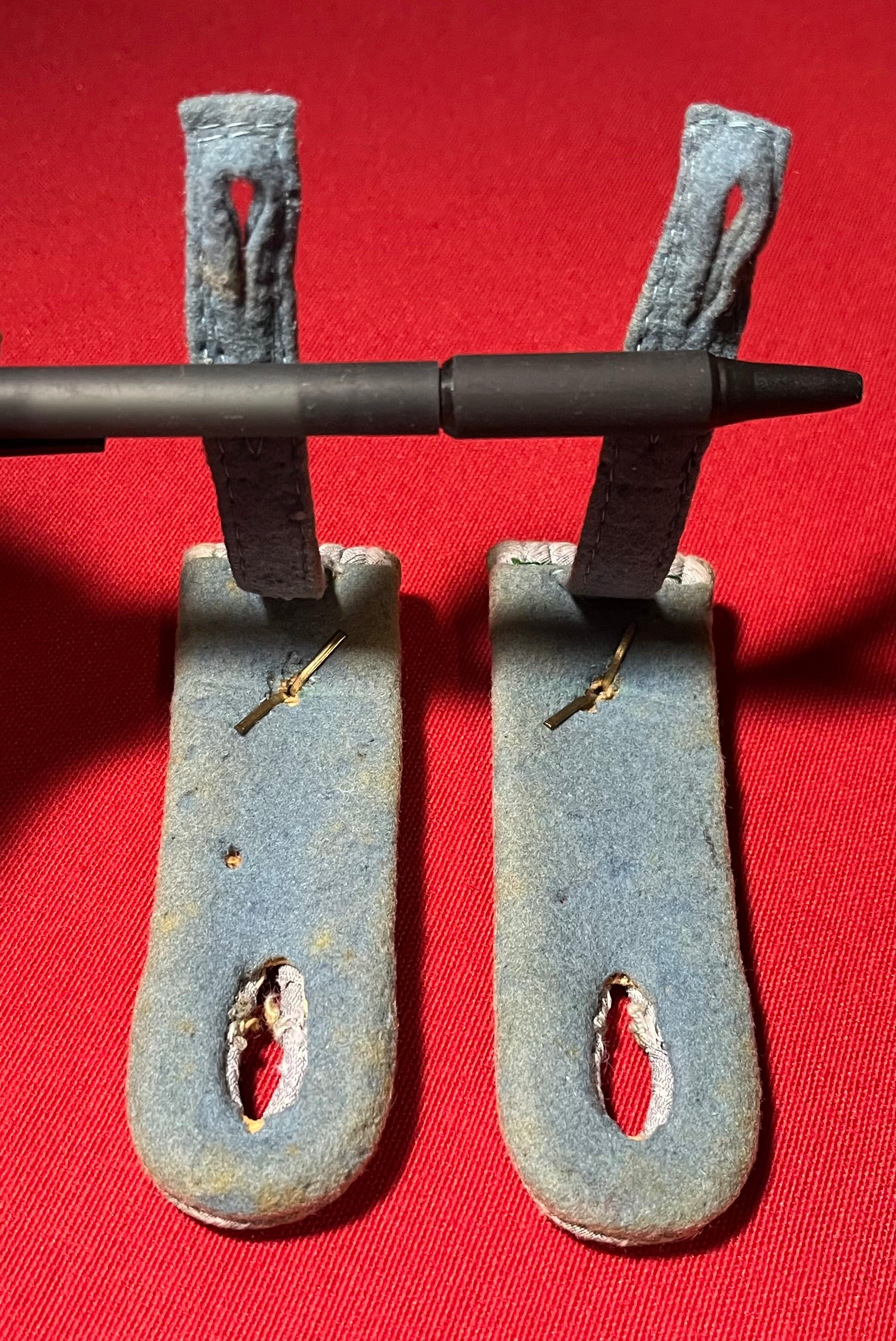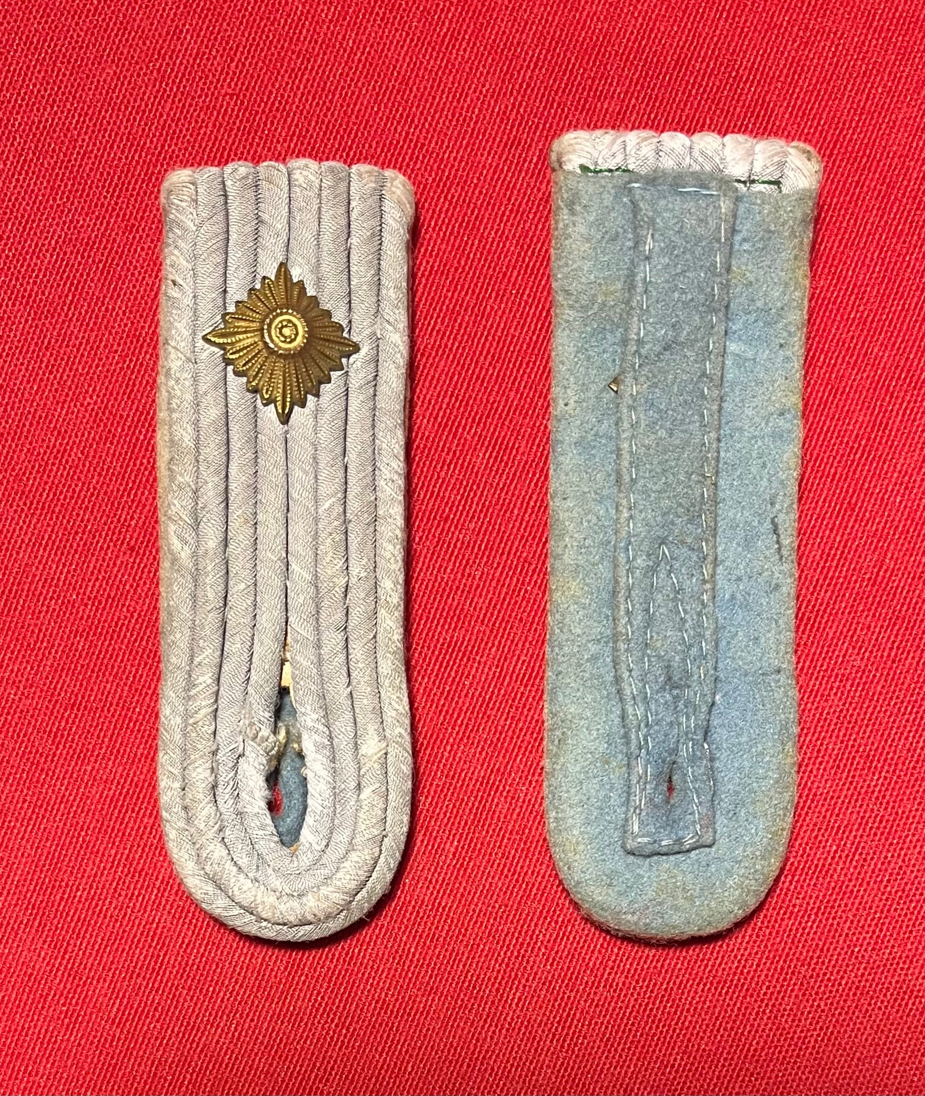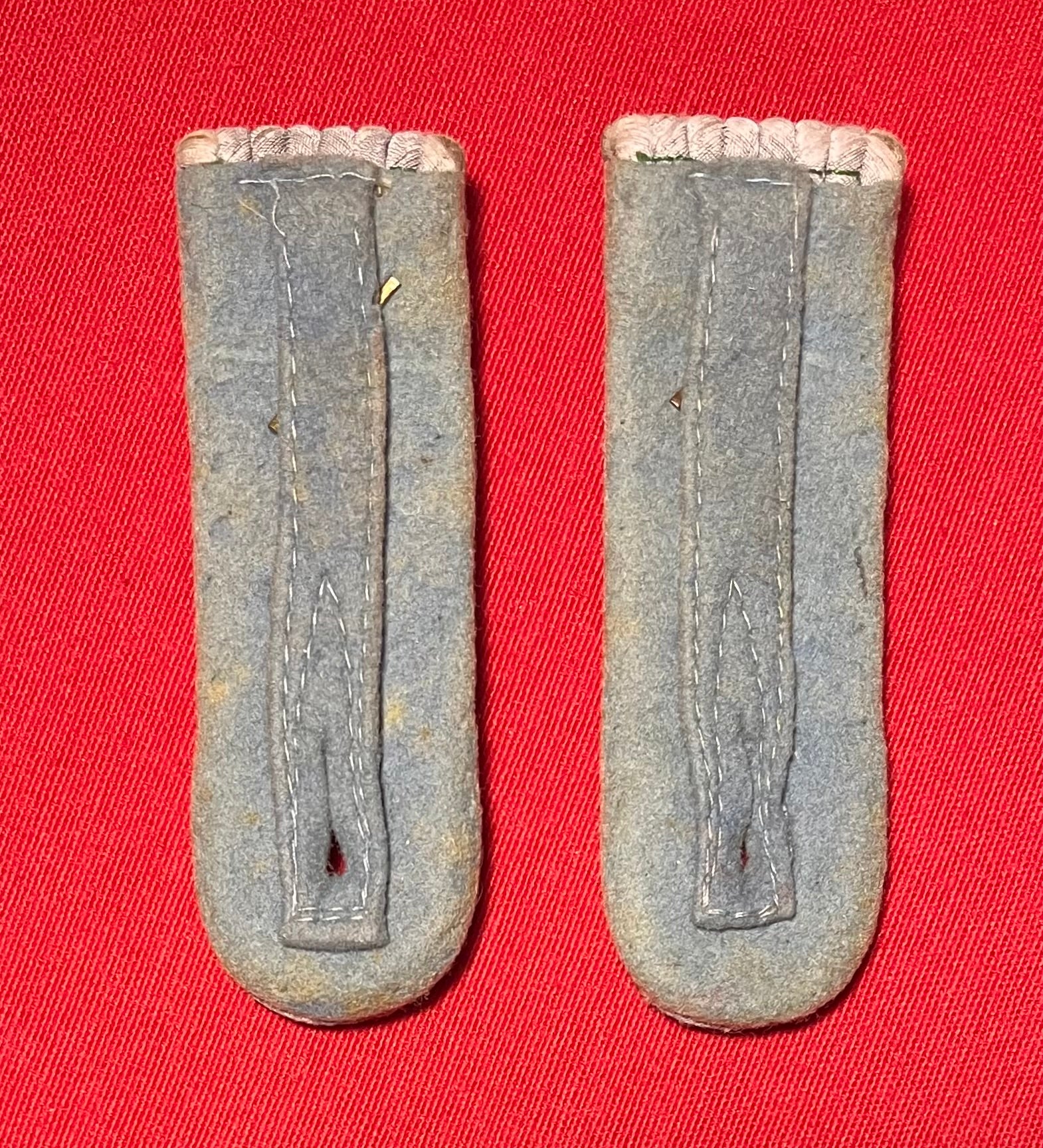 This is a scarce matching pair of shoulder boards with light gray-blue Waffenfarbe for a Specialist Officer. Slip-on style, with pips for a 1st Lieutenant. Authentic (used) pair showing signs of wear.