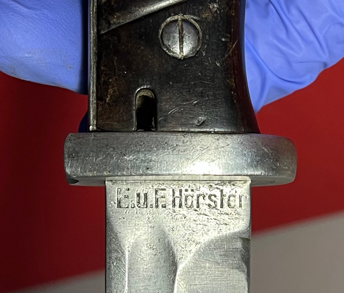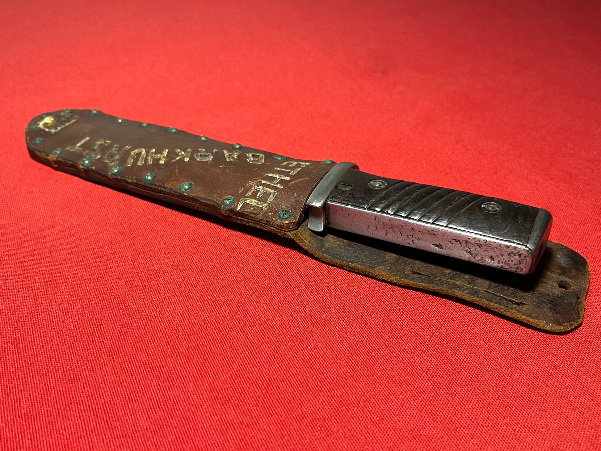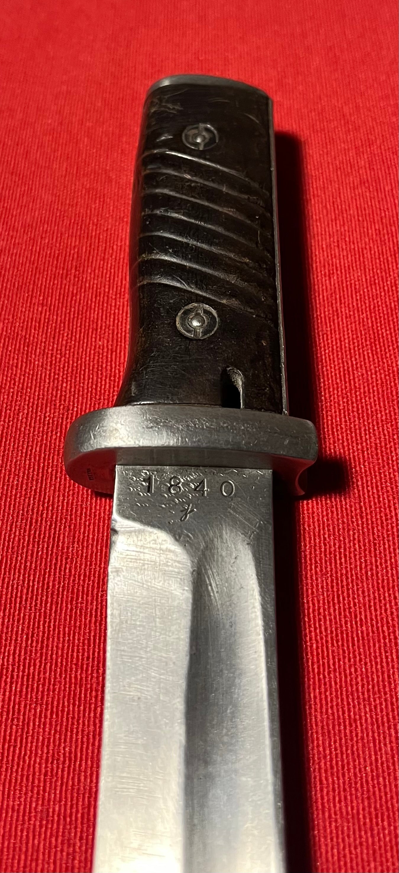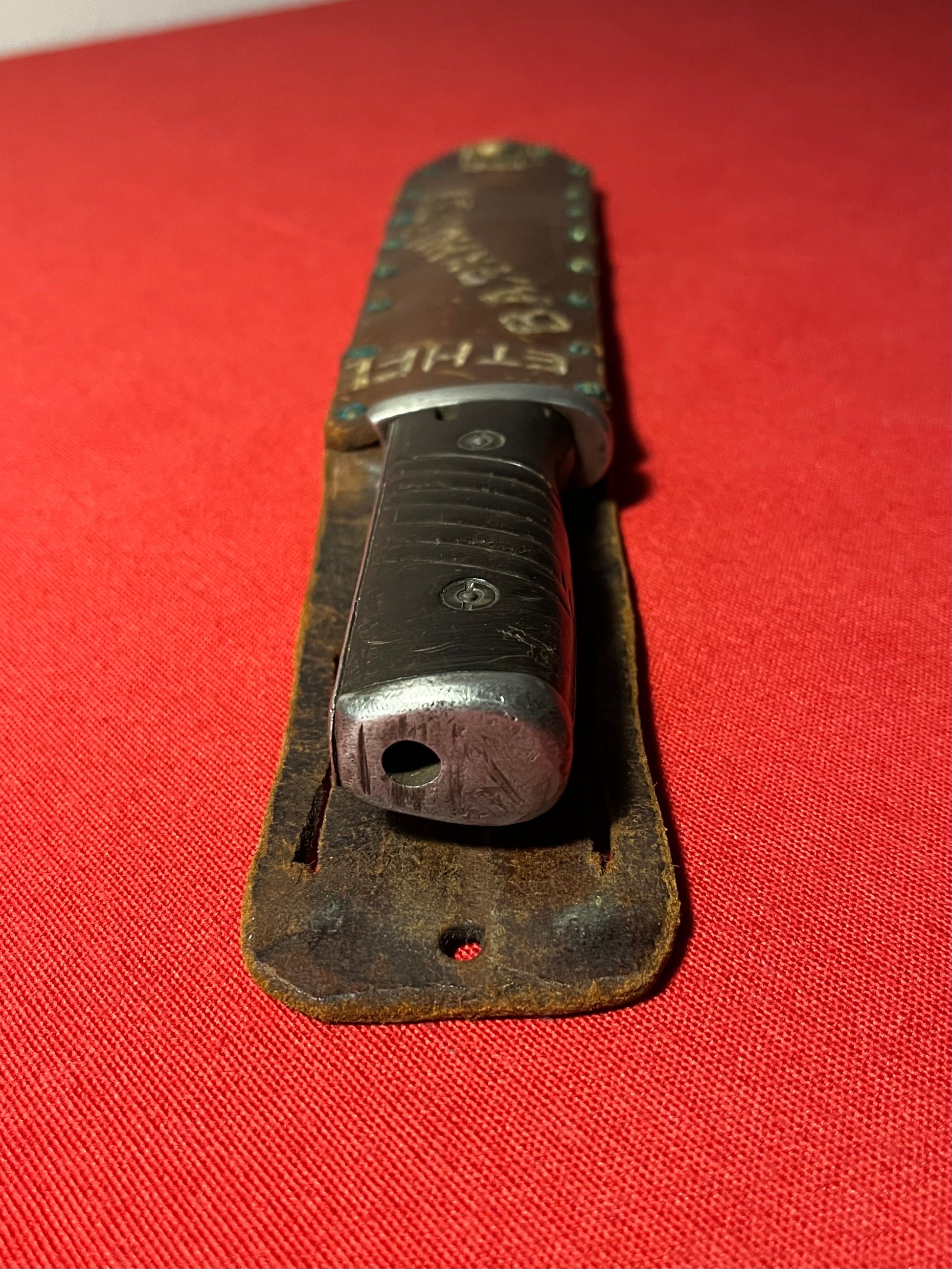 Authentic / WW2 German / K98 bayonet cut down into a fighting knife / Engraved with wife's name most likely "Ethel Barkhurst" on leather sheath / Sheath is manufactured using brass screws and washers / Overall size of knife is 9 5/8 inches / Blade size 6 1/8 inches / Theater made piece / Manufacturer is E.U.F.Horster # 1840 / Waffenamt code / Number 38 on spine / General wear with age and use