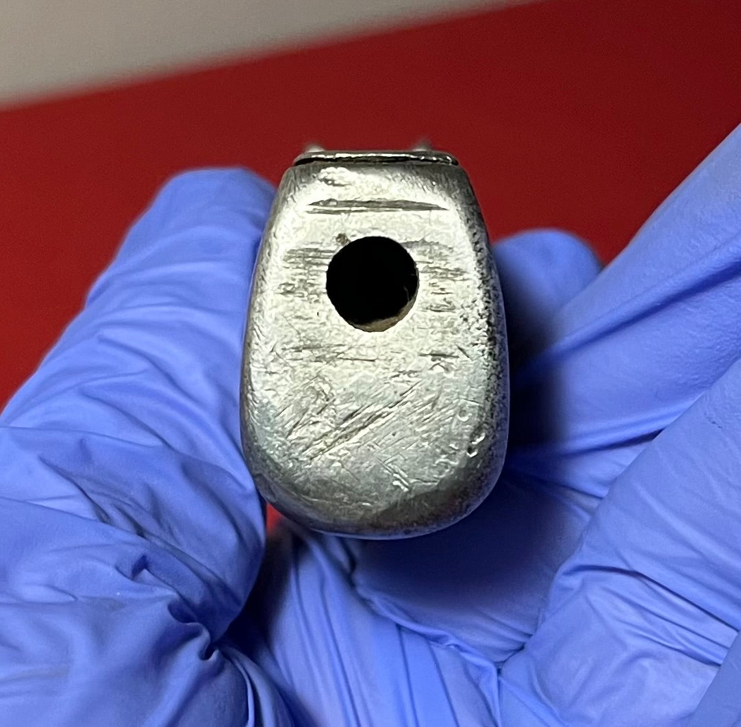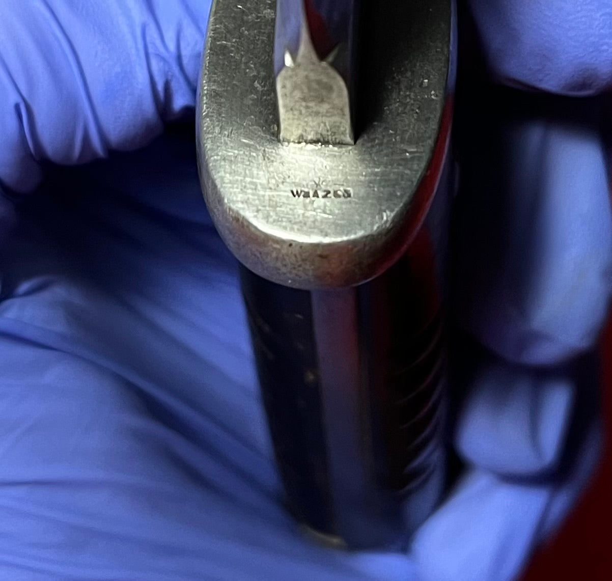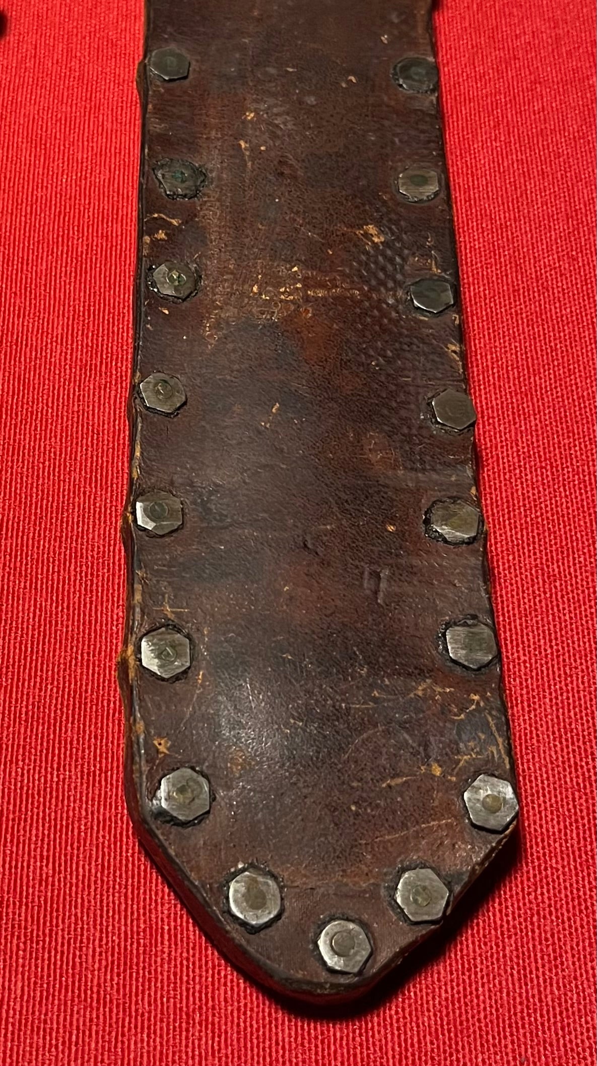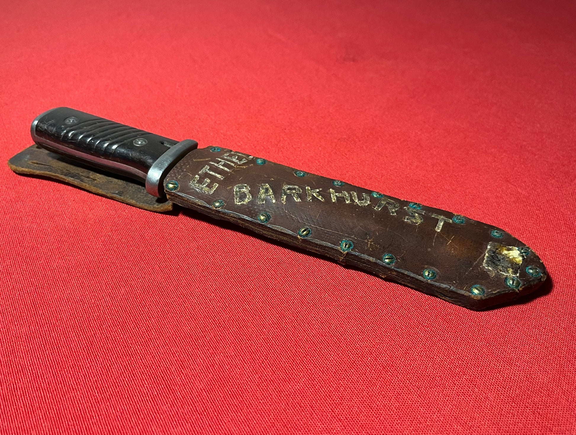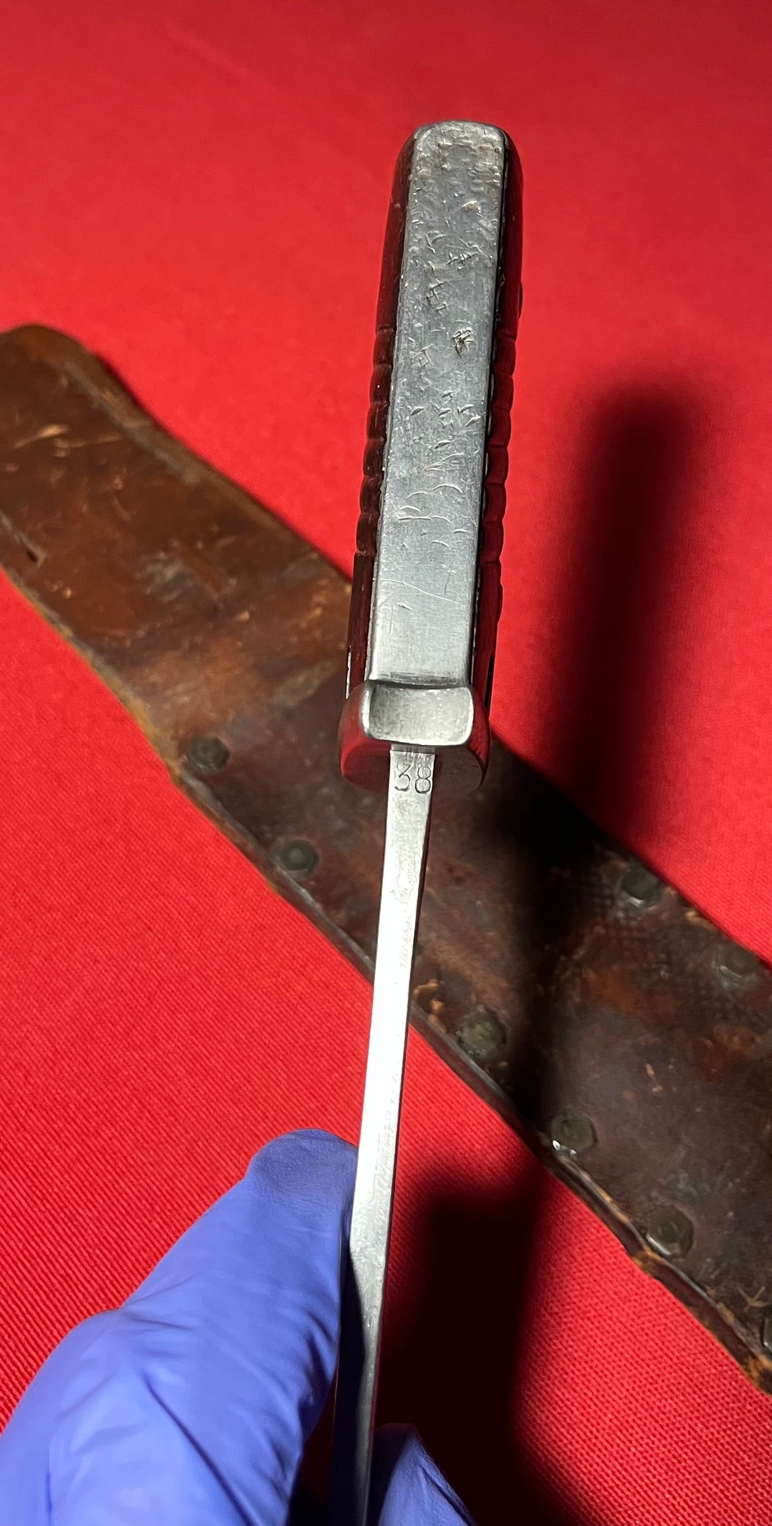 Authentic / WW2 German / K98 bayonet cut down into a fighting knife / Engraved with wife's name most likely "Ethel Barkhurst" on leather sheath / Sheath is manufactured using brass screws and washers / Overall size of knife is 9 5/8 inches / Blade size 6 1/8 inches / Theater made piece / Manufacturer is E.U.F.Horster # 1840 / Waffenamt code / Number 38 on spine / General wear with age and use