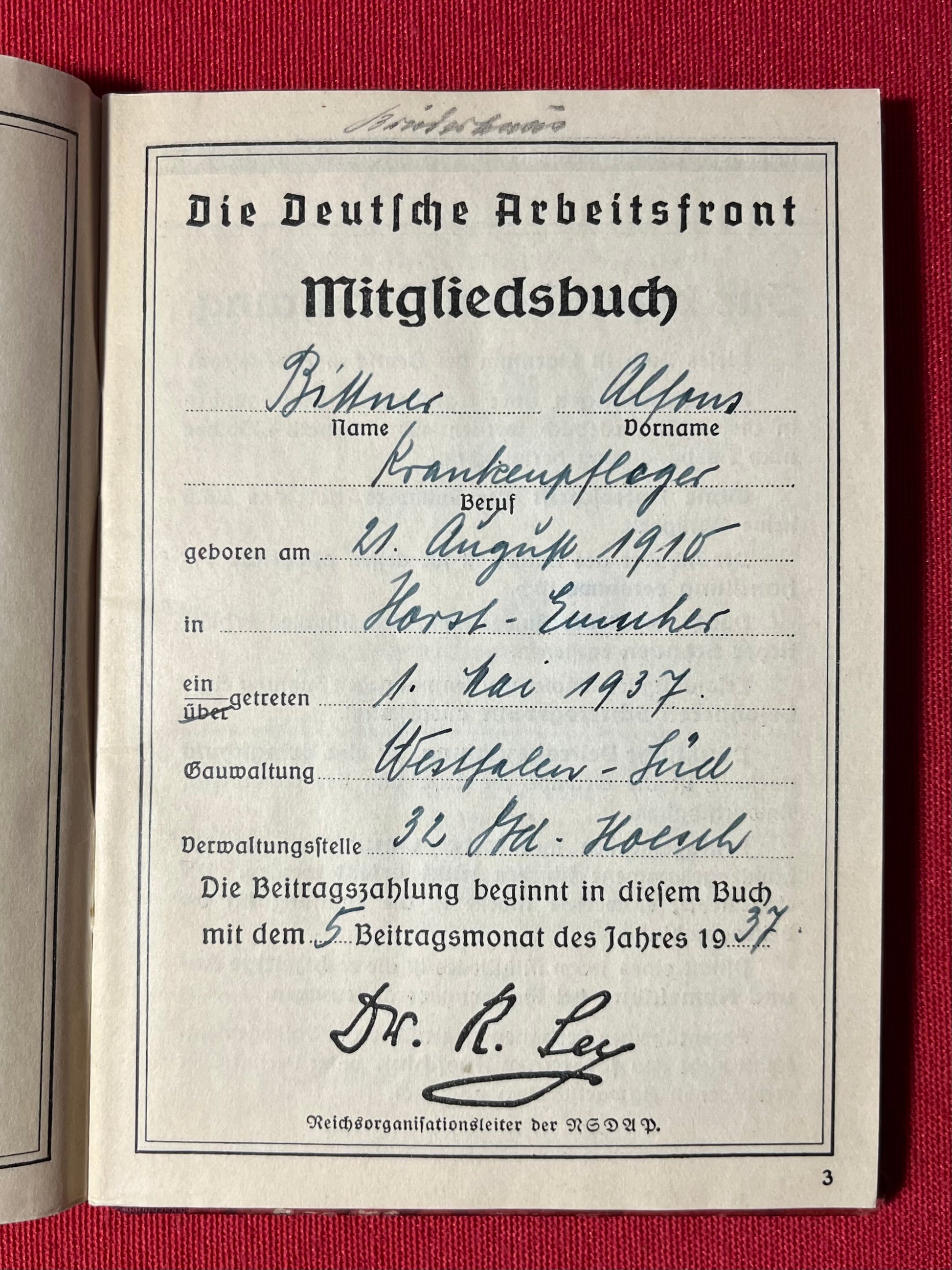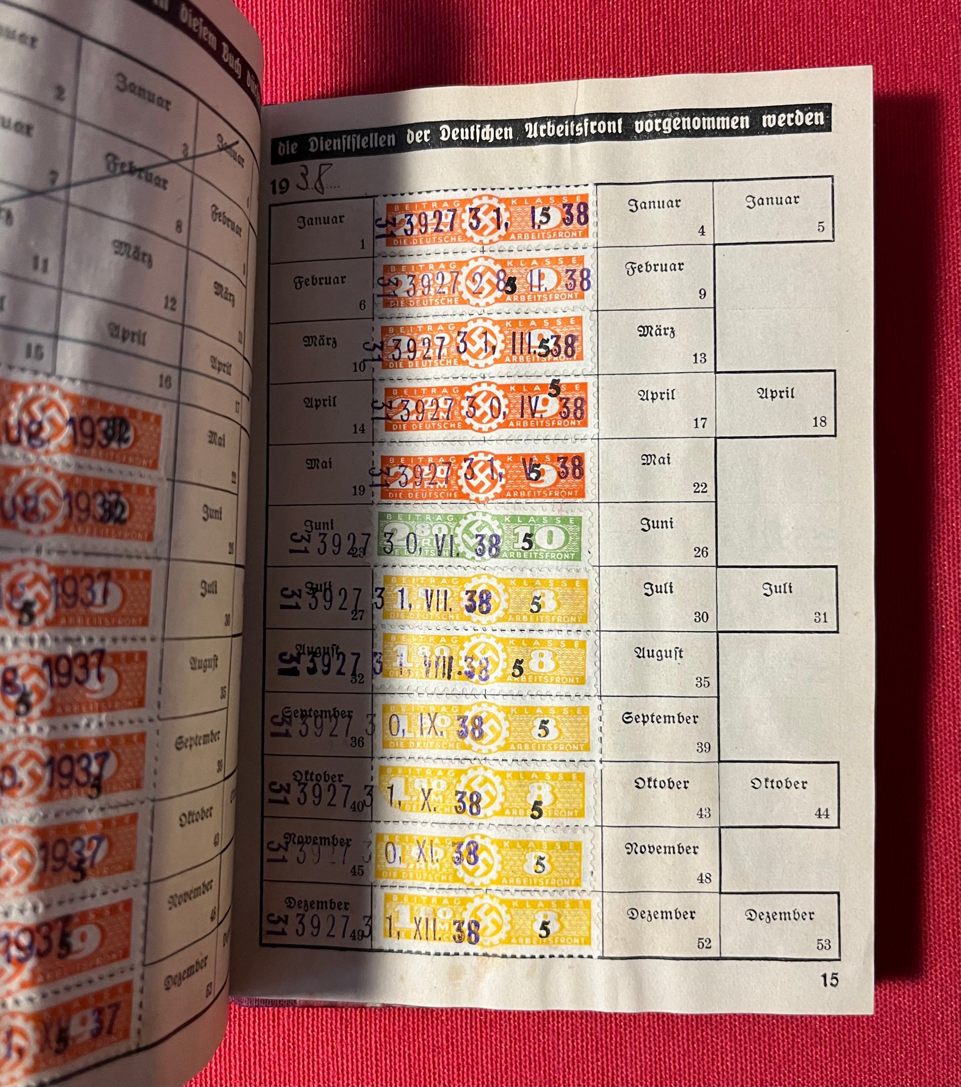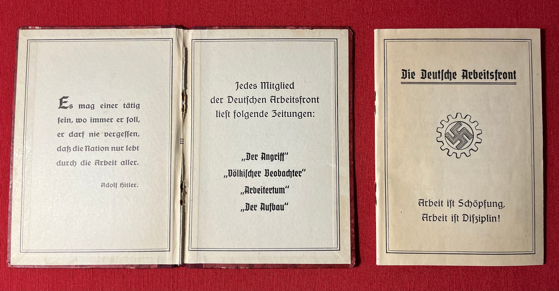 WW2 Era German Labour Front (DAF) Membership Book / WW2 German NSDAP DAF Party Membership Badge - RZM 1935 / WW2 German NSDAP DAF Party Membership Lapel Badge - RZM / NSBO Membership Badge- “Organization prior to DAF”