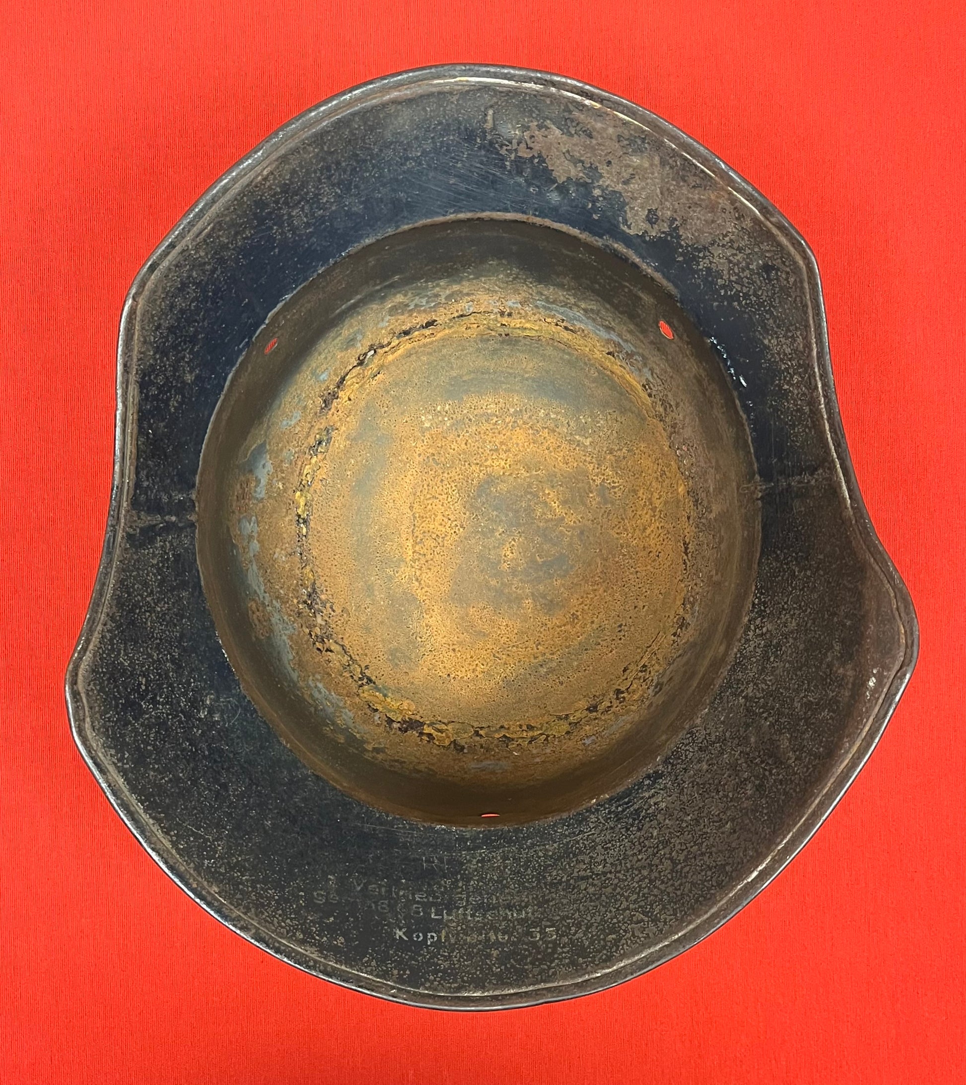 The Luftschutz Helmet first appeared in 1938 and were worn by wardens and teams of the Reichsluftschutzbund (RLB), National Air Raid Protection League. The RLB was an organization in Nazi Germany in charge of air raid precautions in residential areas and among smaller businesses. Some of their tasks included extinguishing fires, rescuing survivors and clearing debris after air raids. In 1938 the Reichsluftschutzbund was transformed into the Luftschutz (LS) and in 1943 it changed from a voluntary service to a compulsory one which included women. The production of the Luftschutz, also known as Gladiator Helmets, ceased when in 1940 substandard factory rejects of the military issue helmet were used. The reclassified M1935/40 helmets were deemed as acceptable for home front personnel.