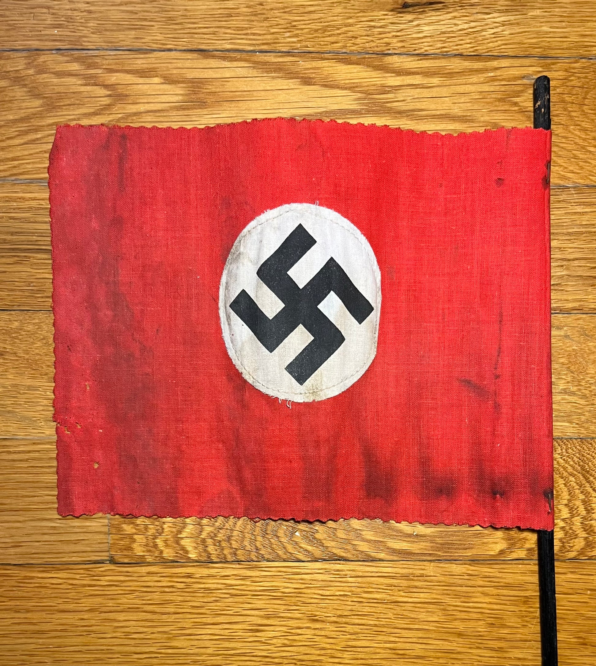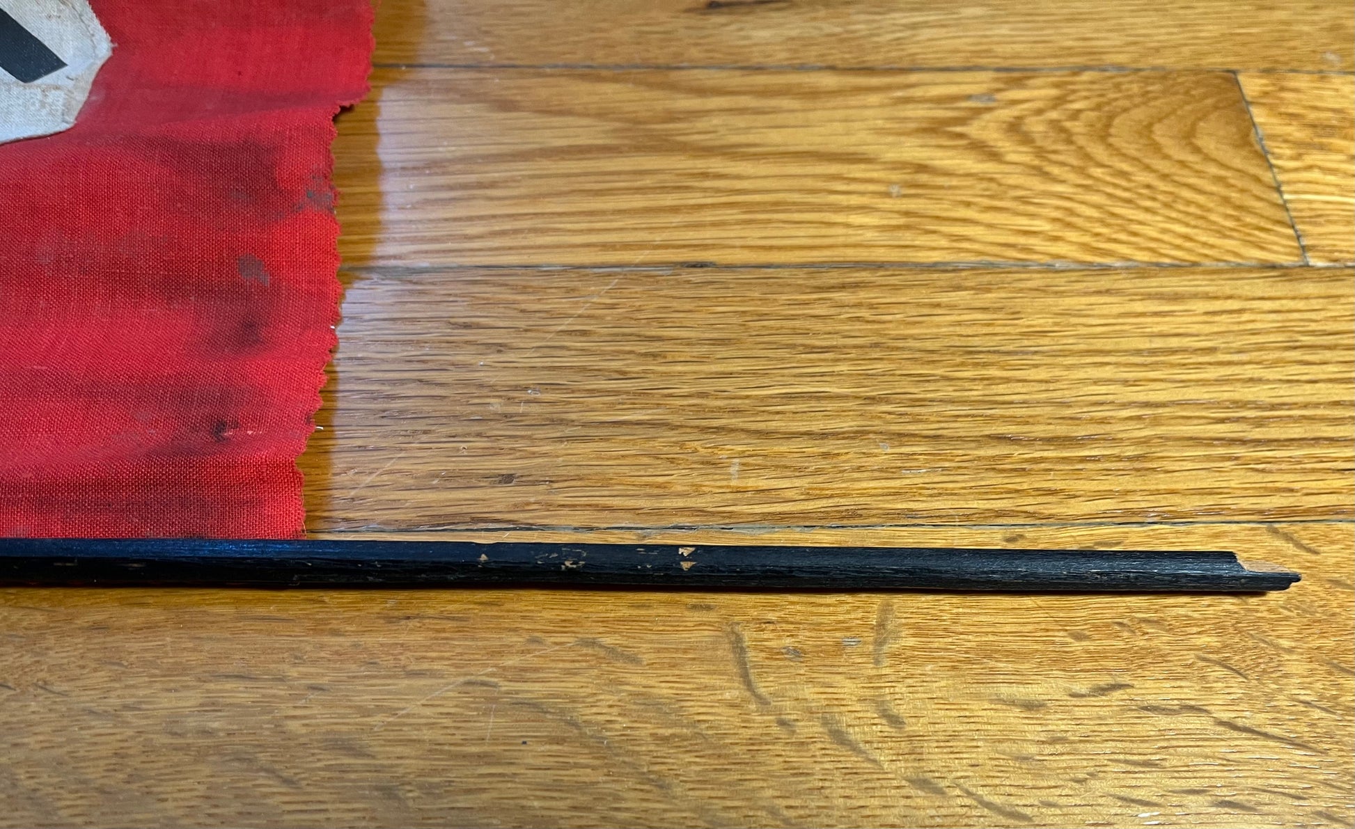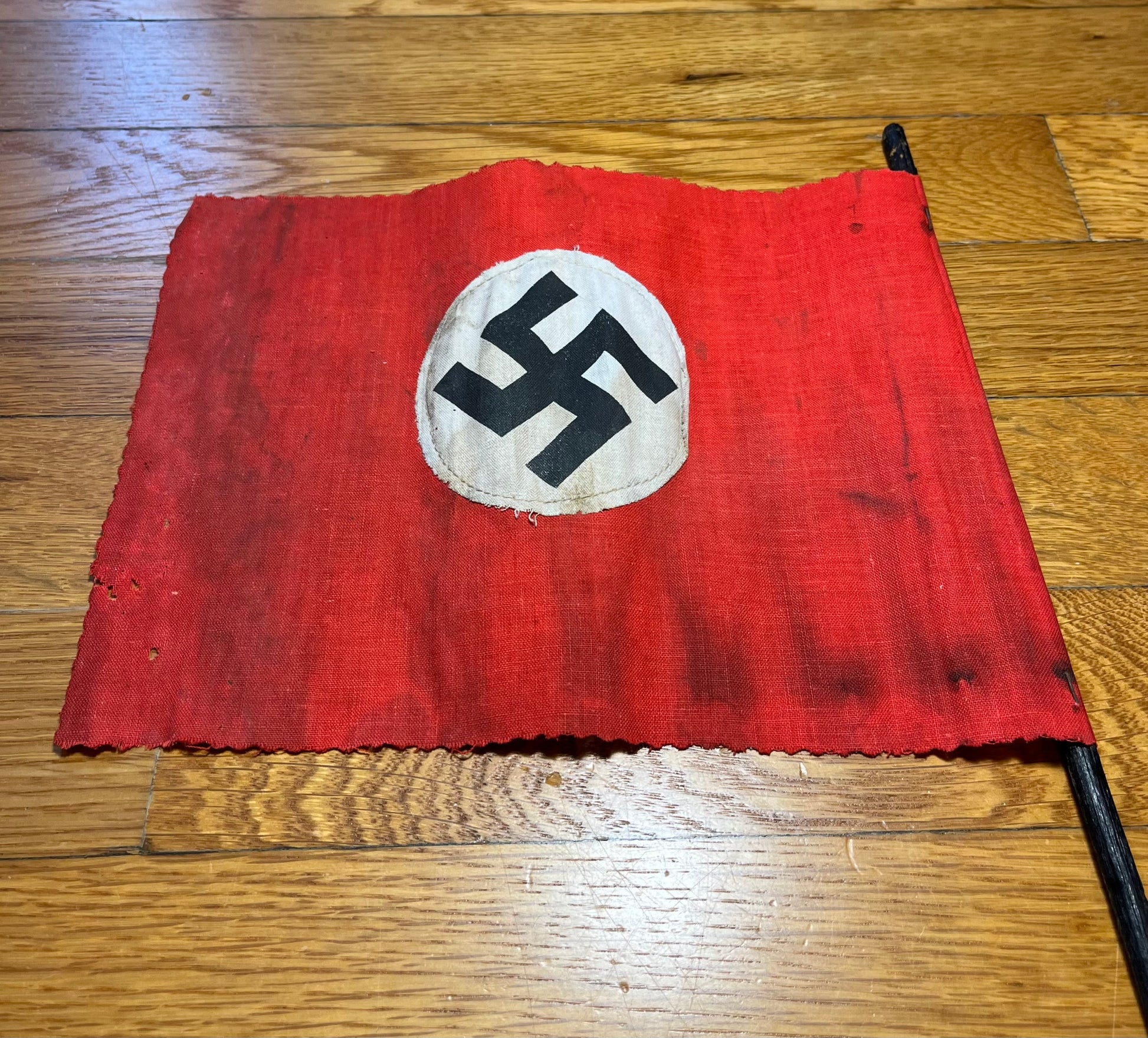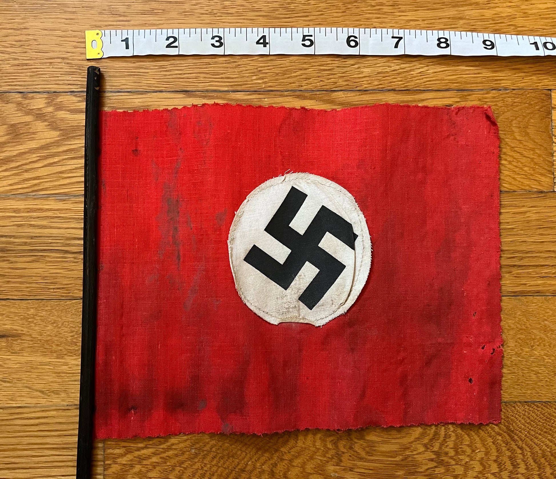 WW2 German / Original / Flag is made of "Cloth" versus paper (which is typically seen) 9 x 7 inches in size / 14-inch wooden stick "broken" most likely from a veteran in attempts to fit it in the duffle bag / Signs of black transfer "as flag was rolled" for storage / Dirt and a couple small holes near the bottom left corner also present / Pictures provided for overall condition