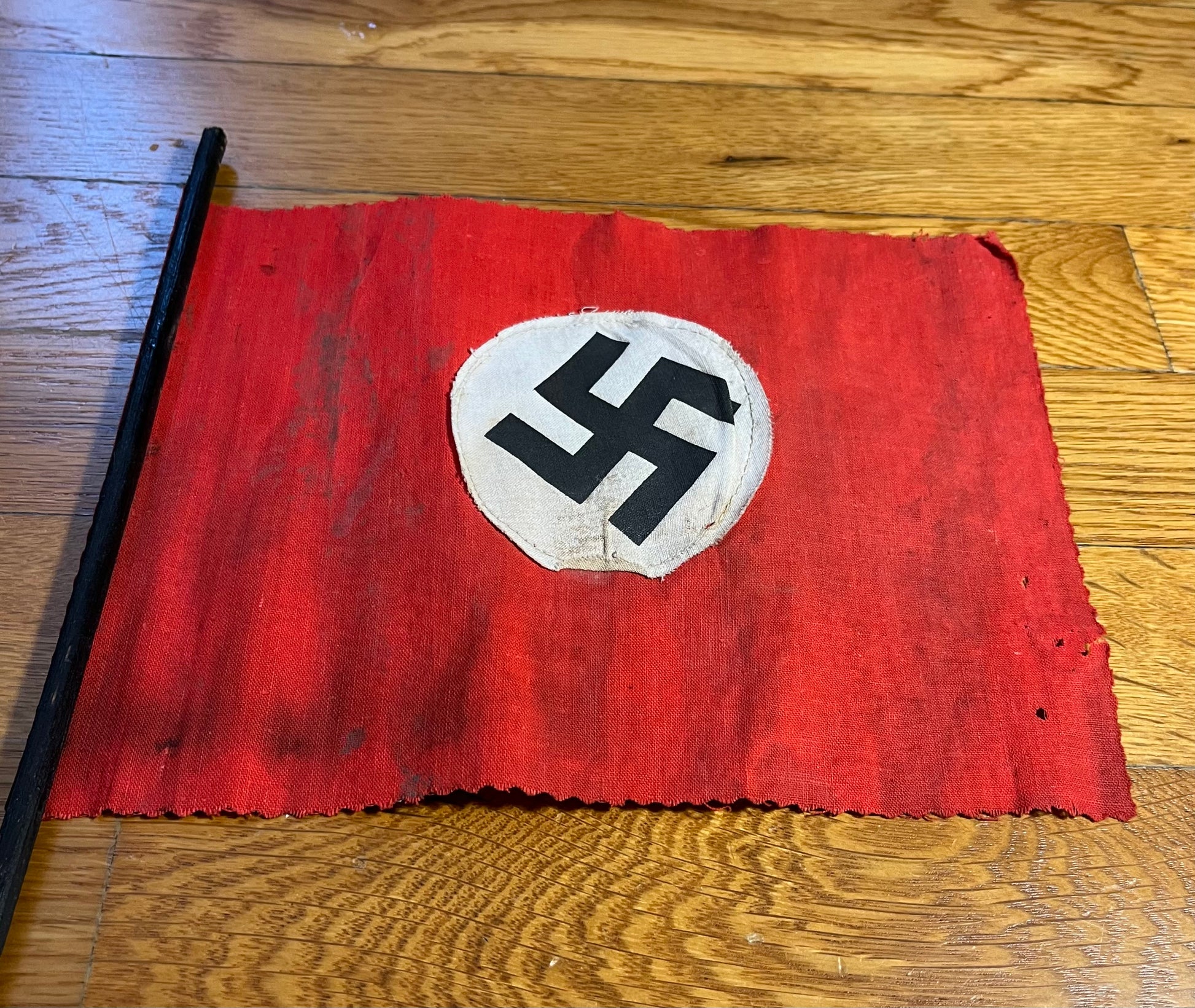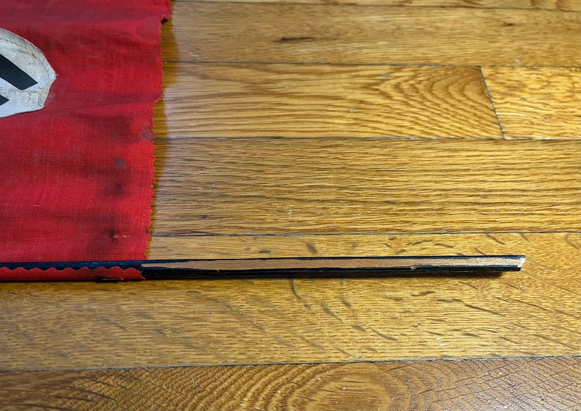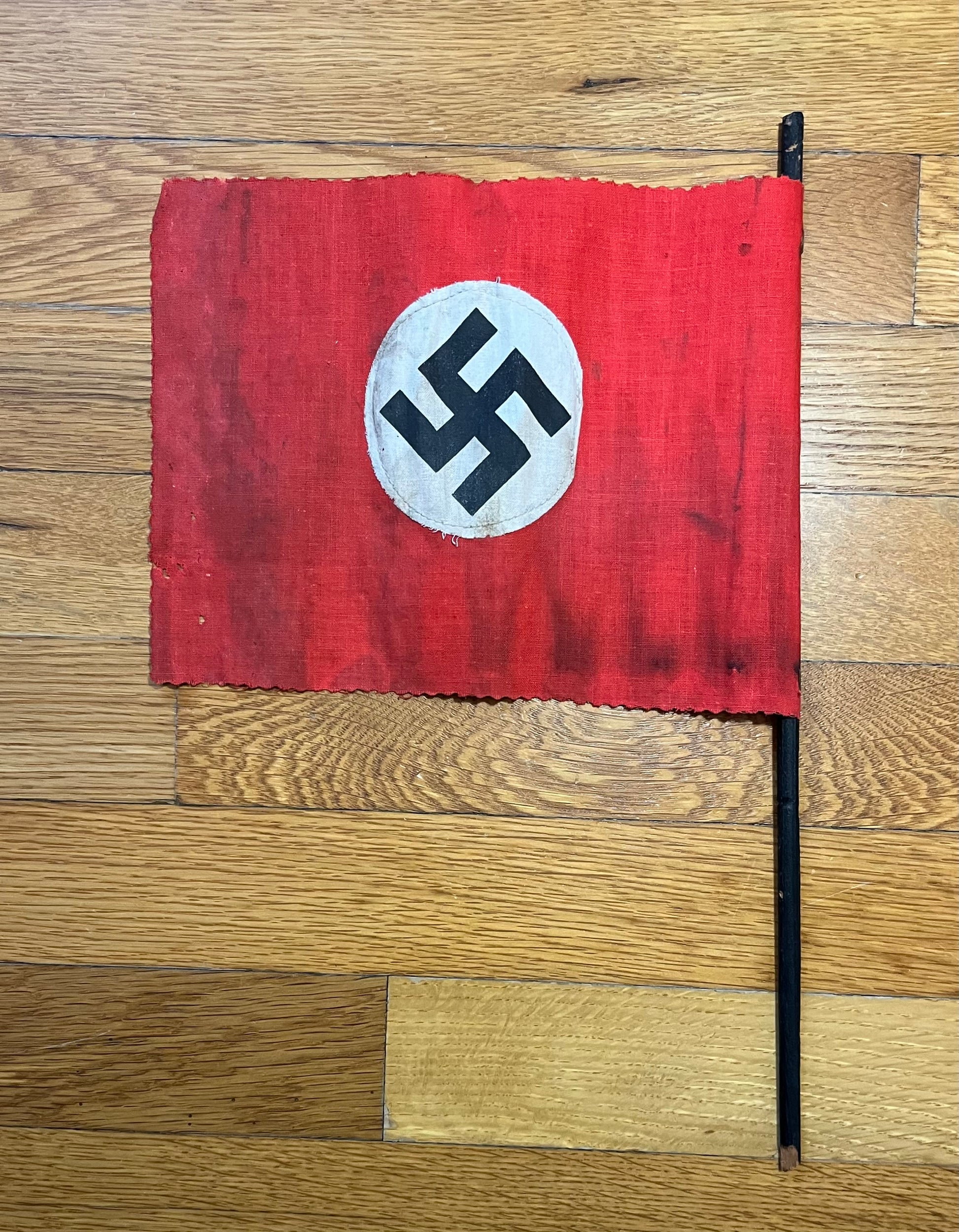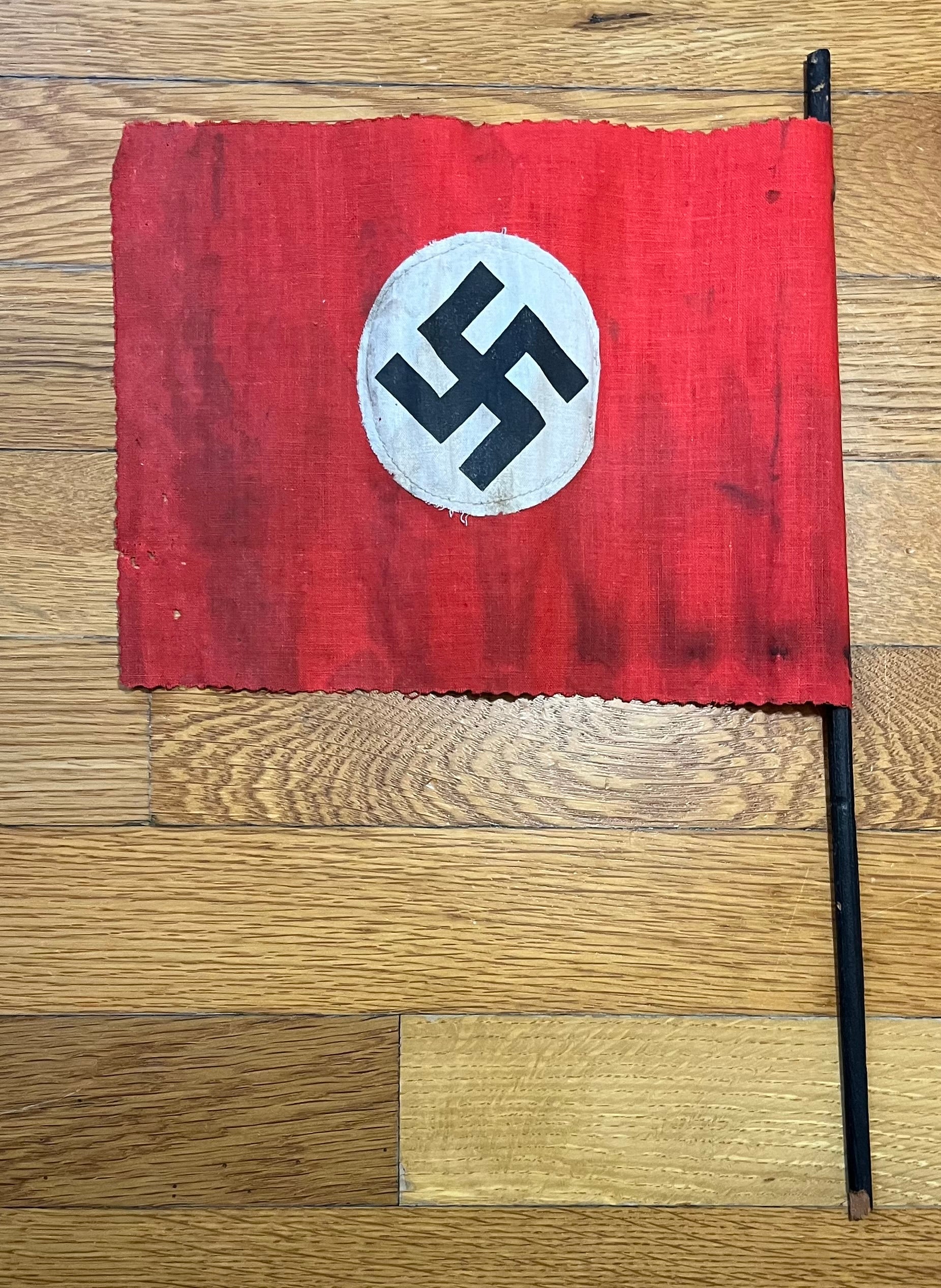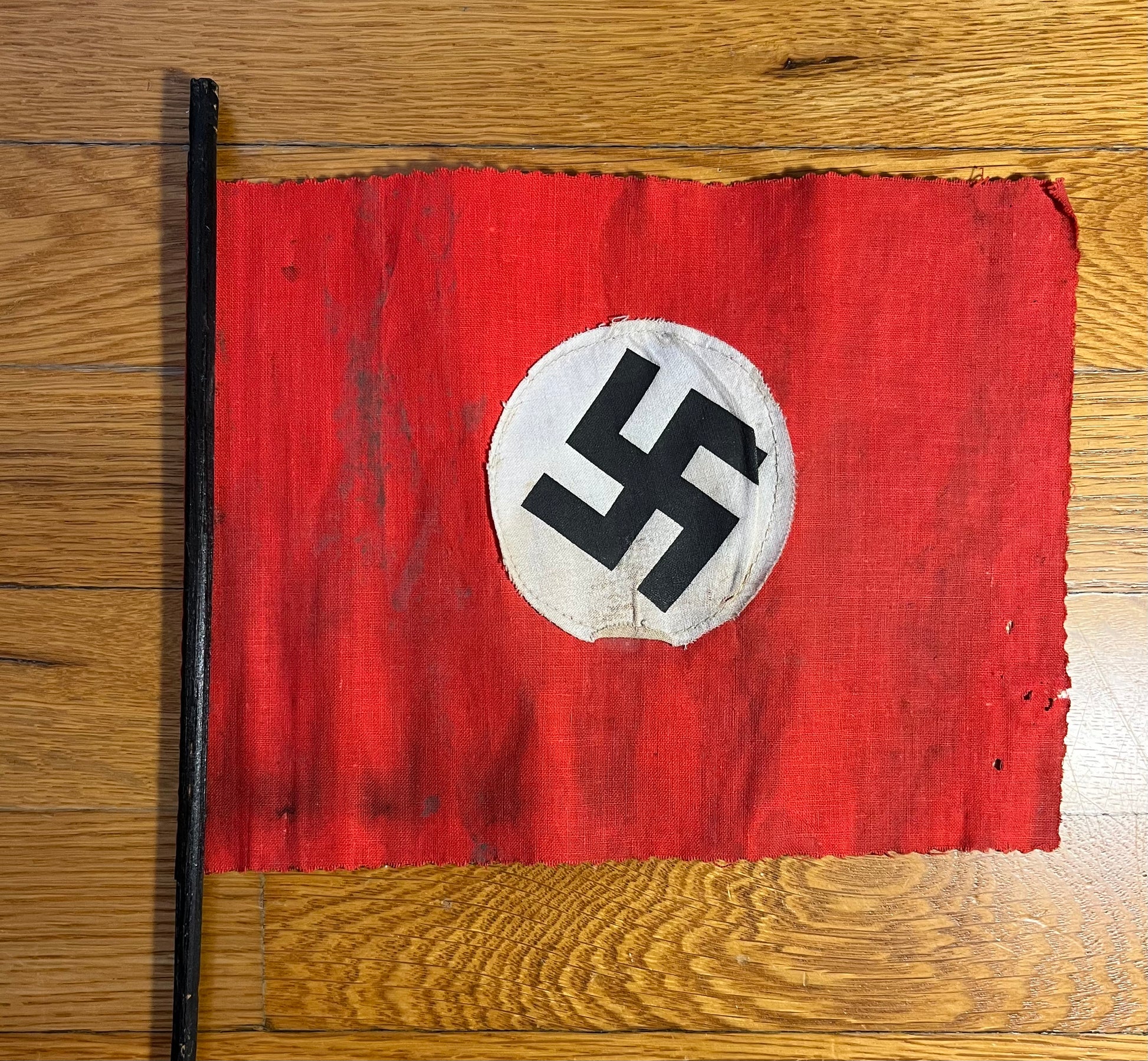 WW2 German / Original / Flag is made of "Cloth" versus paper (which is typically seen) 9 x 7 inches in size / 14-inch wooden stick "broken" most likely from a veteran in attempts to fit it in the duffle bag / Signs of black transfer "as flag was rolled" for storage / Dirt and a couple small holes near the bottom left corner also present / Pictures provided for overall condition