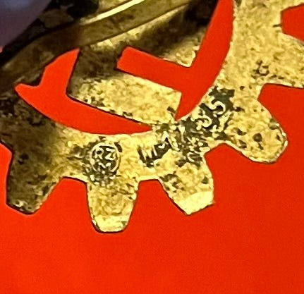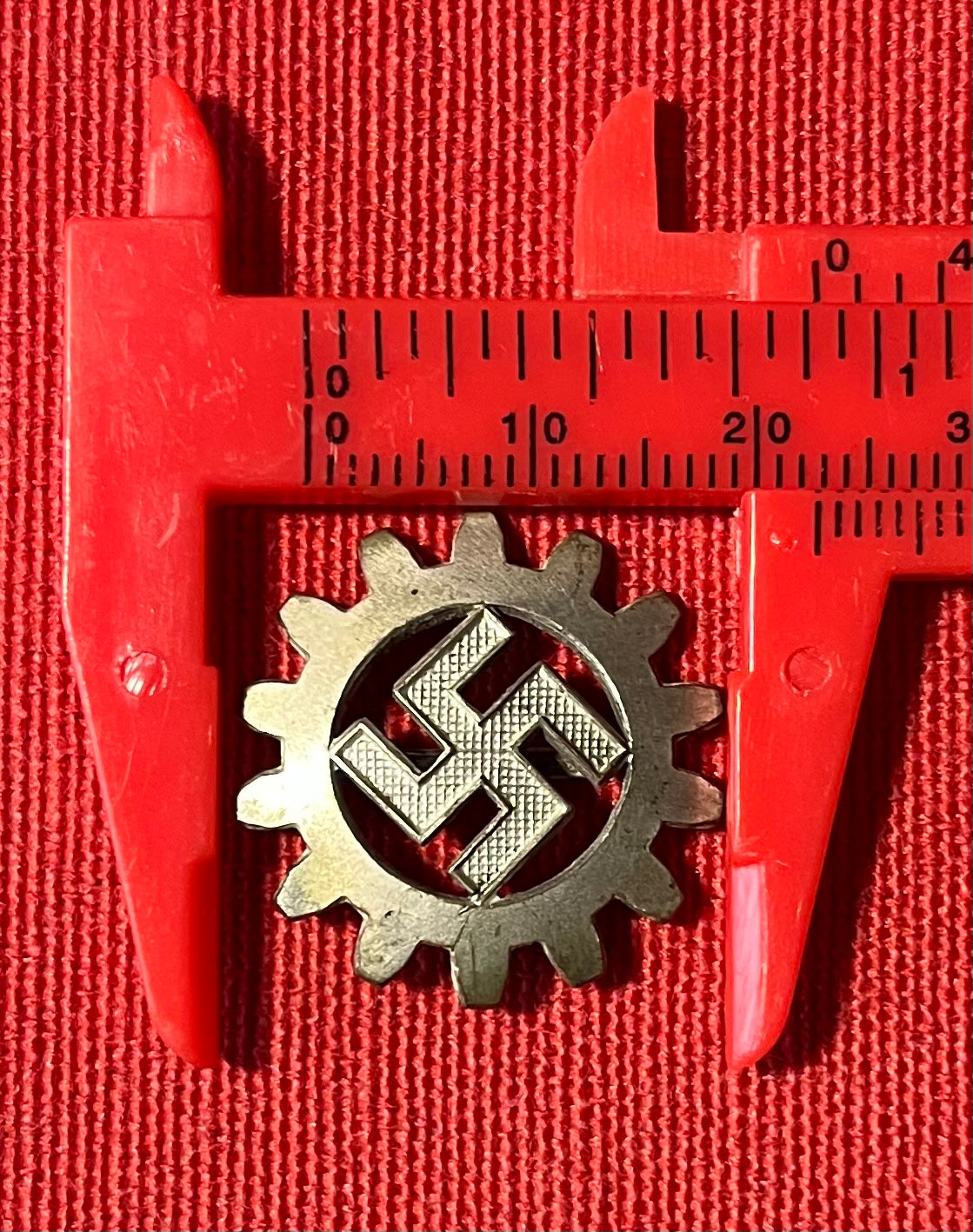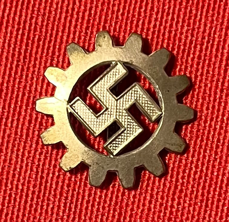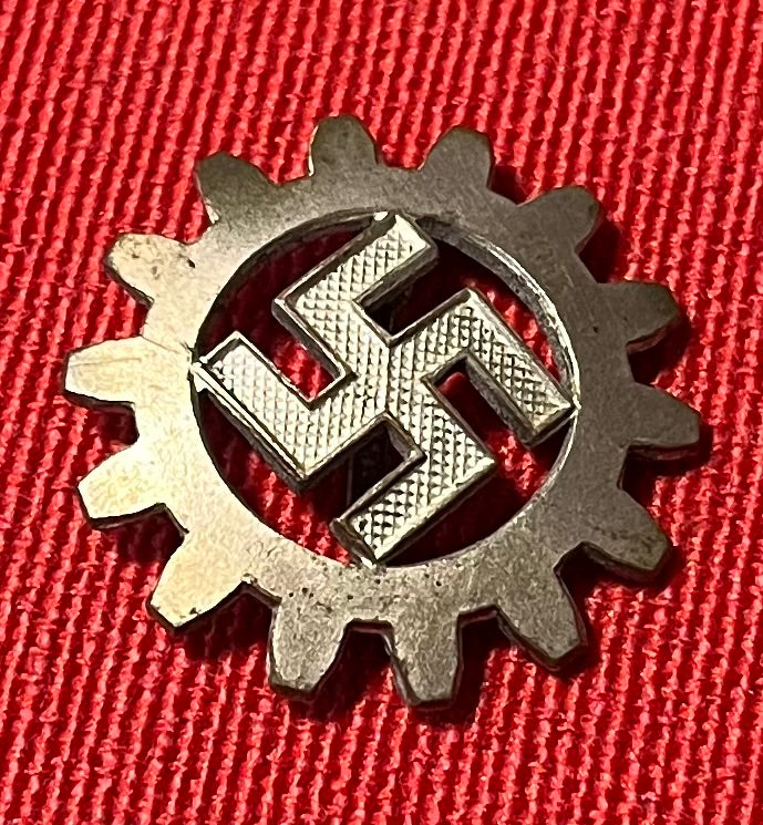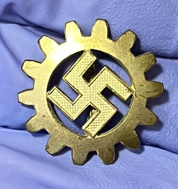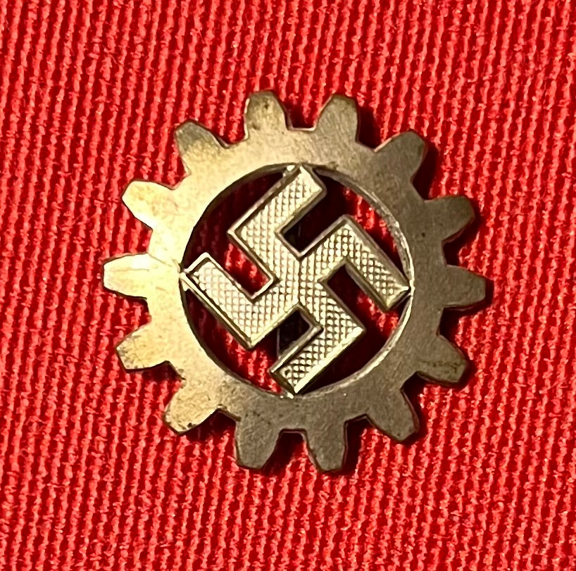 Authentic WW2 Era German / NSDAP (Nazi Party) DAF membership badge / Size 23 mm / Maker marked RZM 35 “1935” missing right tab on back / General wear with age
