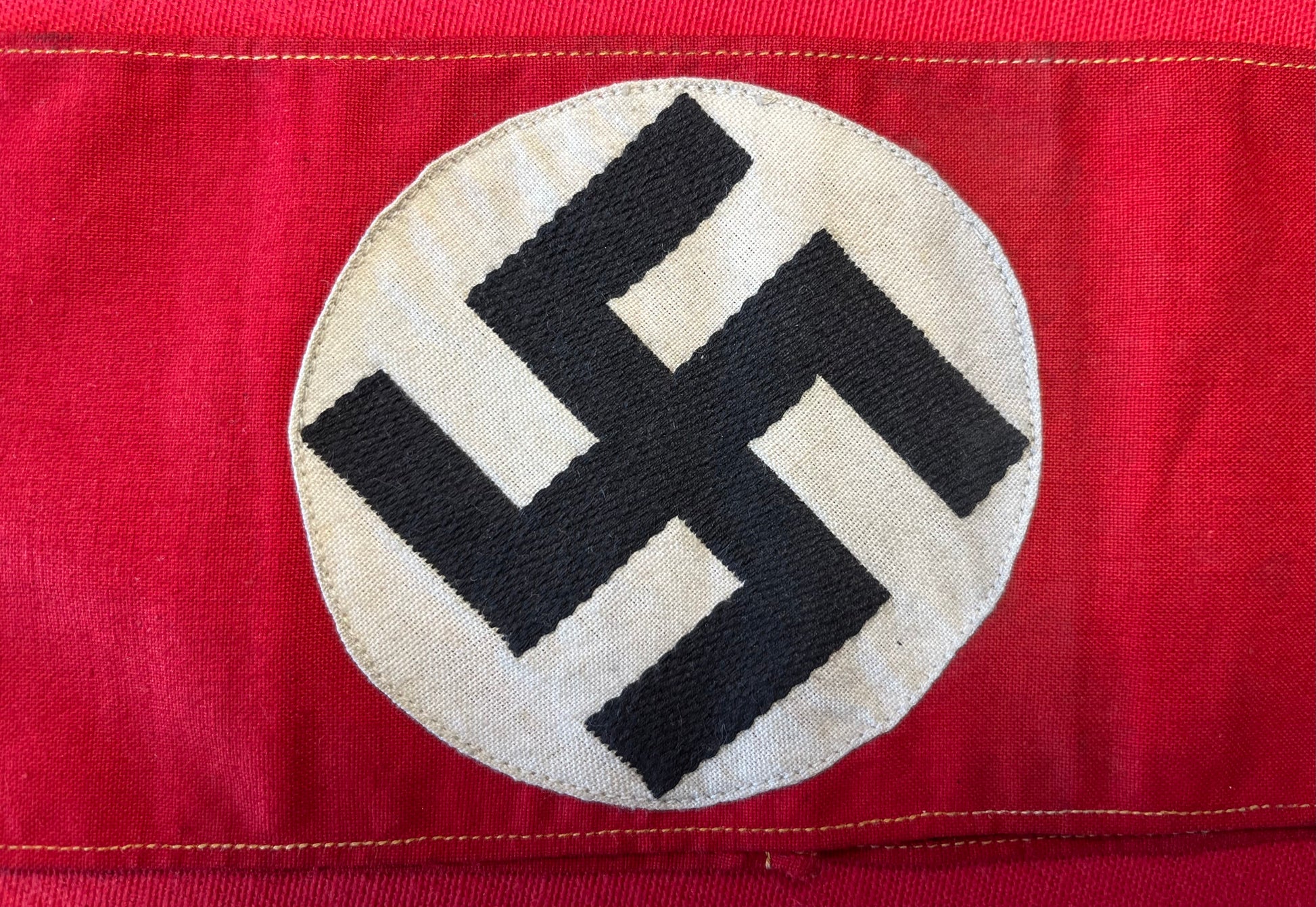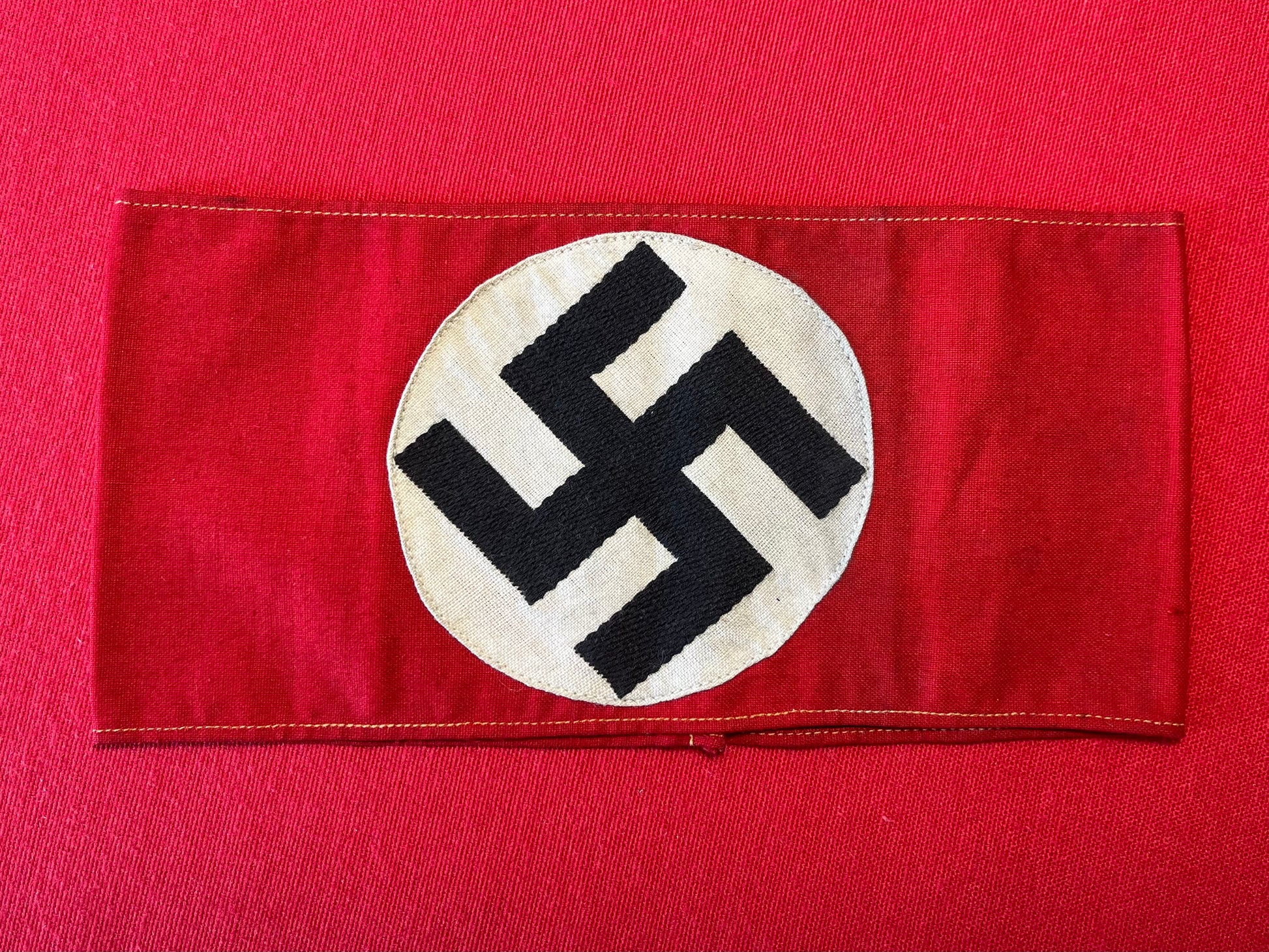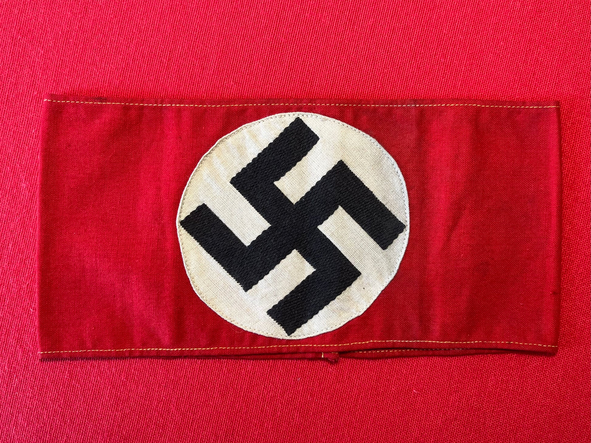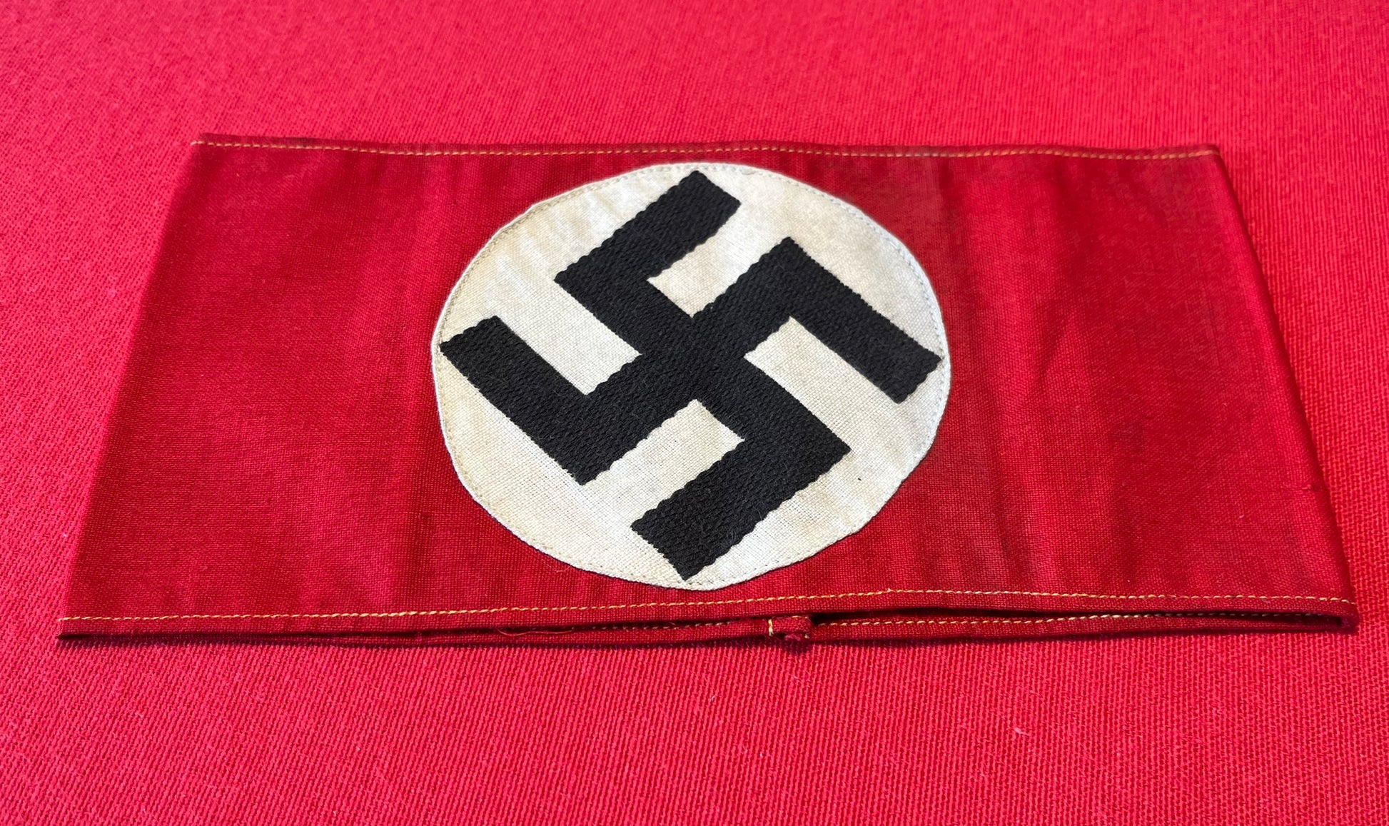 Authentic / Armband is constructed of 2 pieces / Swastika is stitched / Yellow stitching around the border / Inside armband has a paper piece and light adhesive where the makers tag was attached