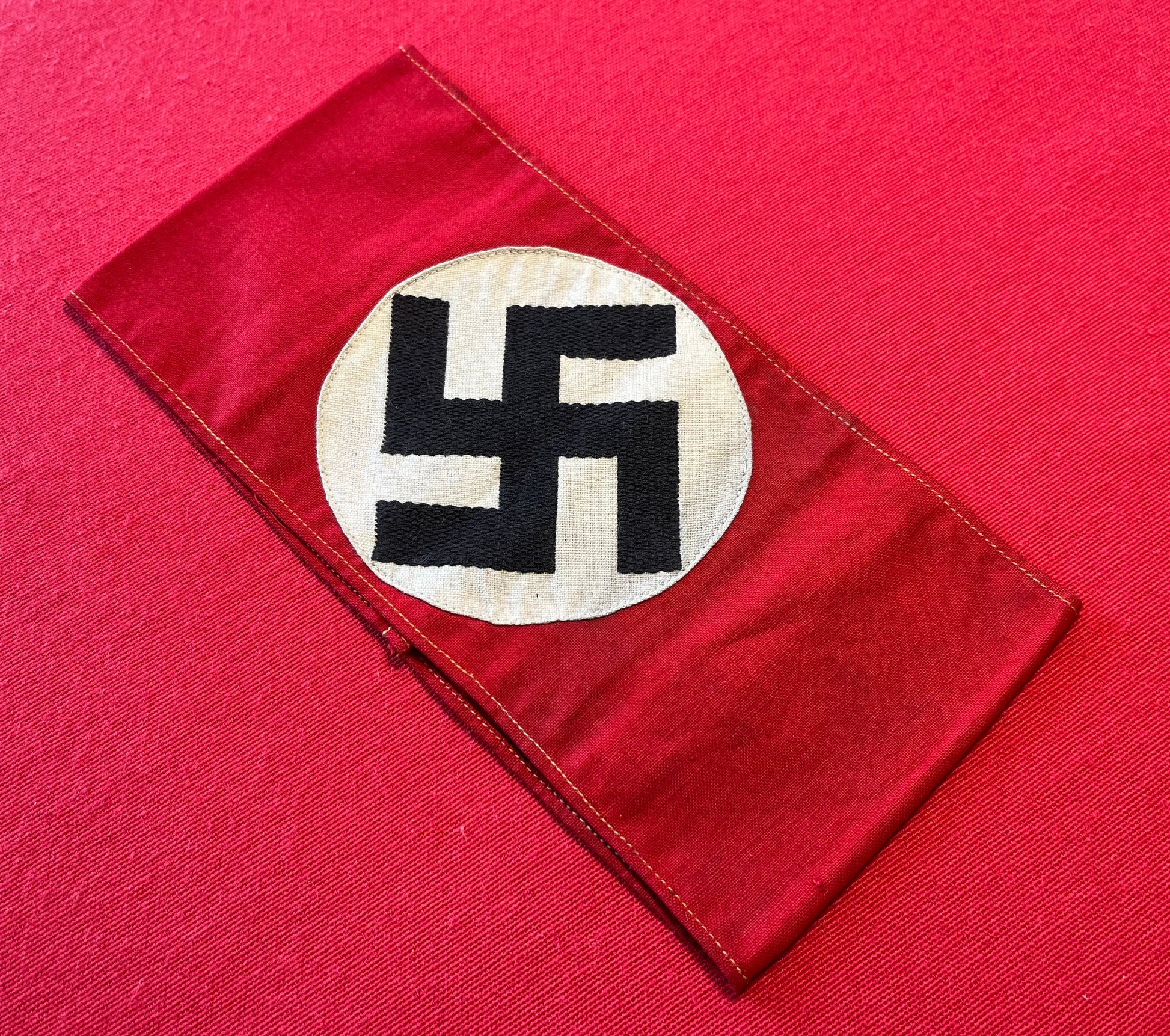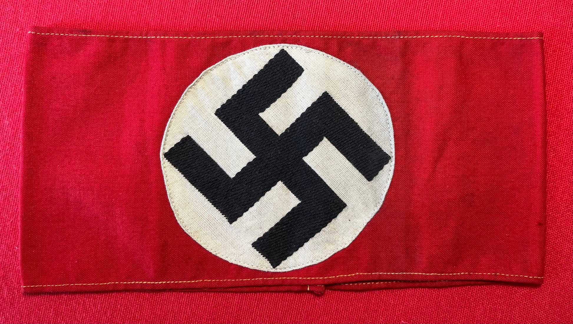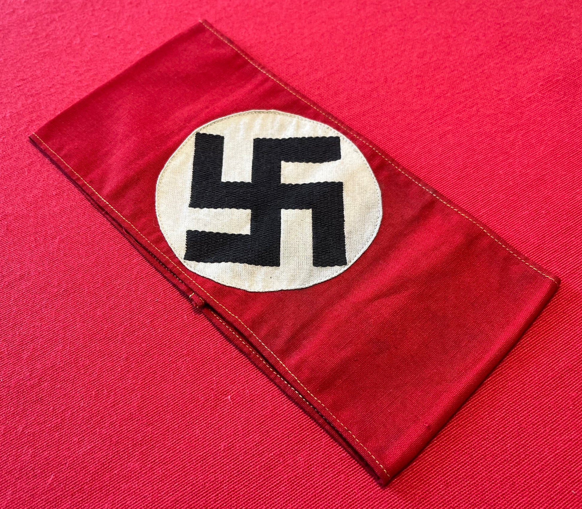 Authentic / Armband is constructed of 2 pieces / Swastika is stitched / Yellow stitching around the border / Inside armband has a paper piece and light adhesive where the makers tag was attached
