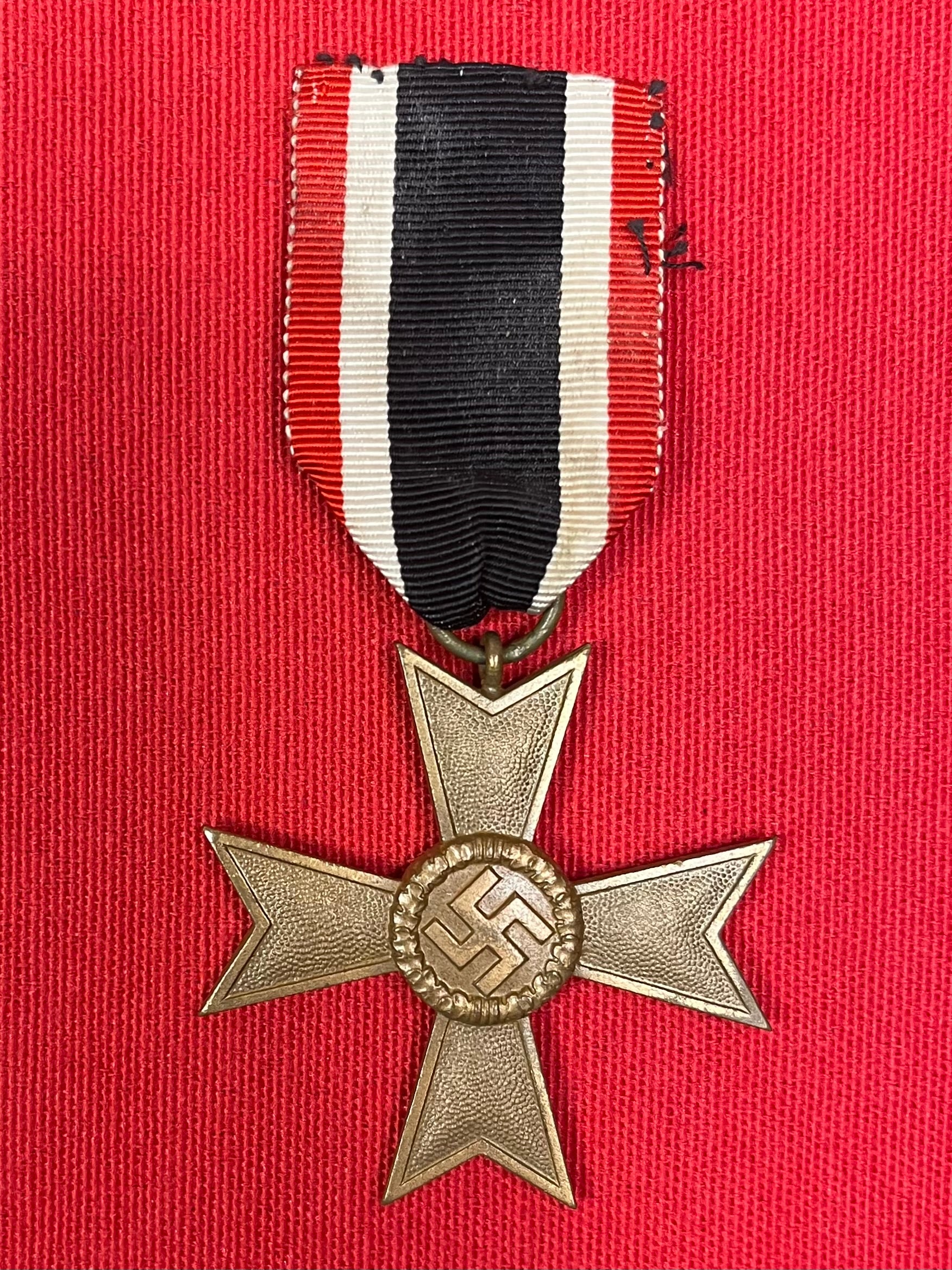 Historical Description: The War Merit Cross (Kriegsverdienstkreuz) was likely the most commonly awarded WWII German decoration. In 1939, when Hitler reinstituted the Iron Cross, he did not reinstitute the non-combatant version that had existed in previous wars. As a successor to this, he created the War Merit Cross. It existed in the same grades as the Iron Cross- there was the War Merit Cross 1st Class, War Merit Cross 2nd Class, and Knights Cross of the War Merit Cross. The 2nd Class award was a medal suspended from a ribbon, coated with a bronze finish. The War Merit Cross 1st Class was a pin-on award, with a silver finish. The Knights Cross version was worn on a ribbon around the bearer’s neck. The crosses were further differentiated into two categories: with swords, and without swords. The award with swords was for meritorious service in the face of the enemy, and could be awarded to soldiers to recognize achievements that did not merit award of an Iron Cross, as well as to civilians who fought fires during Allied air raids. The award without swords was for furthering the war effort, and could also be awarded to soldiers or civilians. Millions of people were eligible for these crosses, from members of the armed services to personnel of the Reichsbahn, the Luftschutz, border guards and customs agents and members of the other various political and paramilitary Third Reich organizations, and even factory workers. Some soldiers used a sort of military humor to mock the War Merit Cross as a “far-from-combat badge” or “field kitchen assault badge.” But many recipients of these crosses wore them with pride.