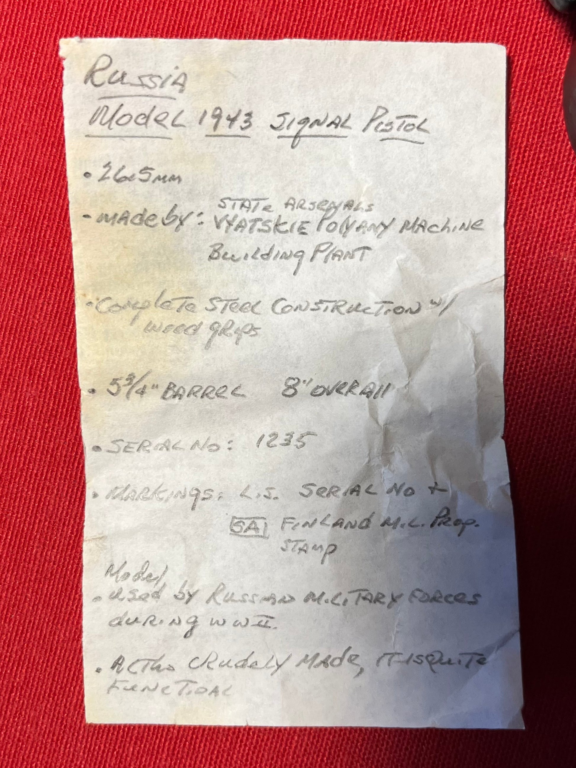 (One) of the three Russian signal pistols that are the backbone of author Robert M. Gaynor Jr’s publication - Signal Pistols of Georgii S. Shpagin / Gaynor was a retired U.S. Army Signal Officer and long-time flare gun and signal pistol collector / Included in this purchase is one of his personally owned Russian signal pistols that is publicized in his book - The model (M1943) very scarce / Additionally you will receive his hand written research slip and an extremely hard to find copy of his book which offers countless information on not just Russian pistols but specimens from other countries detailing their rich history and their identifying makers and markings