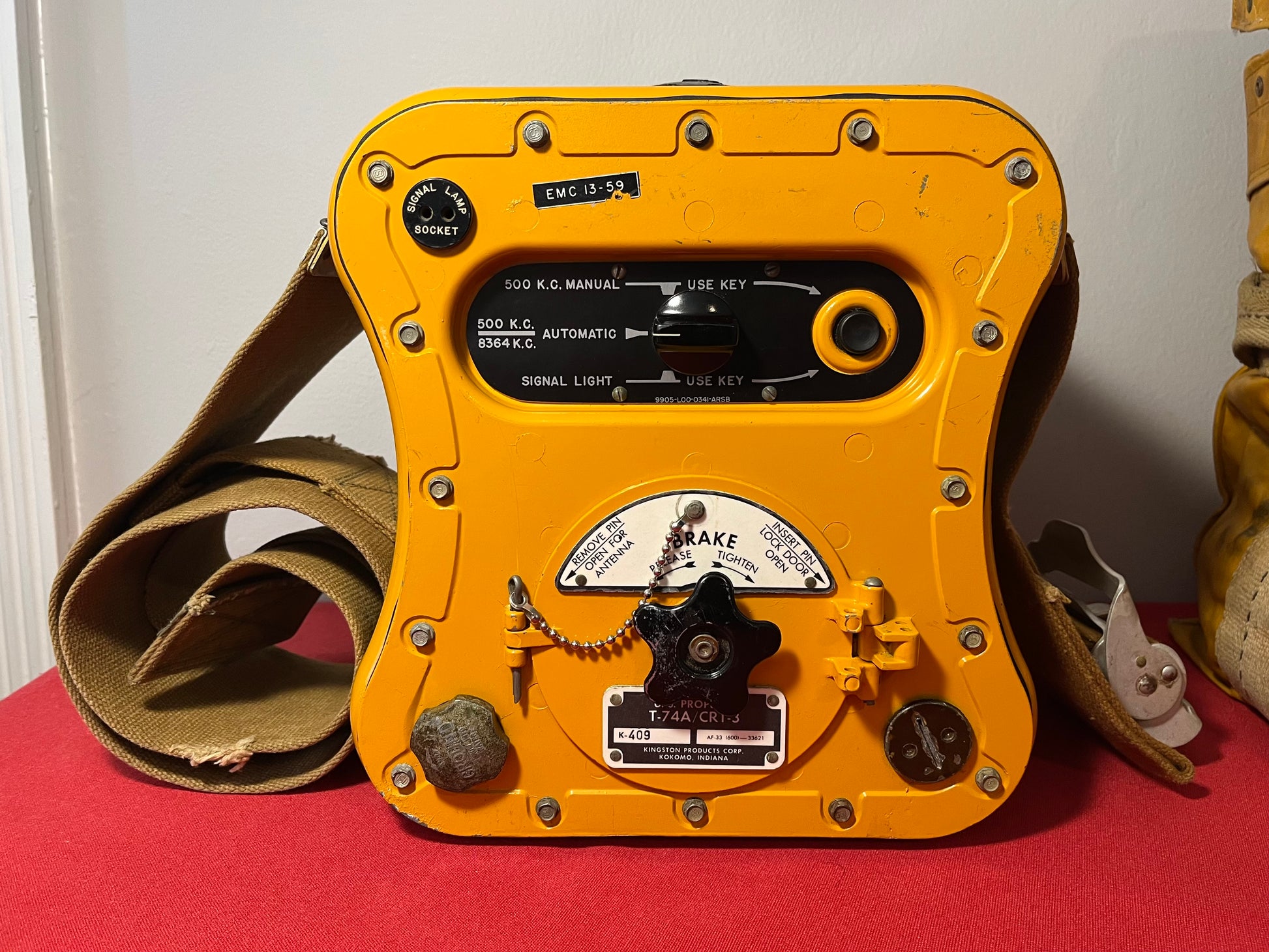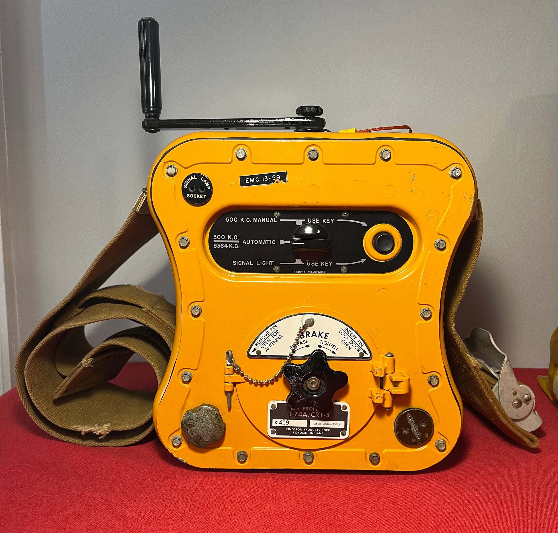 The Gibson Girl radio set is a hand powered emergency transmitter ruggedly designed for use in a life raft. Use of the Gibson Girl enabled rescue crews to locate survivors of the aircraft using the SOS signal it transmitted. The SCR-578 and its accessories are bright yellow-orange in color and can float when landing in water. The Gibson Girl is operated by holding it between the knees while cranking the internal generator by hand. It can be set to automatically transmit an SOS signal, or manual keying can be used to send a message.