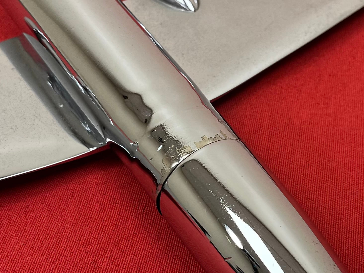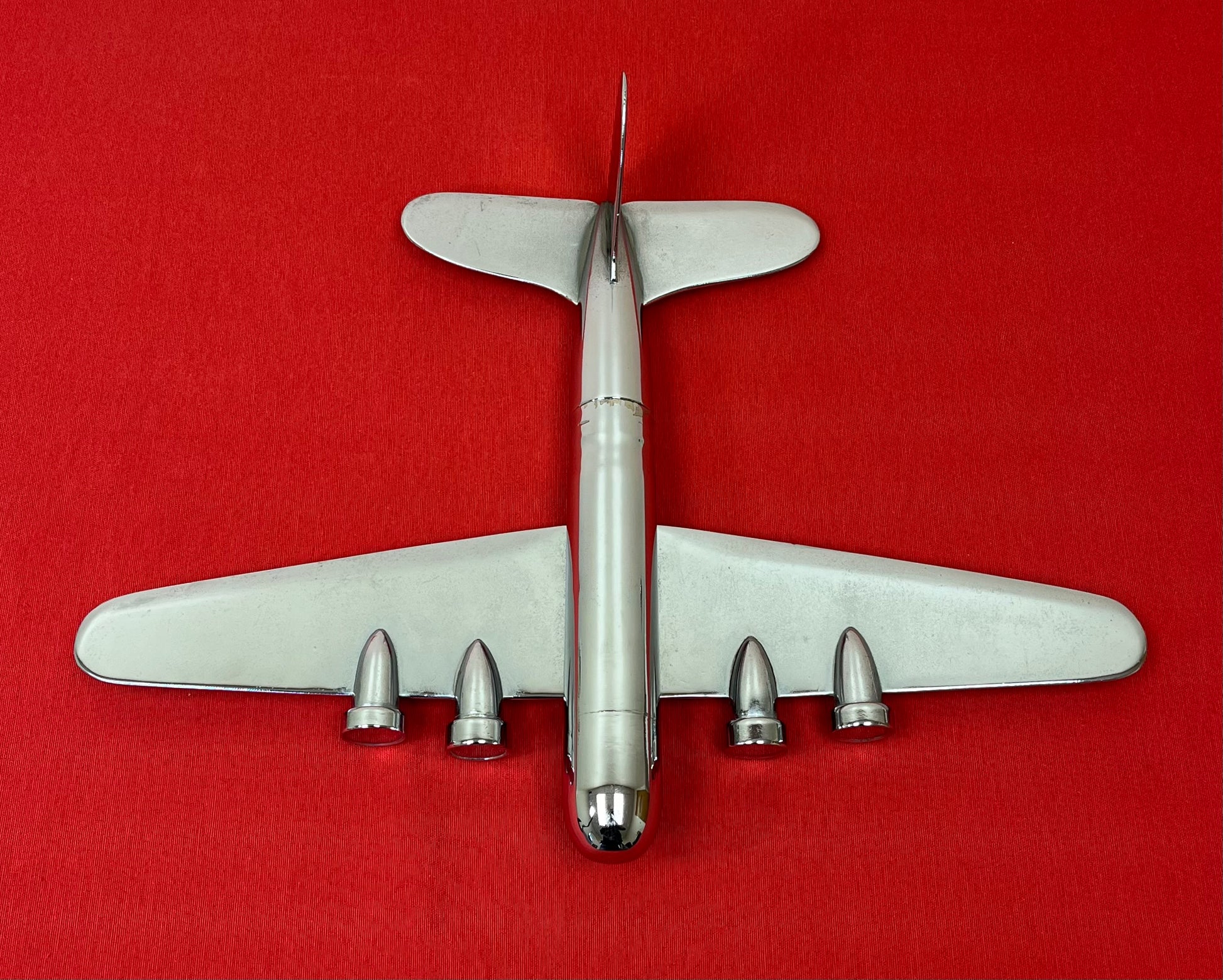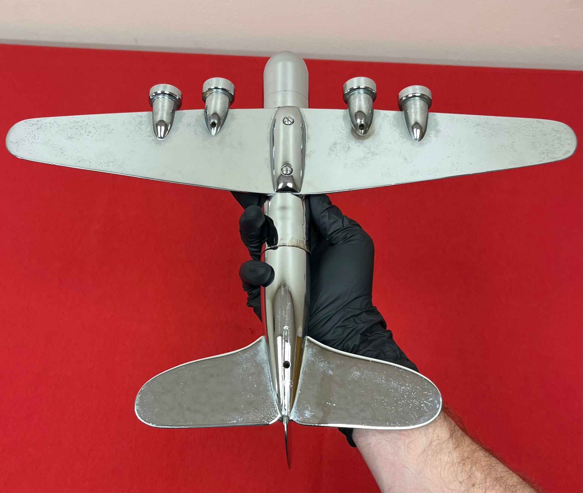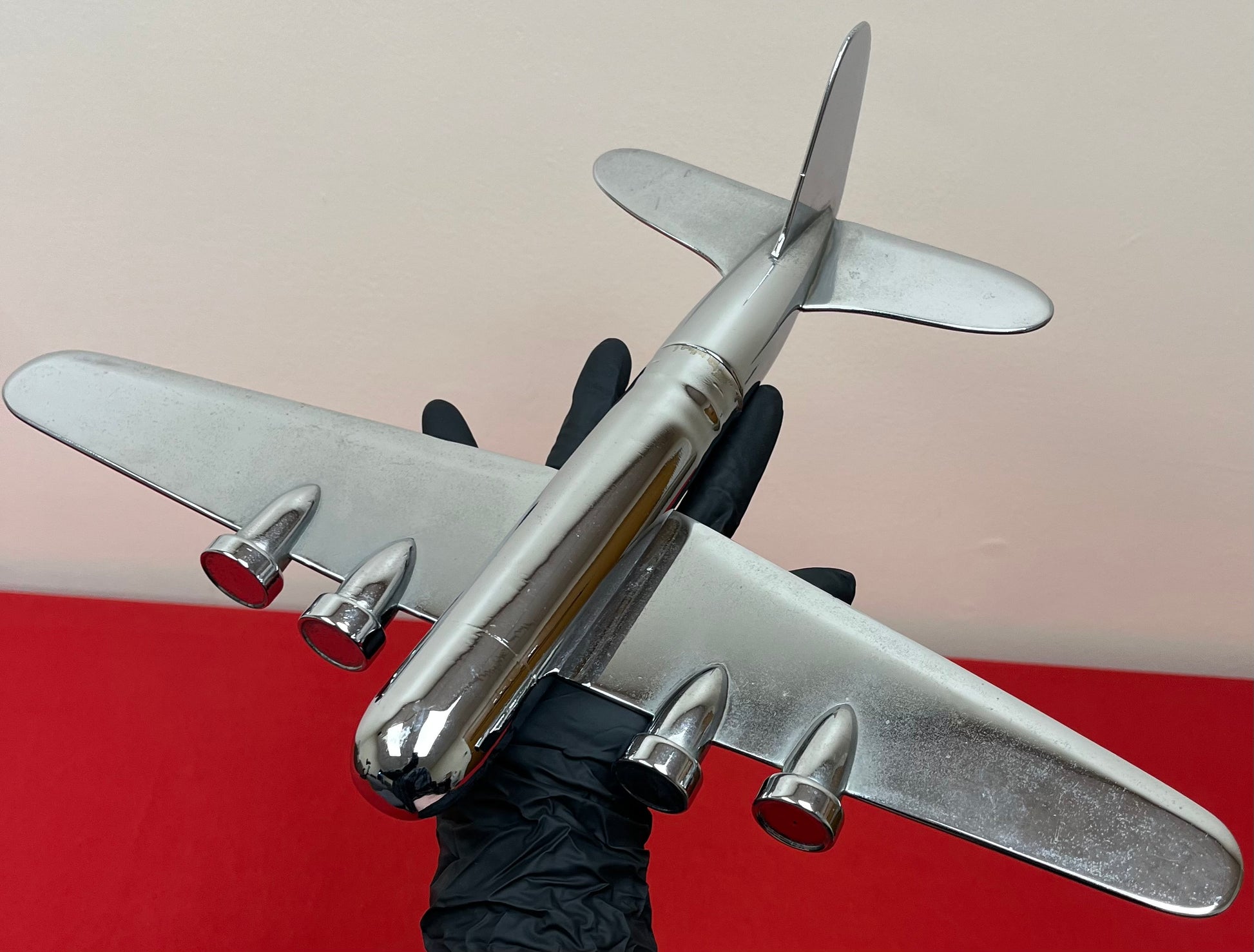 World War II Original / Trench art airplane / Largest one we’ve seen / Wingspan is 18 inches / Made from artillery shells & projectiles then nickel plated / Projectile can separates from casing to see inside components if needed (missing some plating at the joint)