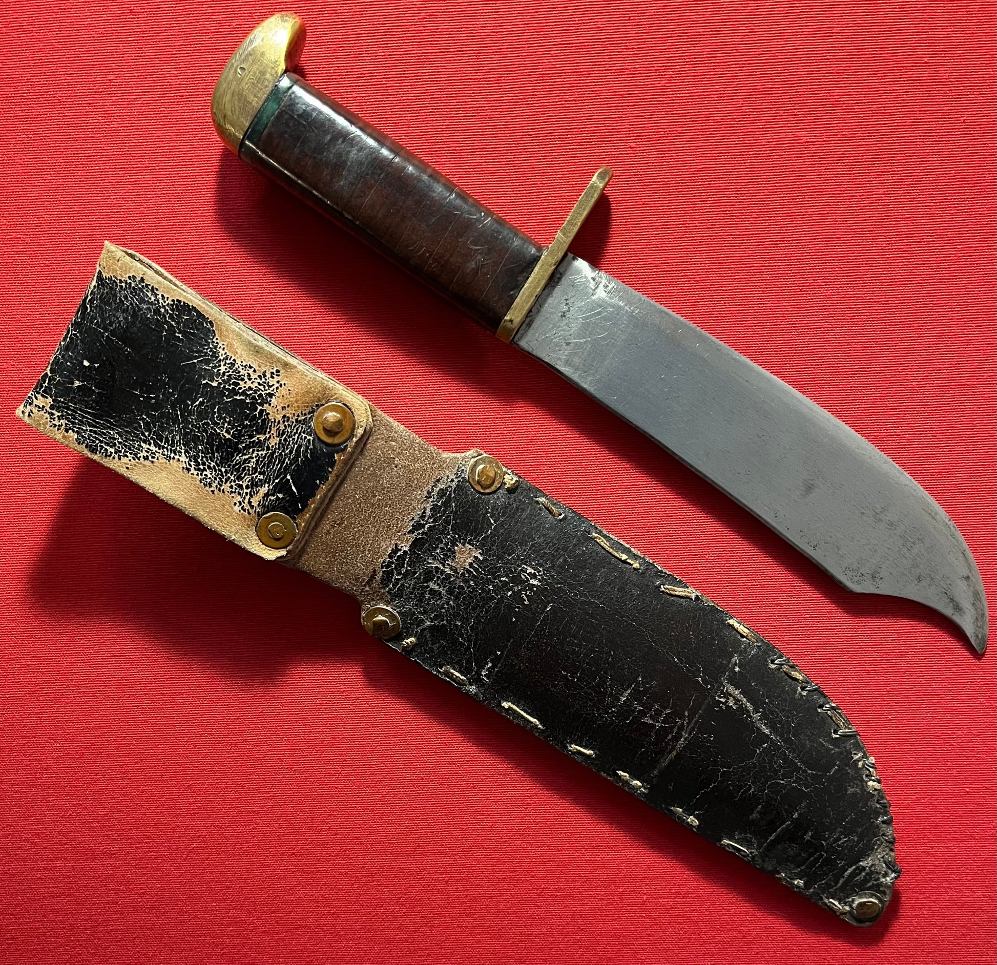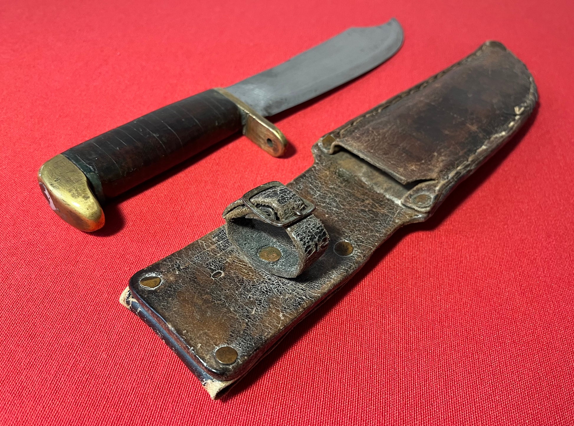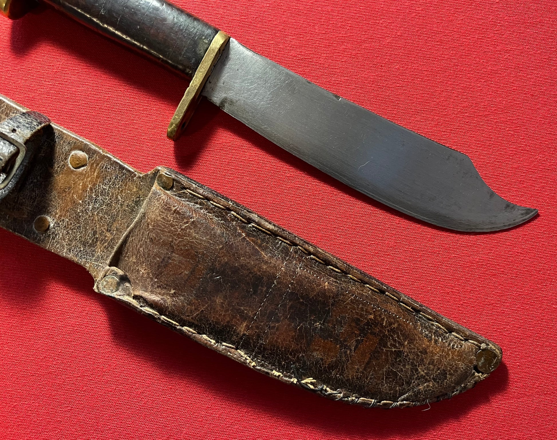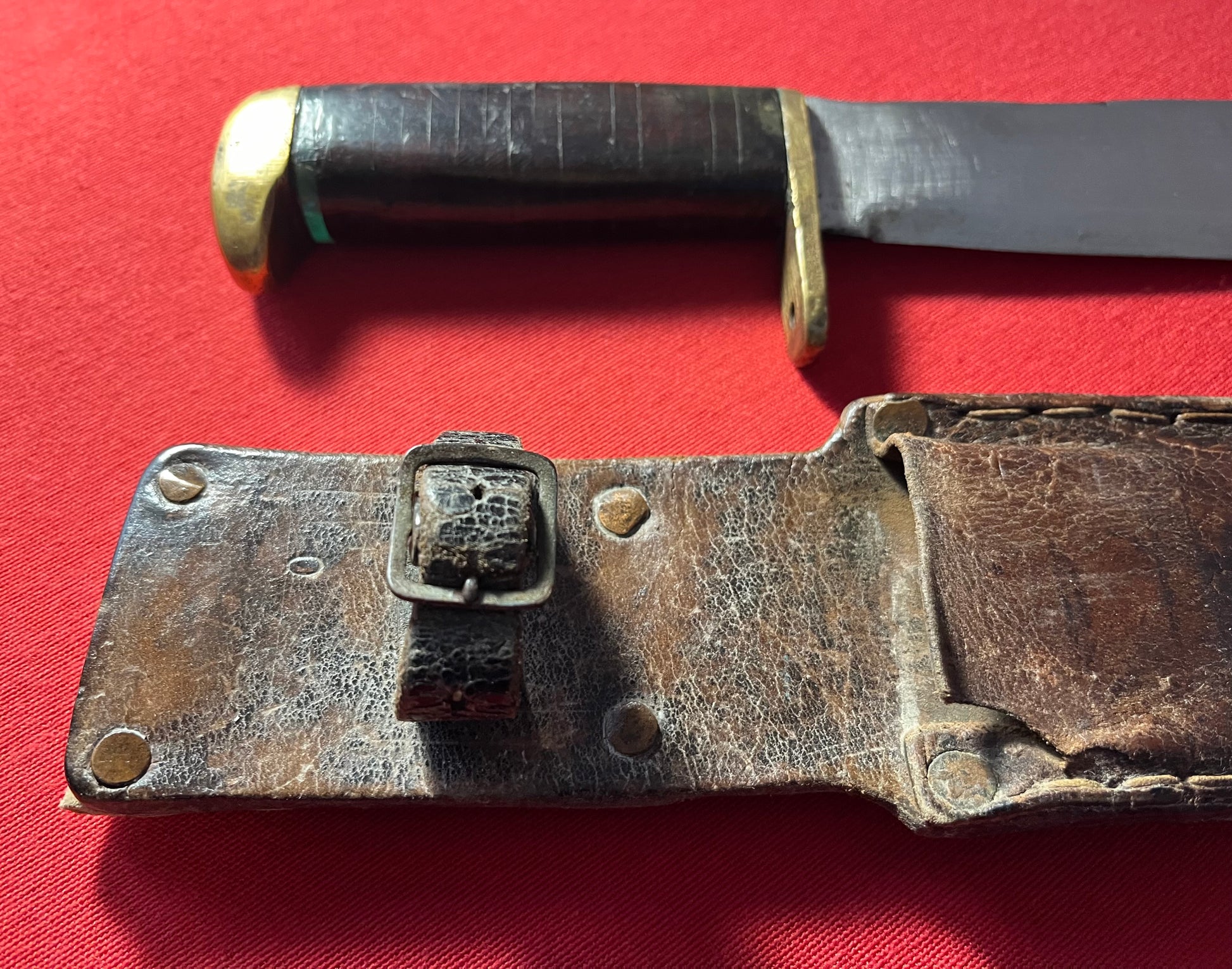 Authentic WW2 / U.S. / Theater made piece / Modification made to scabbard with soldiers last name engraved "Newman" Overall knife size is 11 3/8 inches with a 7 inch bowie style blade / Brass cross guard and hilt / Some wear to the leather scabbard from drawing the knife in and out / Leather strap and buckle are operational