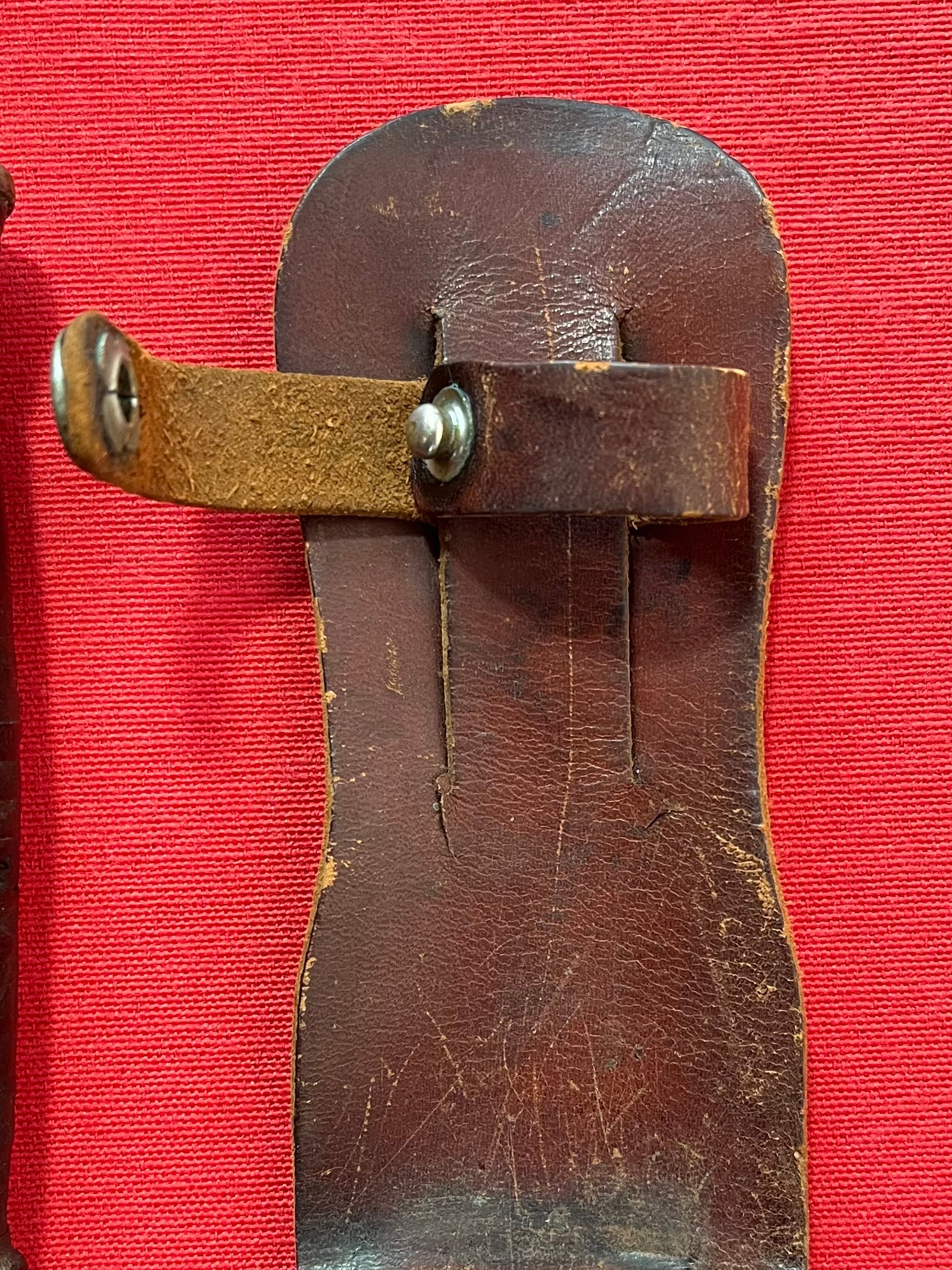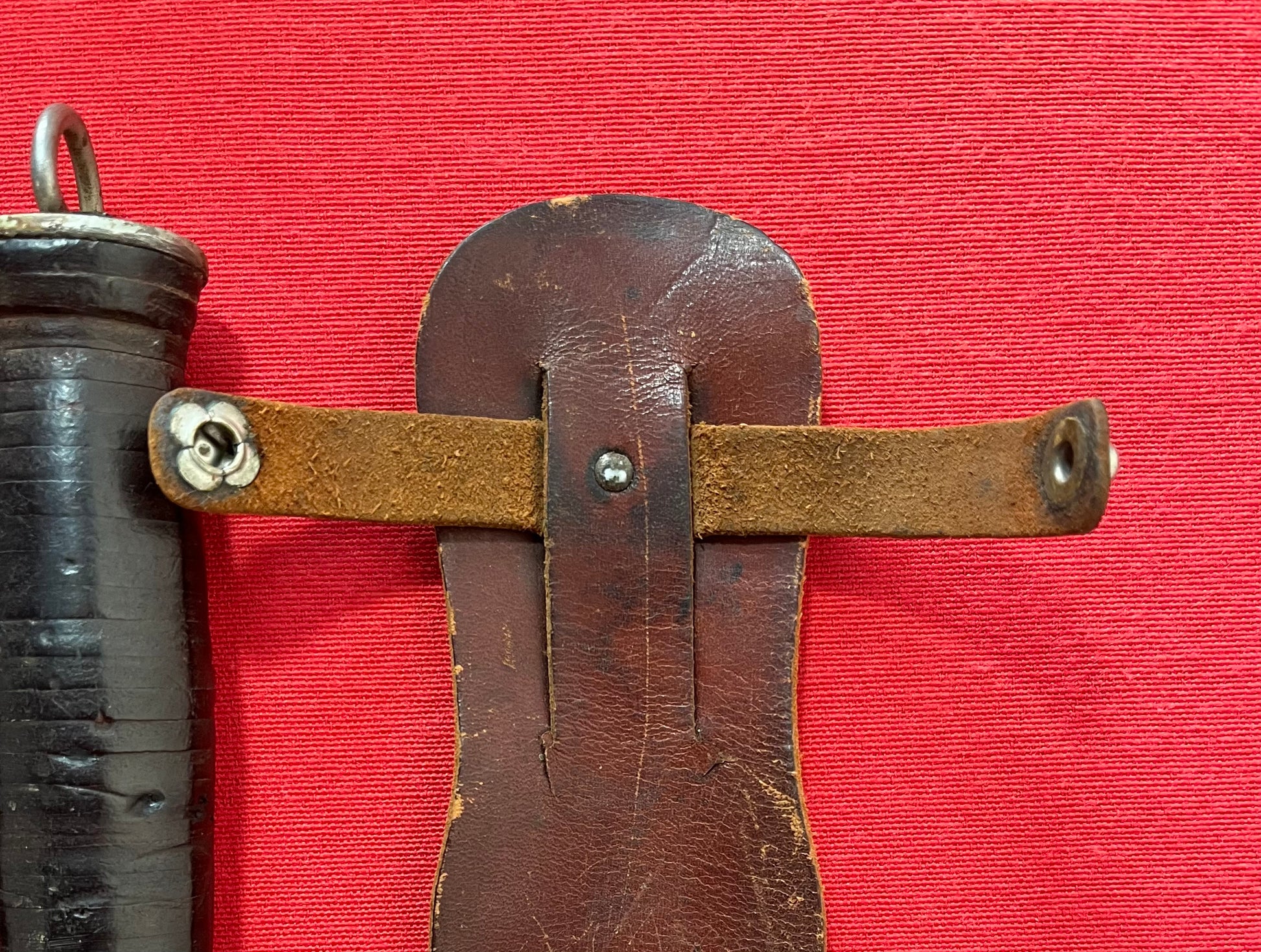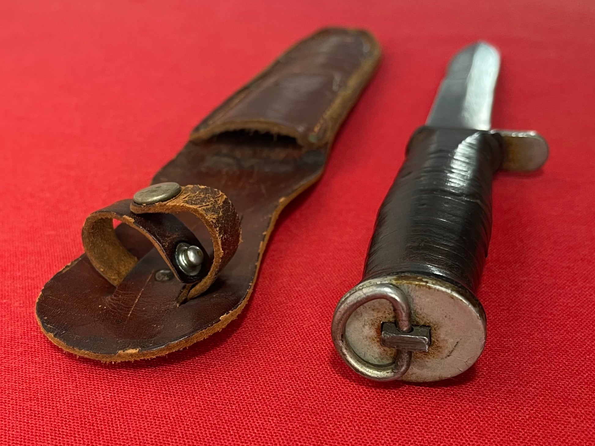 Authentic WW2 Era “Commercial” private purchase M3 style fighting knife / Leather handle with metal ring / Overall length is 11 1/4 inches with a 6 2/4 inch blade / Original leather scabbard / No maker mark