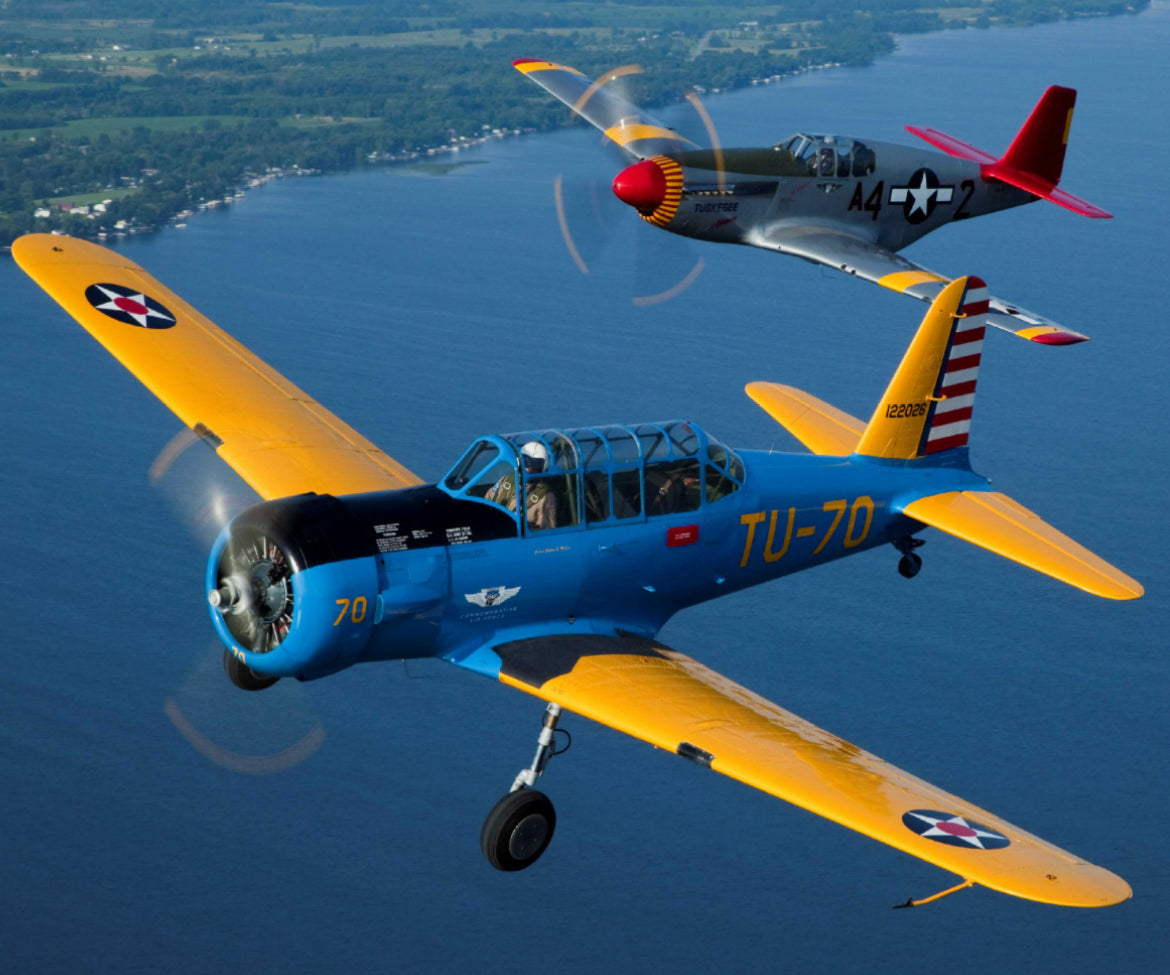 The BT-13 was one of several simplified versions of the more complex Vultee BT-54 Basic Trainer. It was a fixed-gear, low-wing tail-dragger with a crew of two sitting in tandem. When production ended in 1944, approximately 11,537 Valiants had been built. The BT-13 was the most widely used trainer aircraft in WWII. It was flown by most American pilots in transitioning from Primary trainers like the PT-19 to more advanced trainers like the AT-6. It was more complex than the Primary trainer and required the use of two-way radio, landing flaps and a two-position, controllable-pitch prop. The BT-13 was nick-named the “Vultee Vibrator” by its pilots for its most remarkable characteristic- a tendency to shake violently as it approached stall speed. After WWII most Valiants were scrapped but a few were sold to private owners. Today less than 50 are still airworthy.