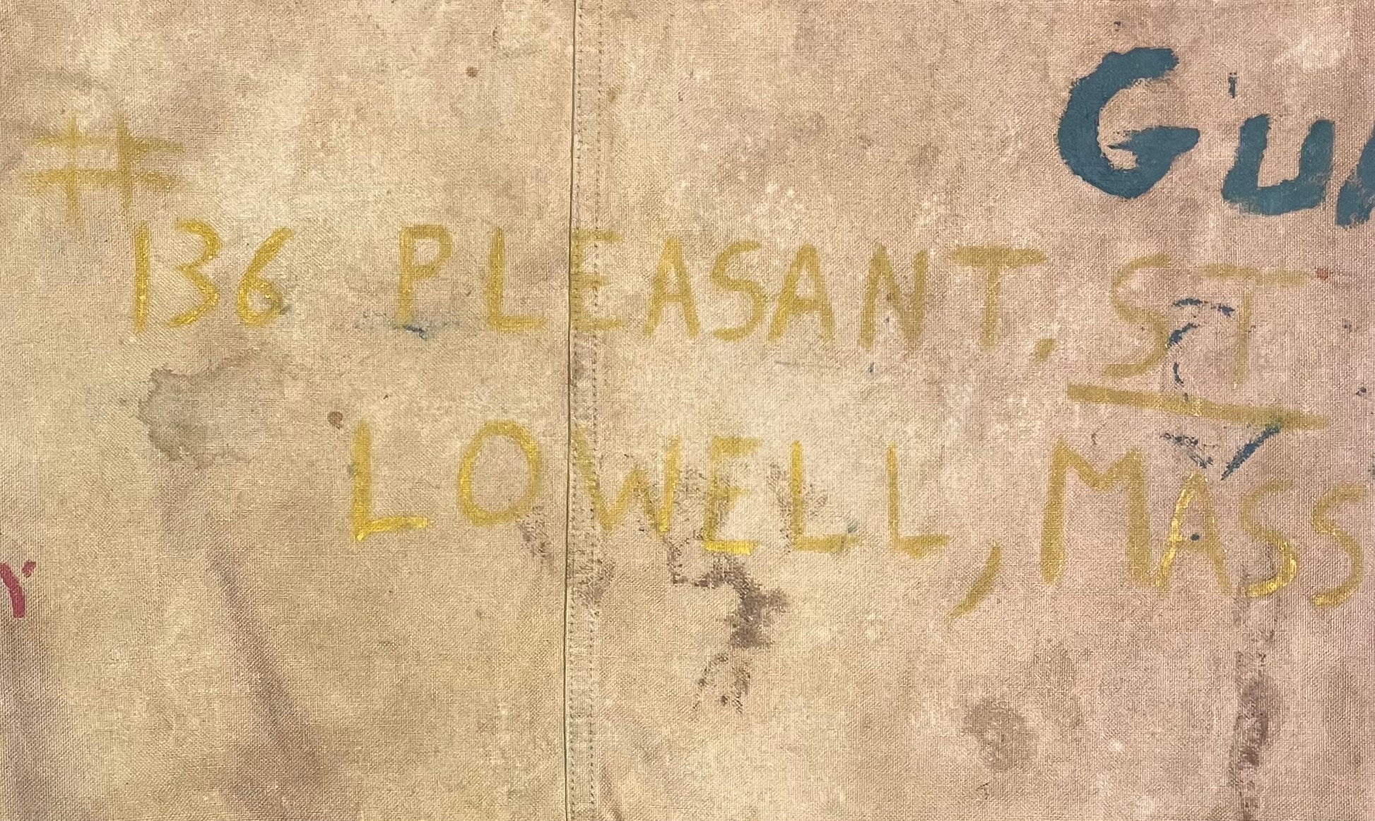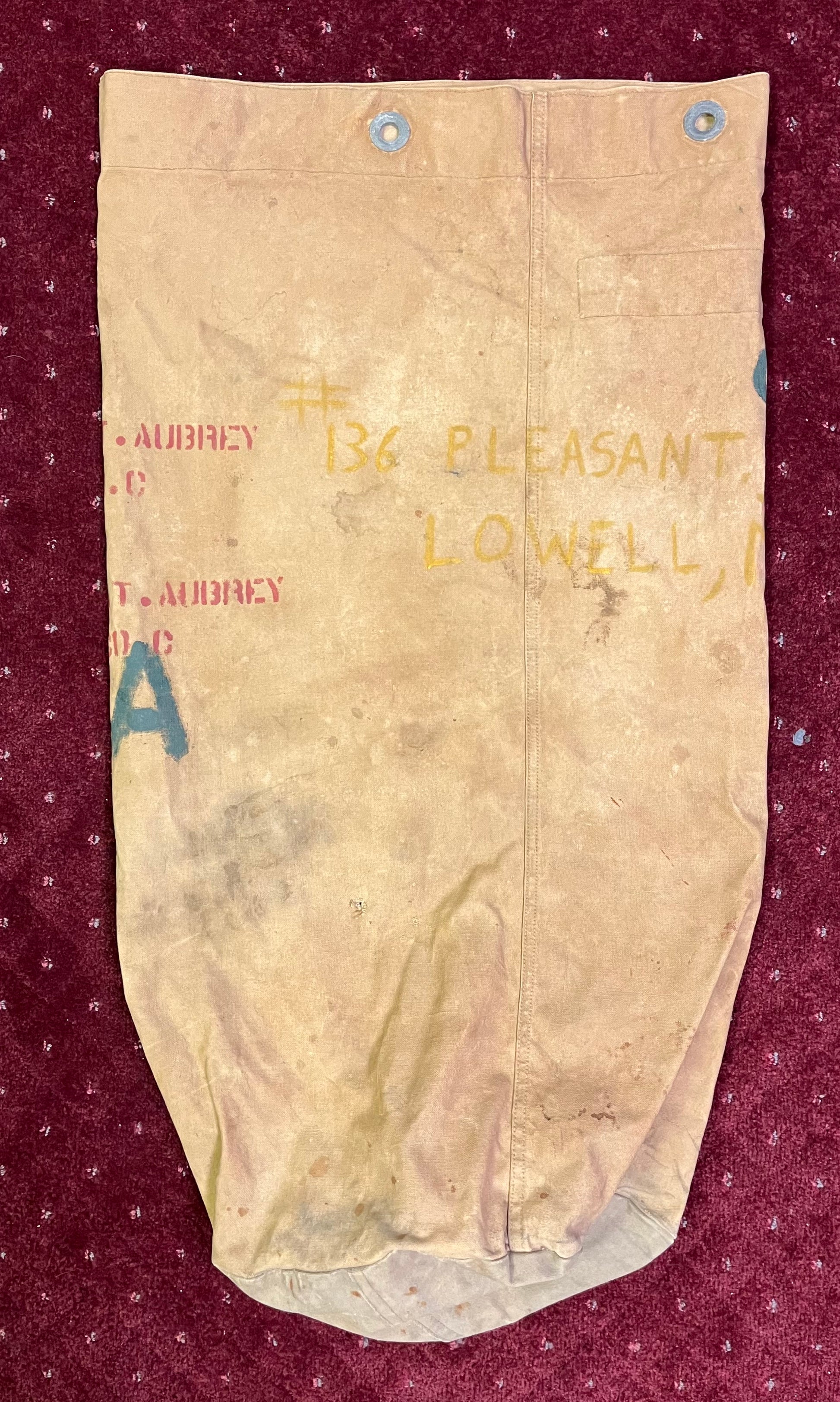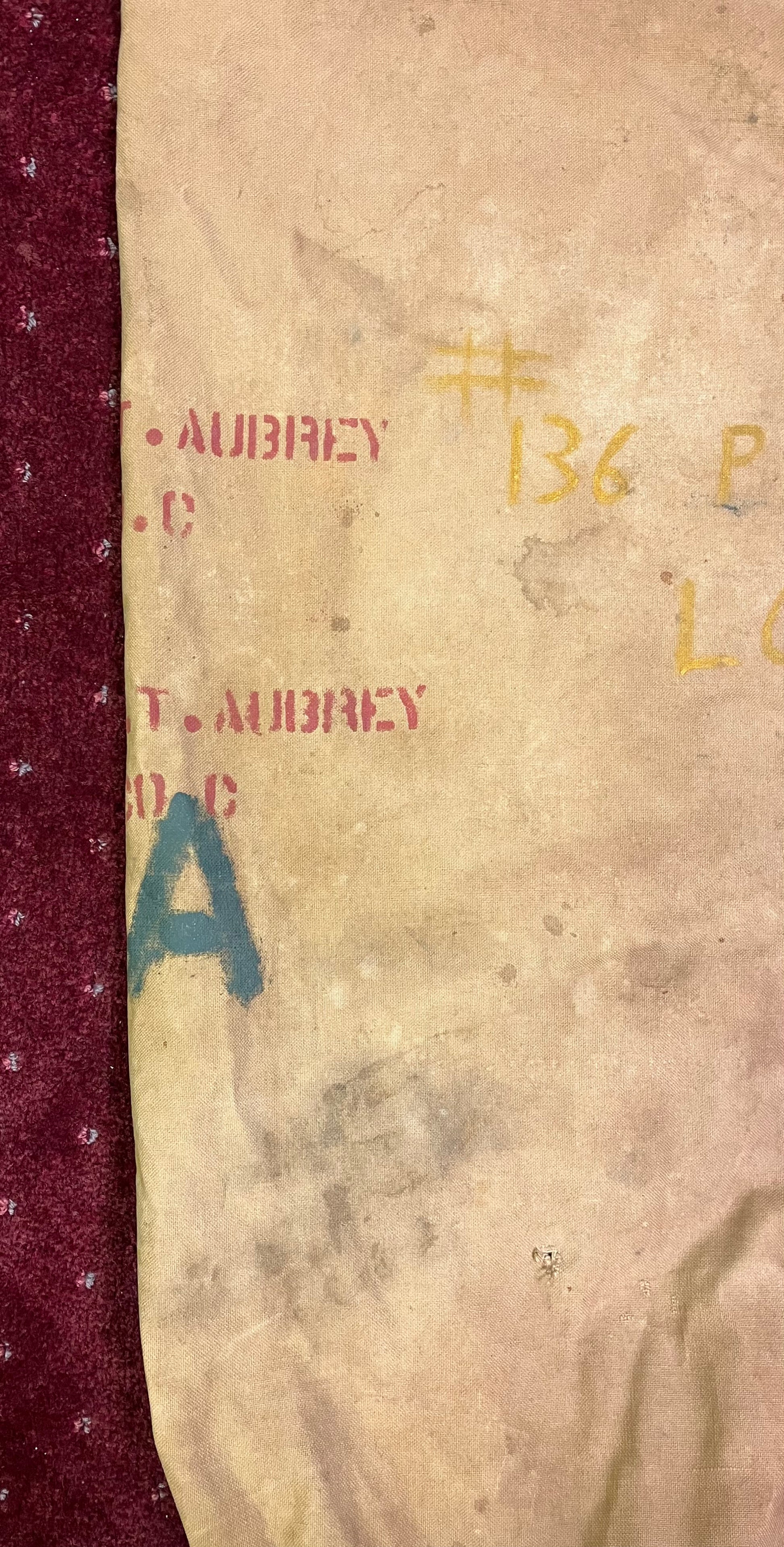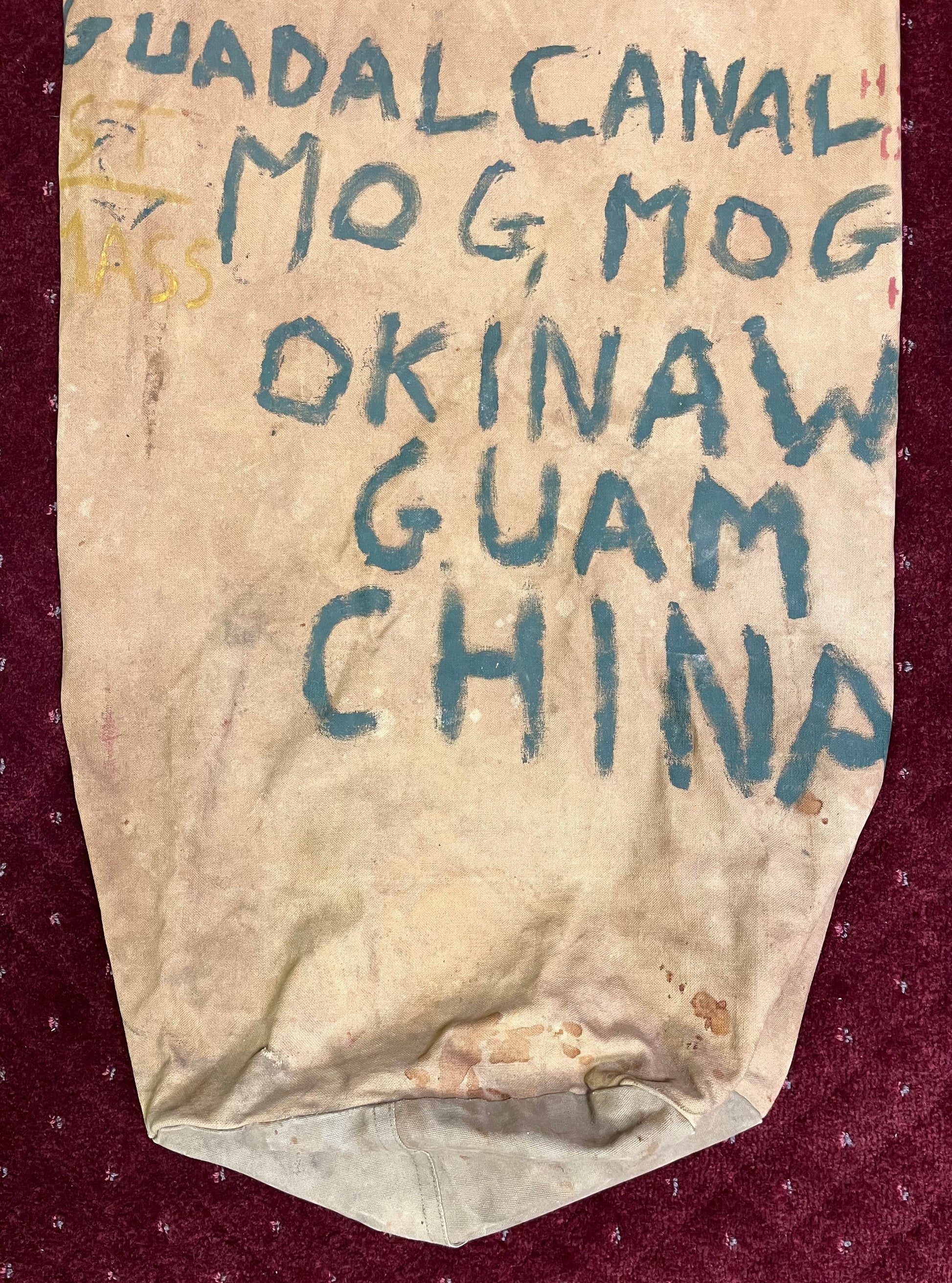 WW2 USMC Duffel Bag / Seabag / Painted & Named / Harold T. Aubrey (6th Marine Division - 6th Mortar T.) 136 Pleasant St Lowell, MA (On bag) Painted with battle locations