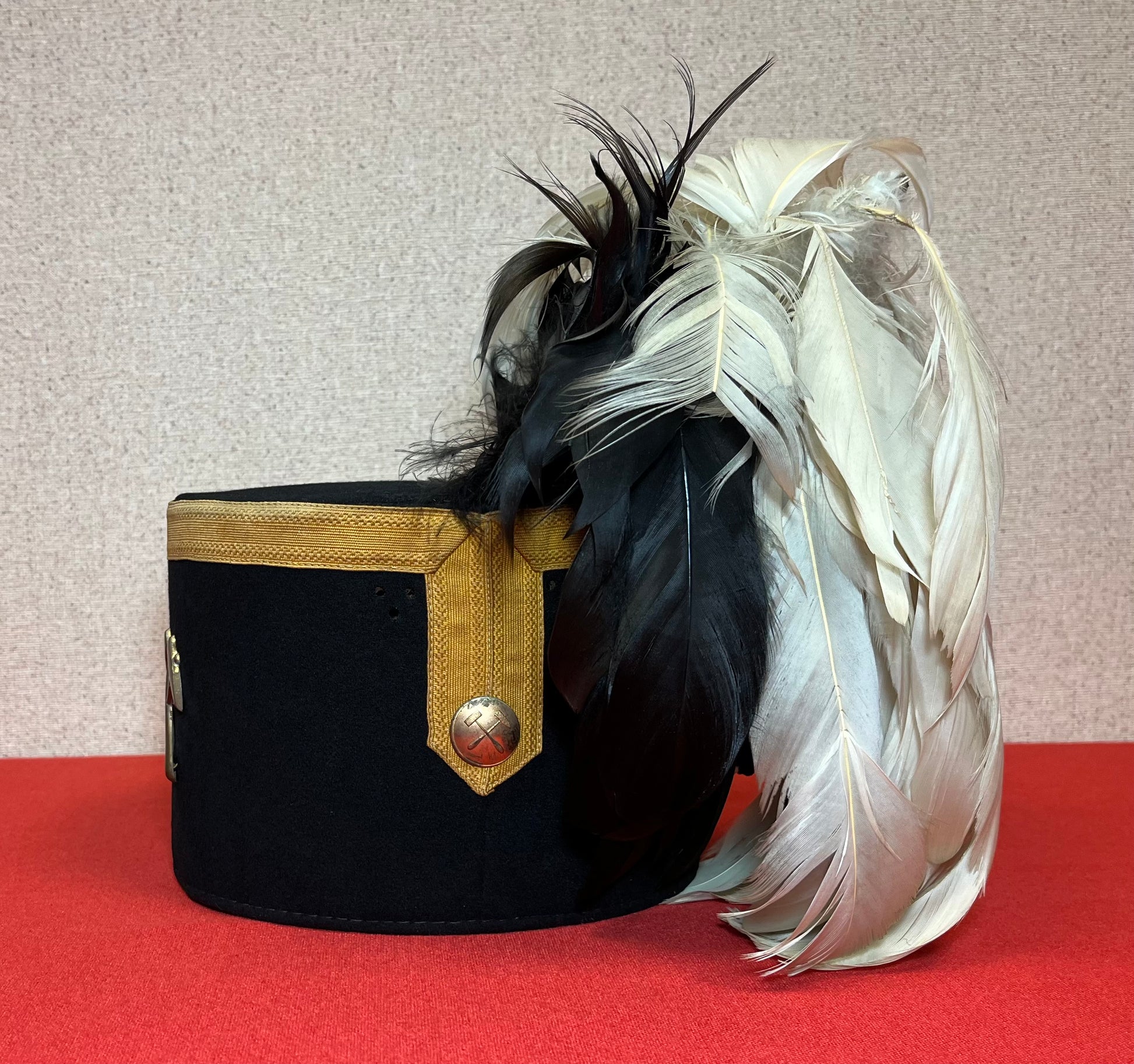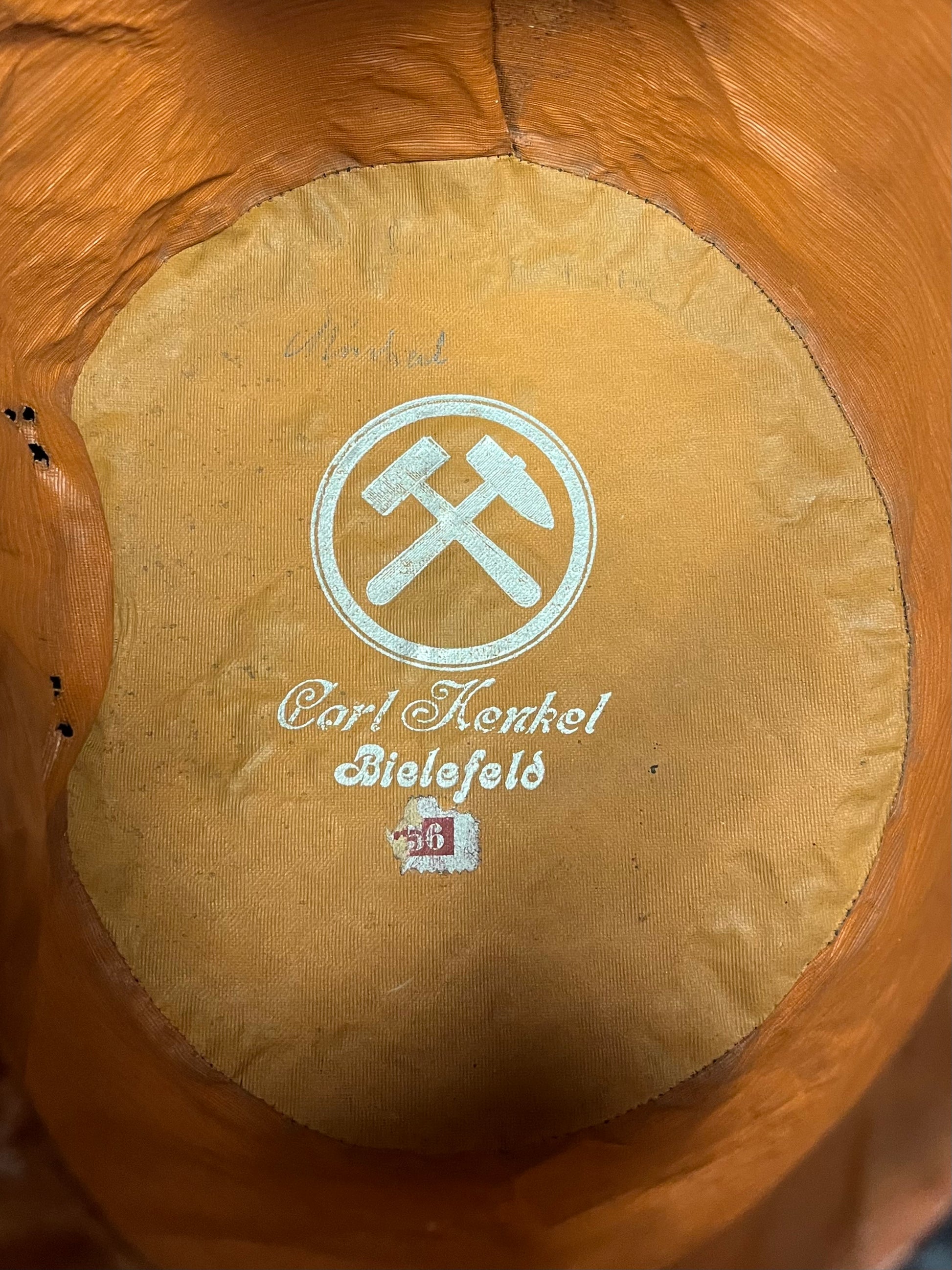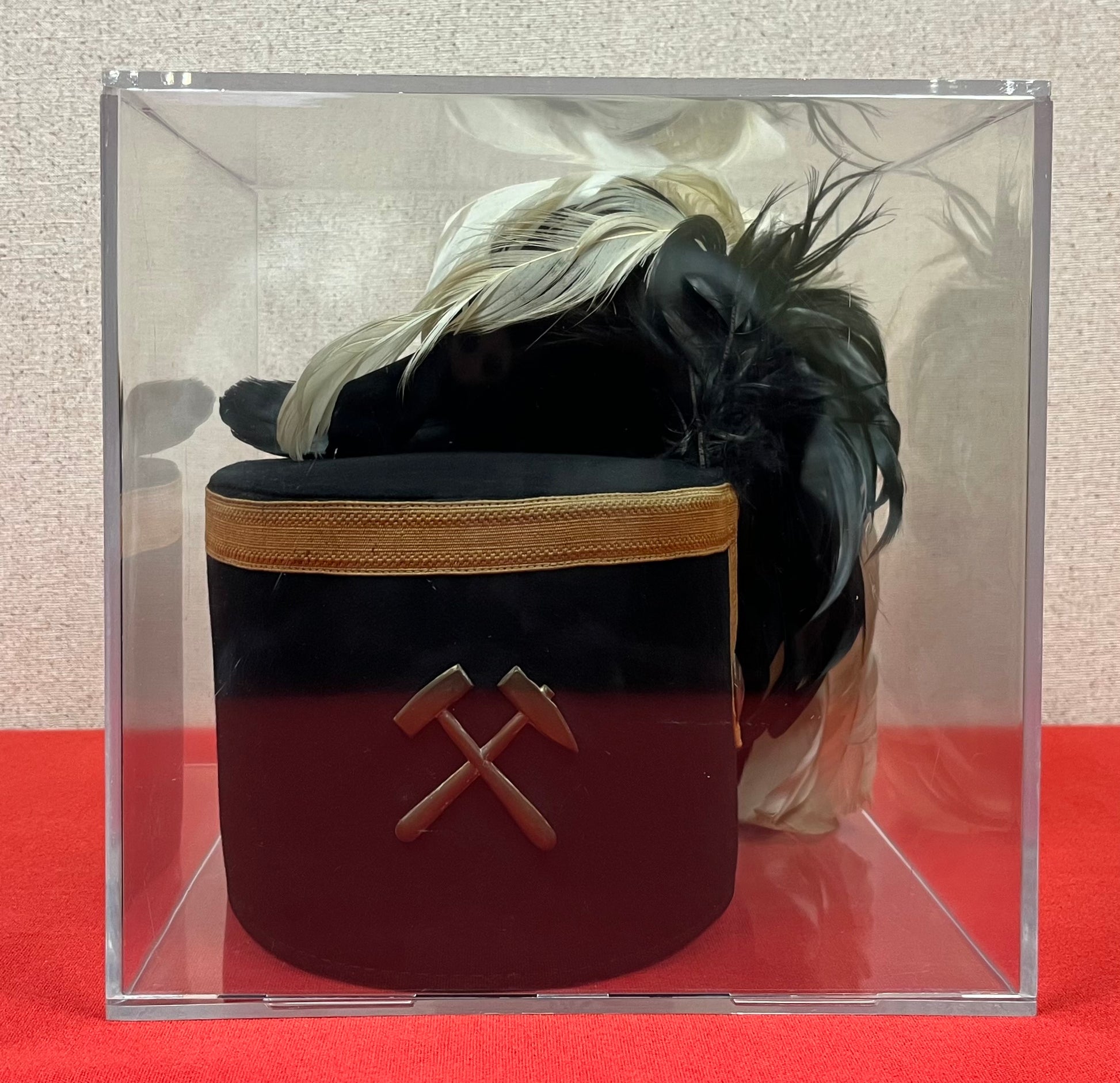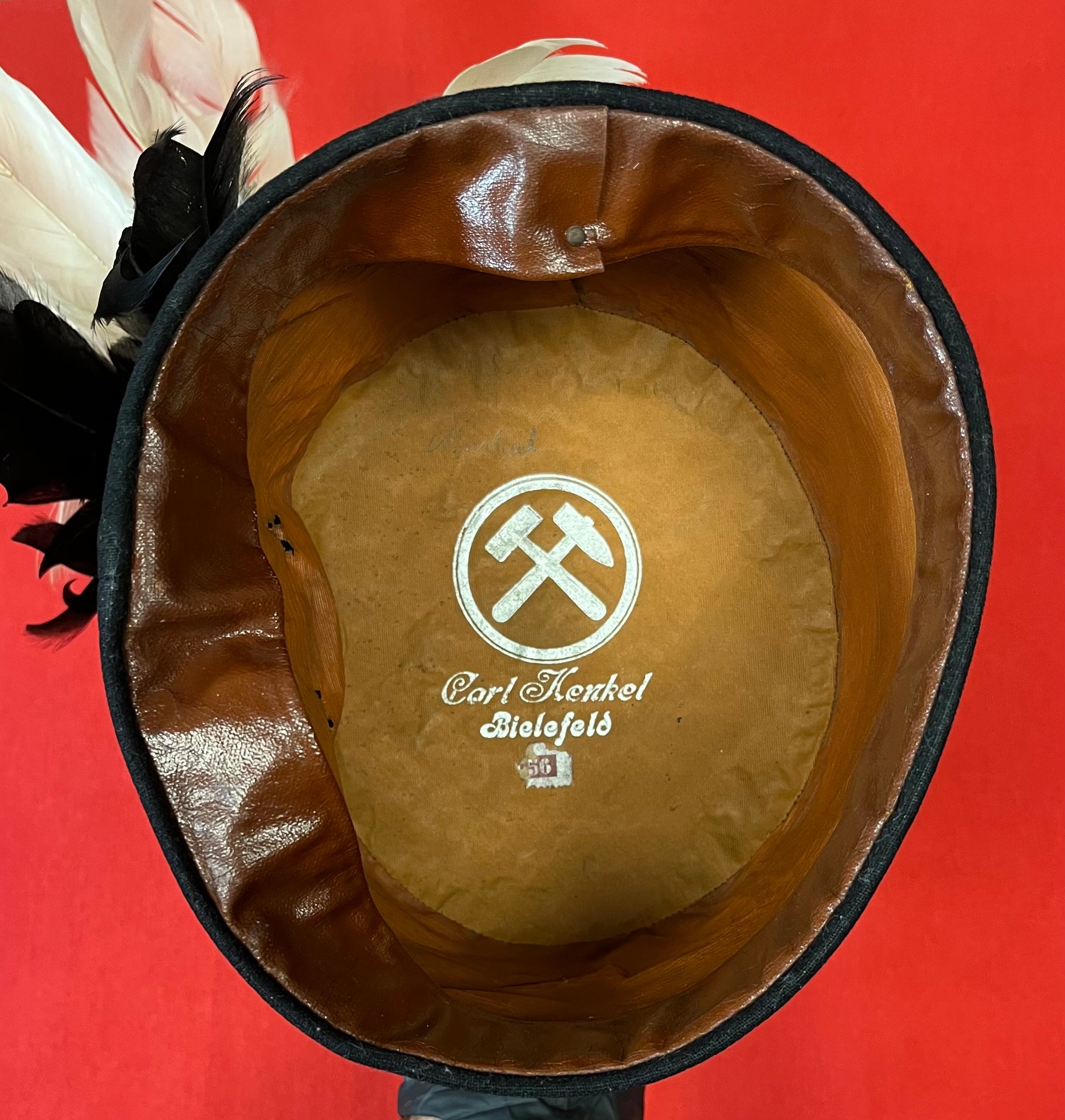 THIS BEAUTIFUL WWI ERA (1914-1918) GERMAN MINERS PARADE HAT IS WITHOUT A DOUBT ONE OF THE MOST DIFFICULT ITEMS TO FIND. FANTASTIC CONDITION, ORIGINAL BLACK & WHITE FEATHERS STILL ATTACHED. MAKER MARKED ON THE INSIDE…CARL HENKEL / BIELEFELD, GERMANY / SIZE 56 / THE PRUSSIAN COAL MINERS LOGO (CROSSED HAMMERS) IS EMBOSSED ABOVE THE MAKERS NAME / COMES WITH DISPLAY CASE